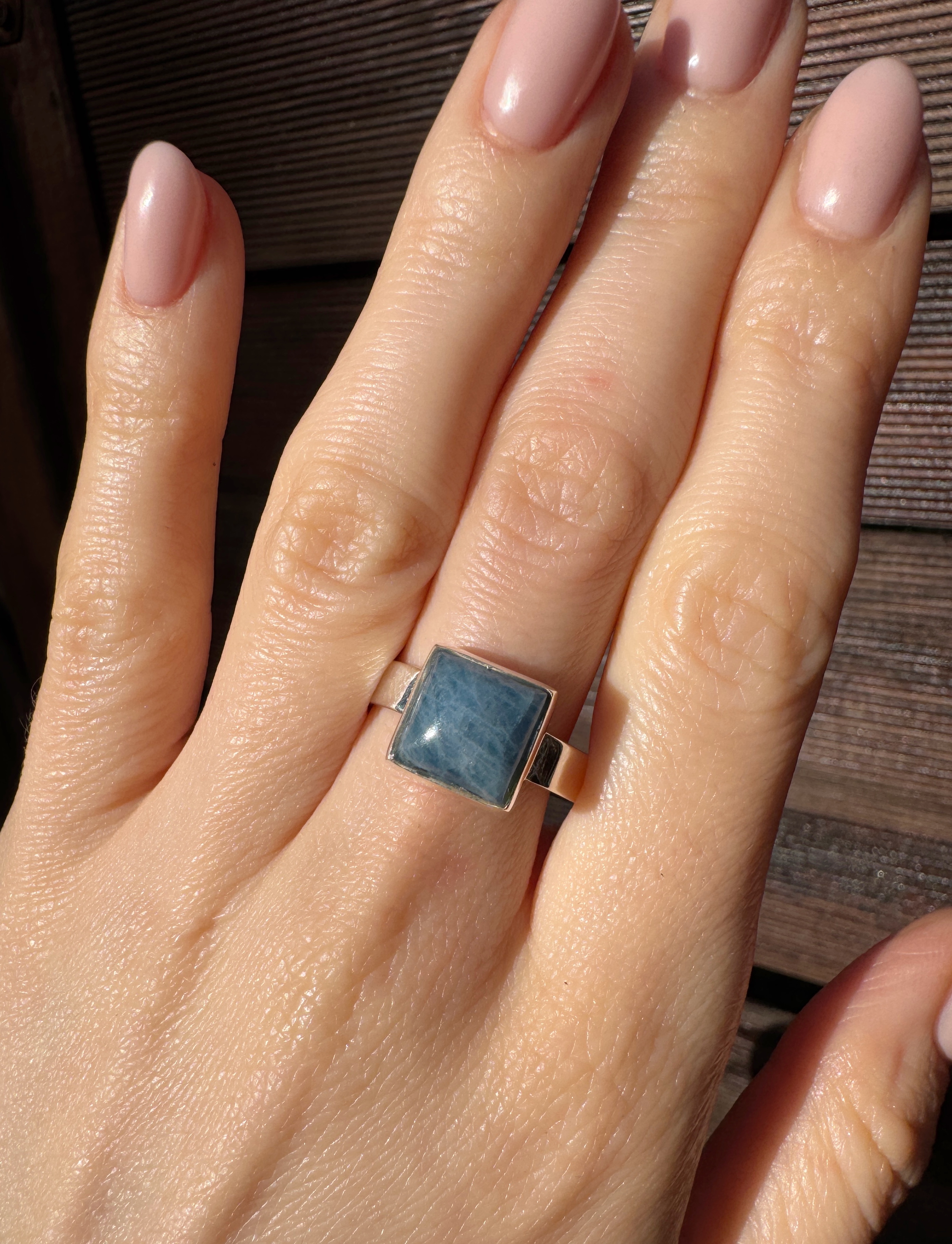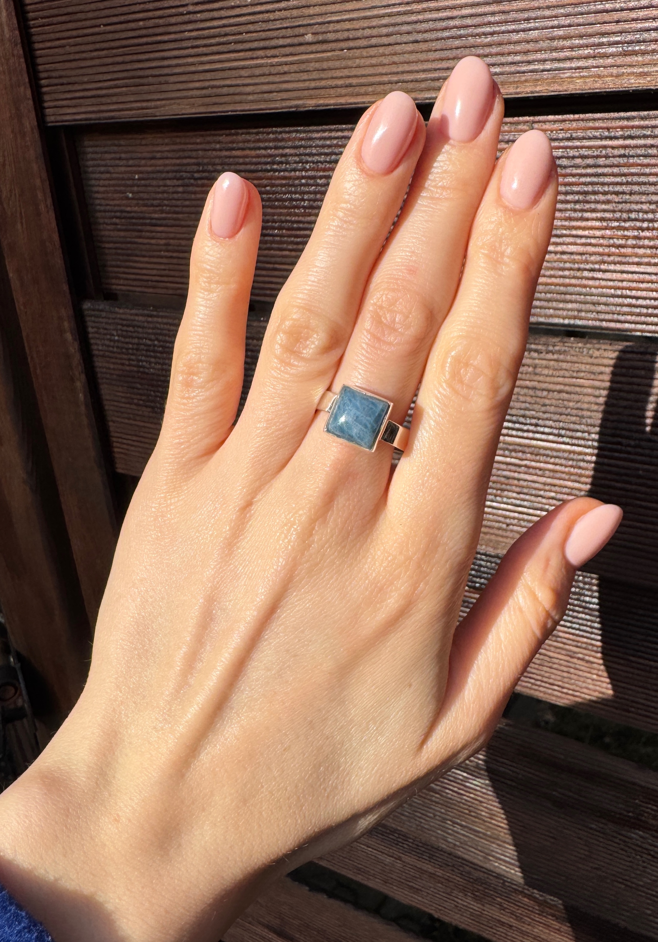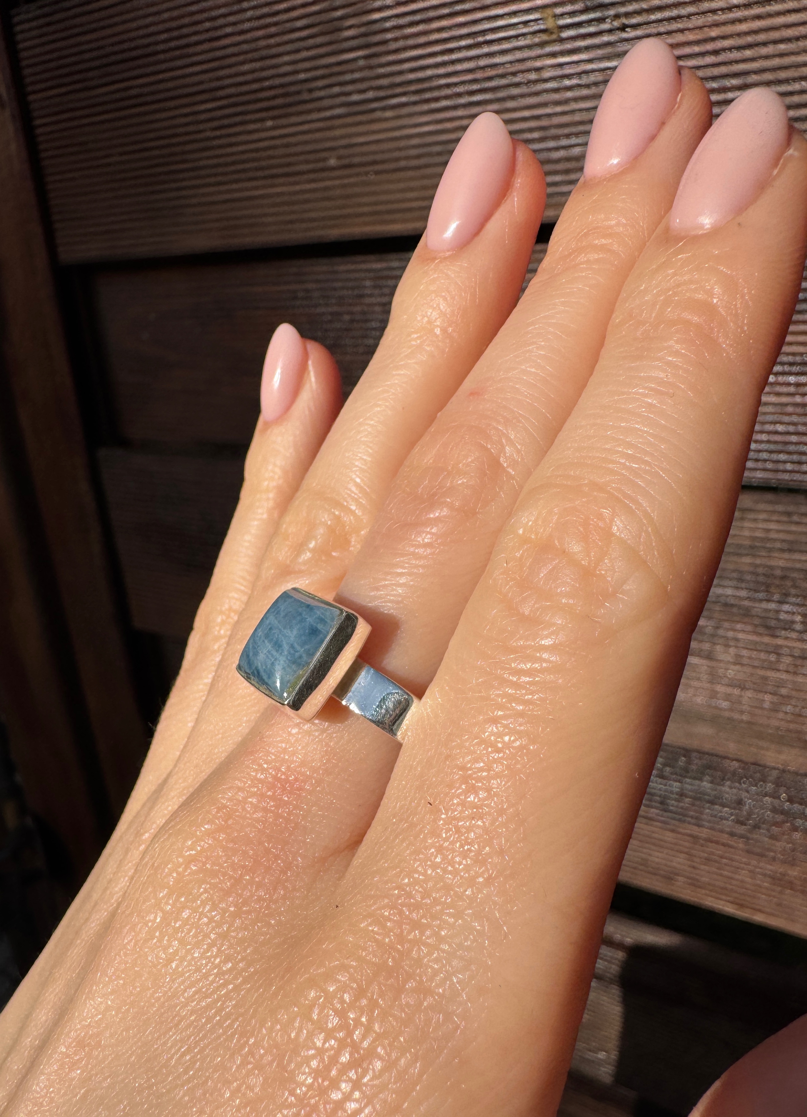 Ręcznie wykonany pierścionek z błękitnym, surowym akwamarynem i srebrem pr.925