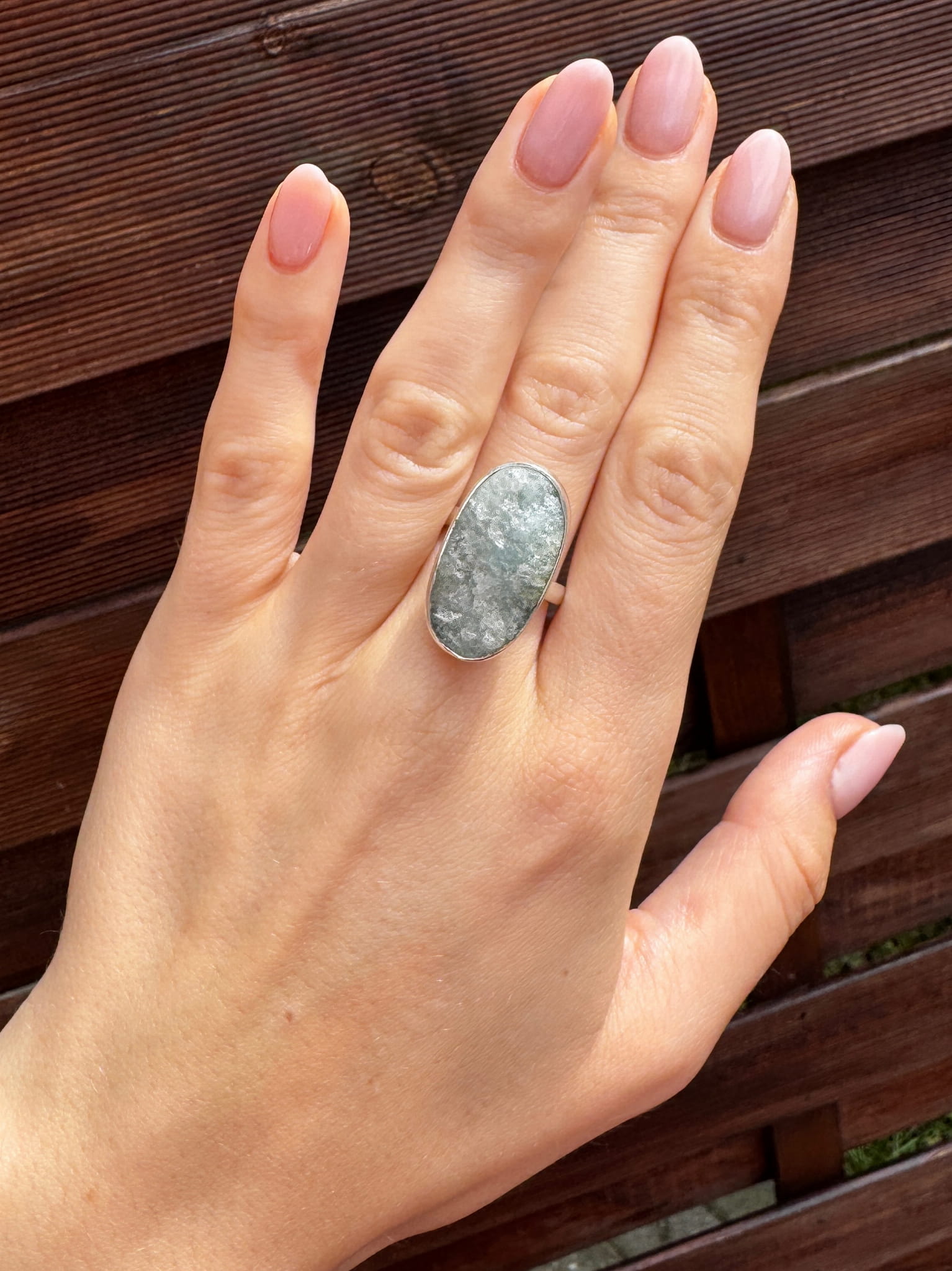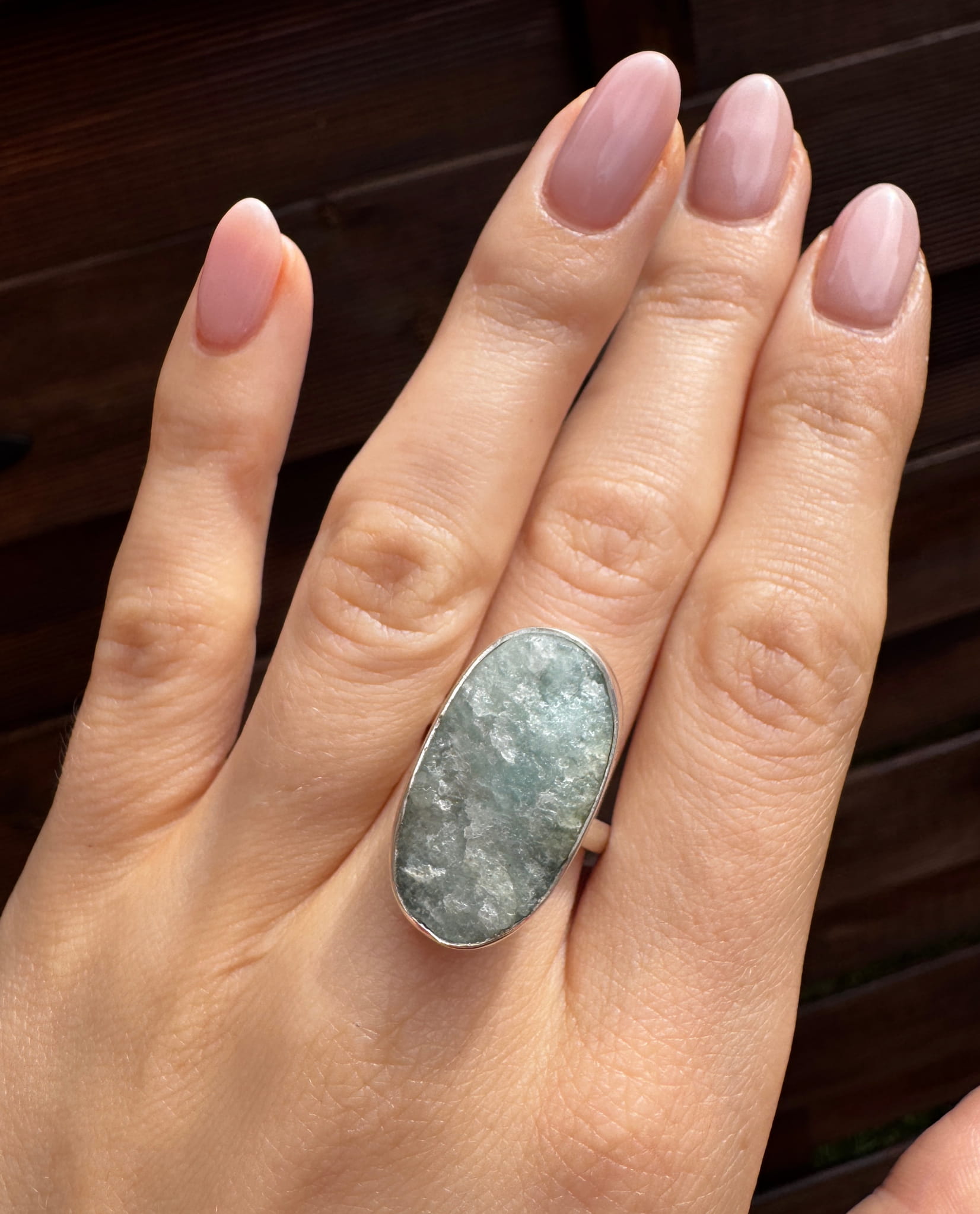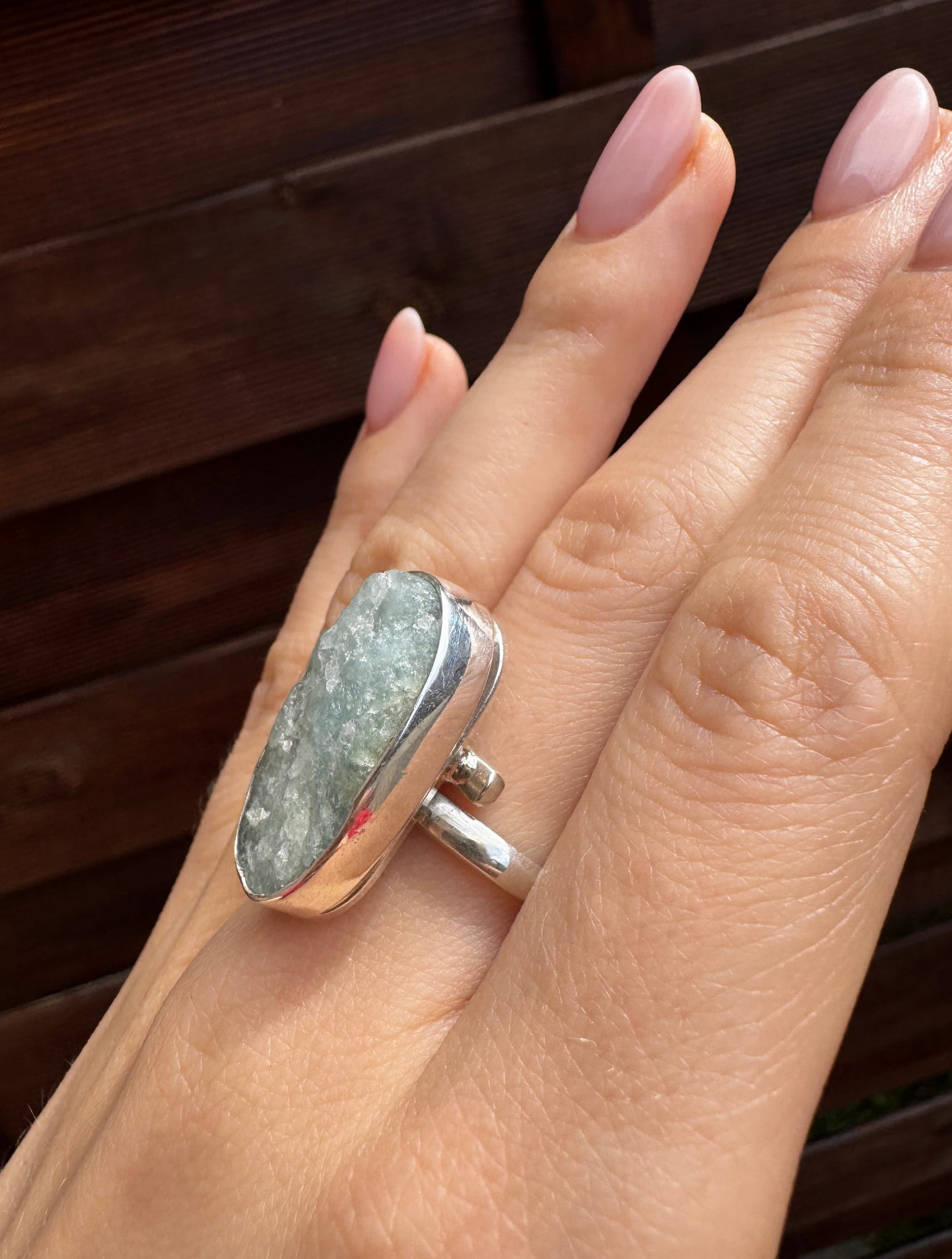Ręcznie wykonany pierścionek z błękitnym, surowym akwamarynem i srebrem pr.925