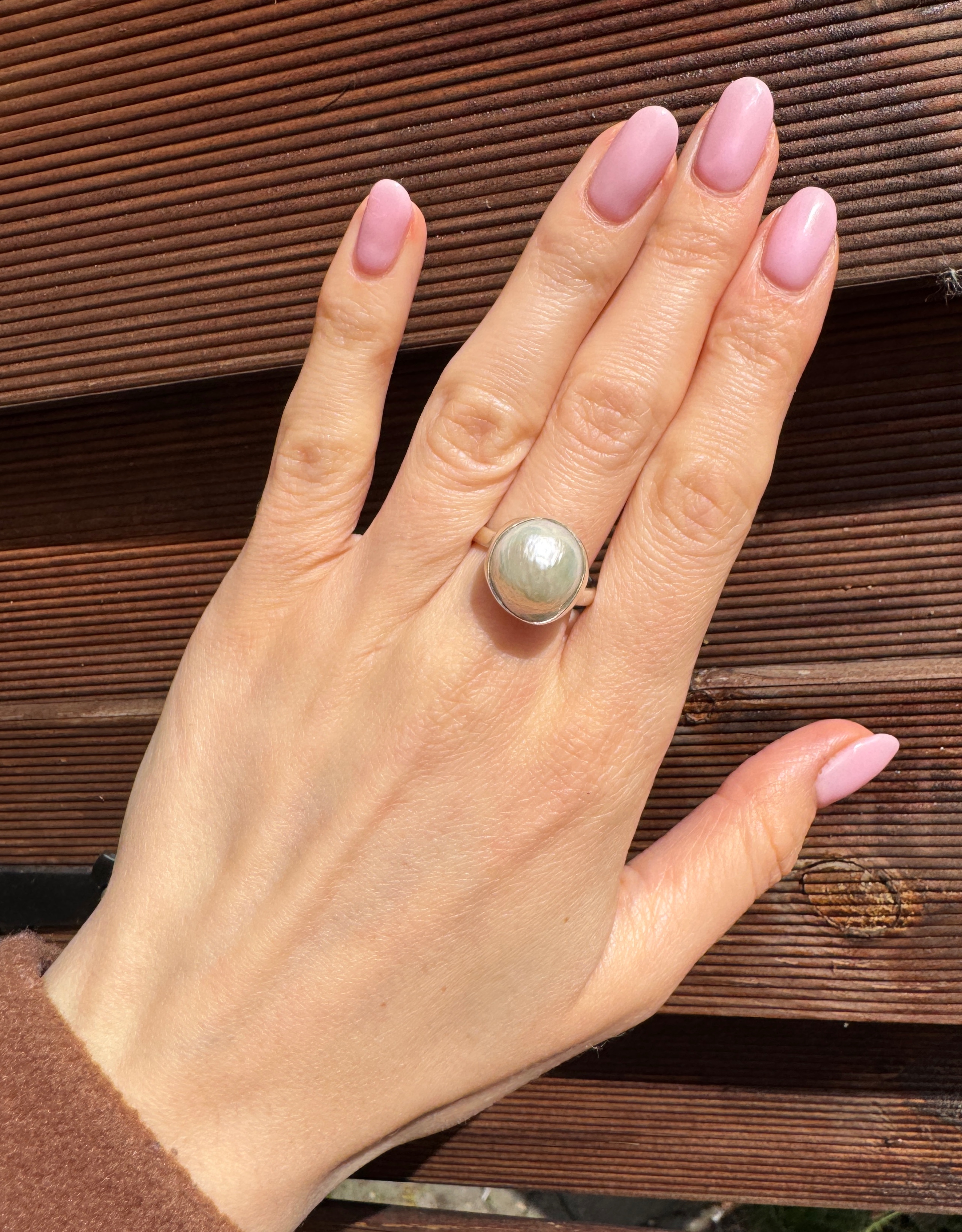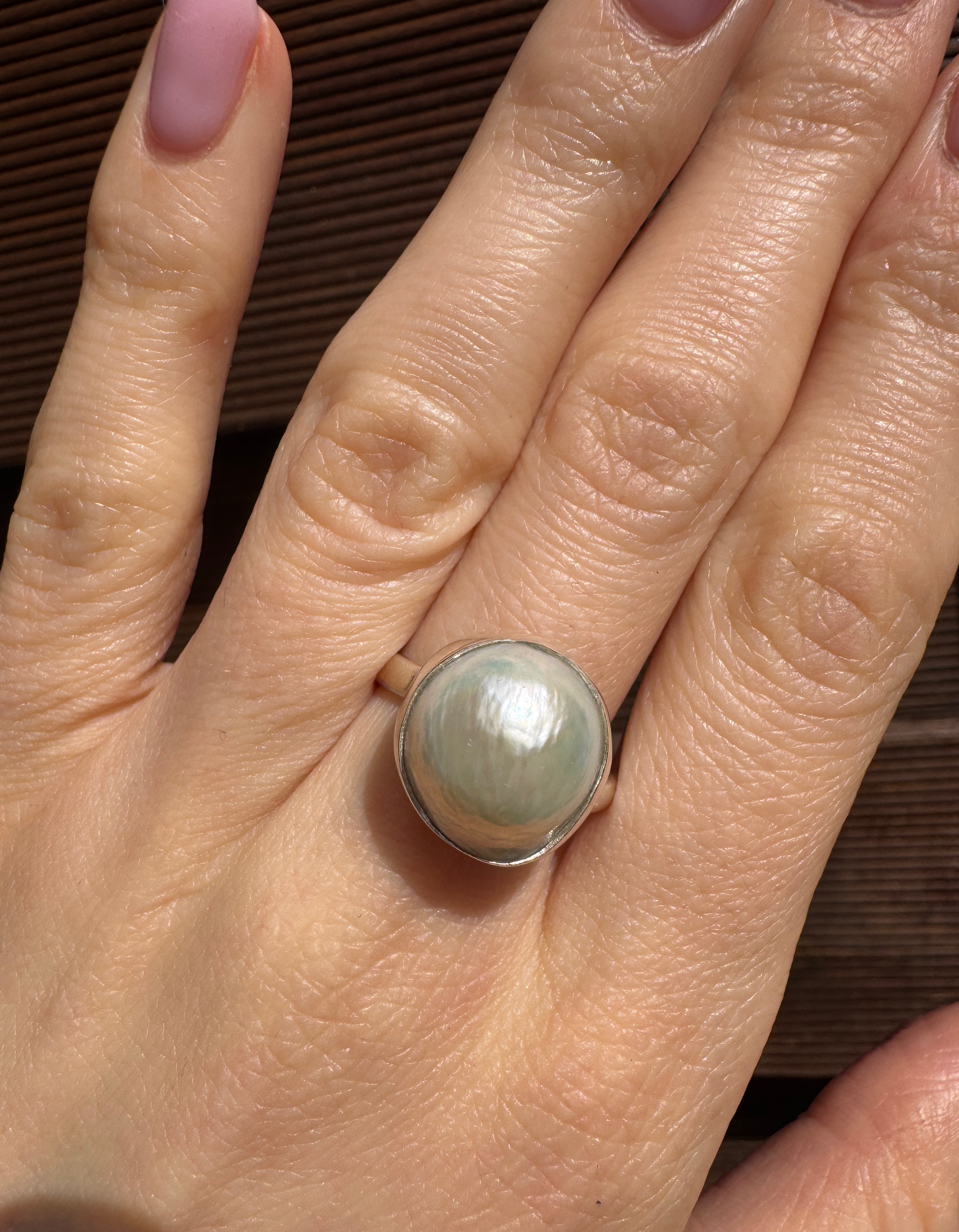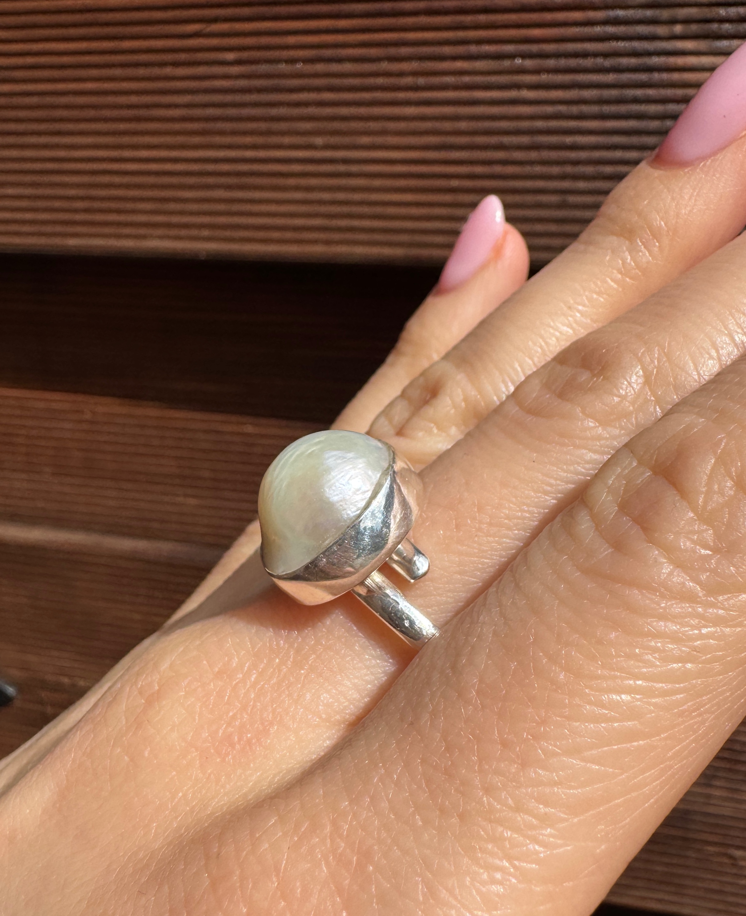 Ręcznie wykonany pierścionek z białej   perły hodowlanej i srebra pr.925.