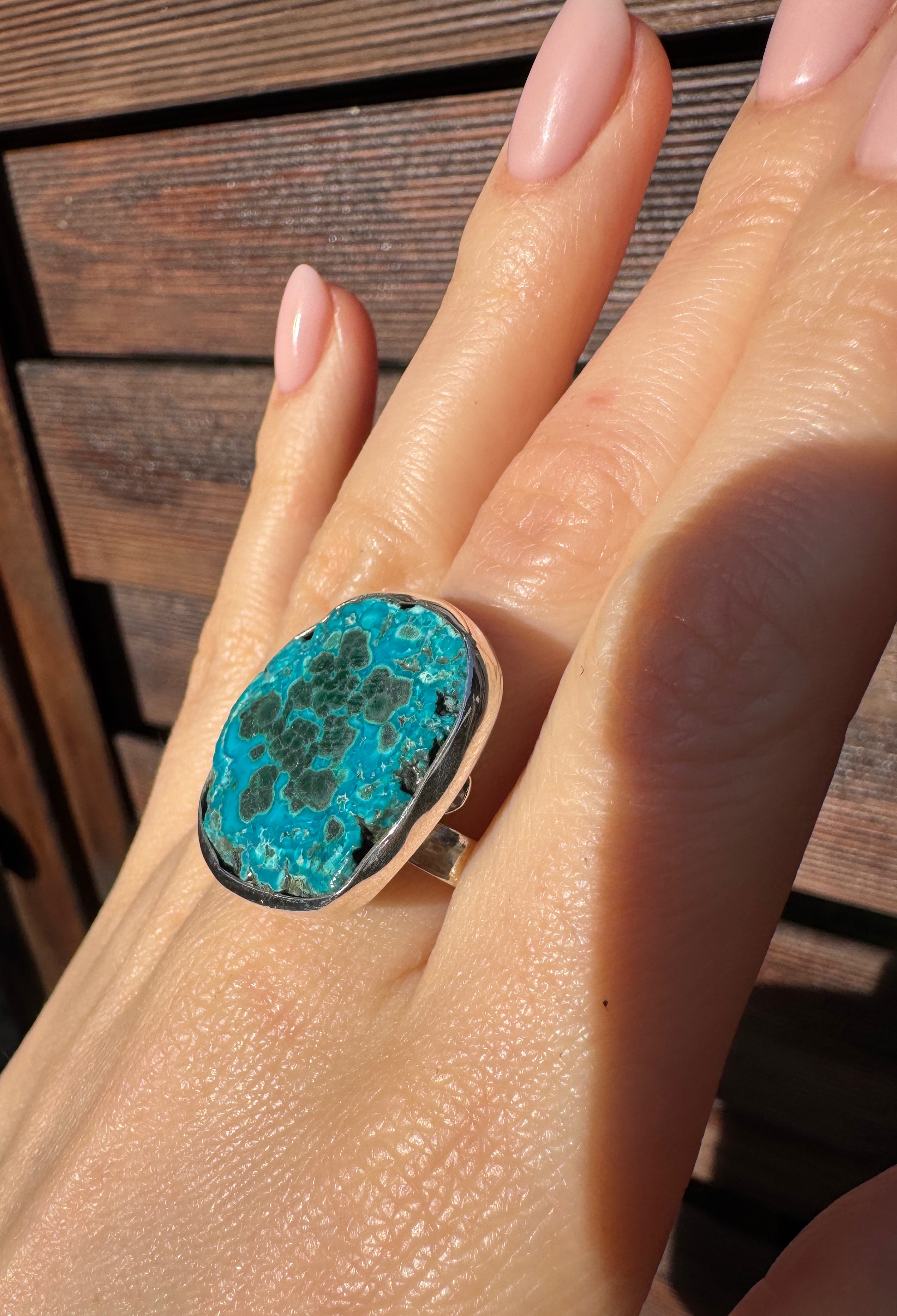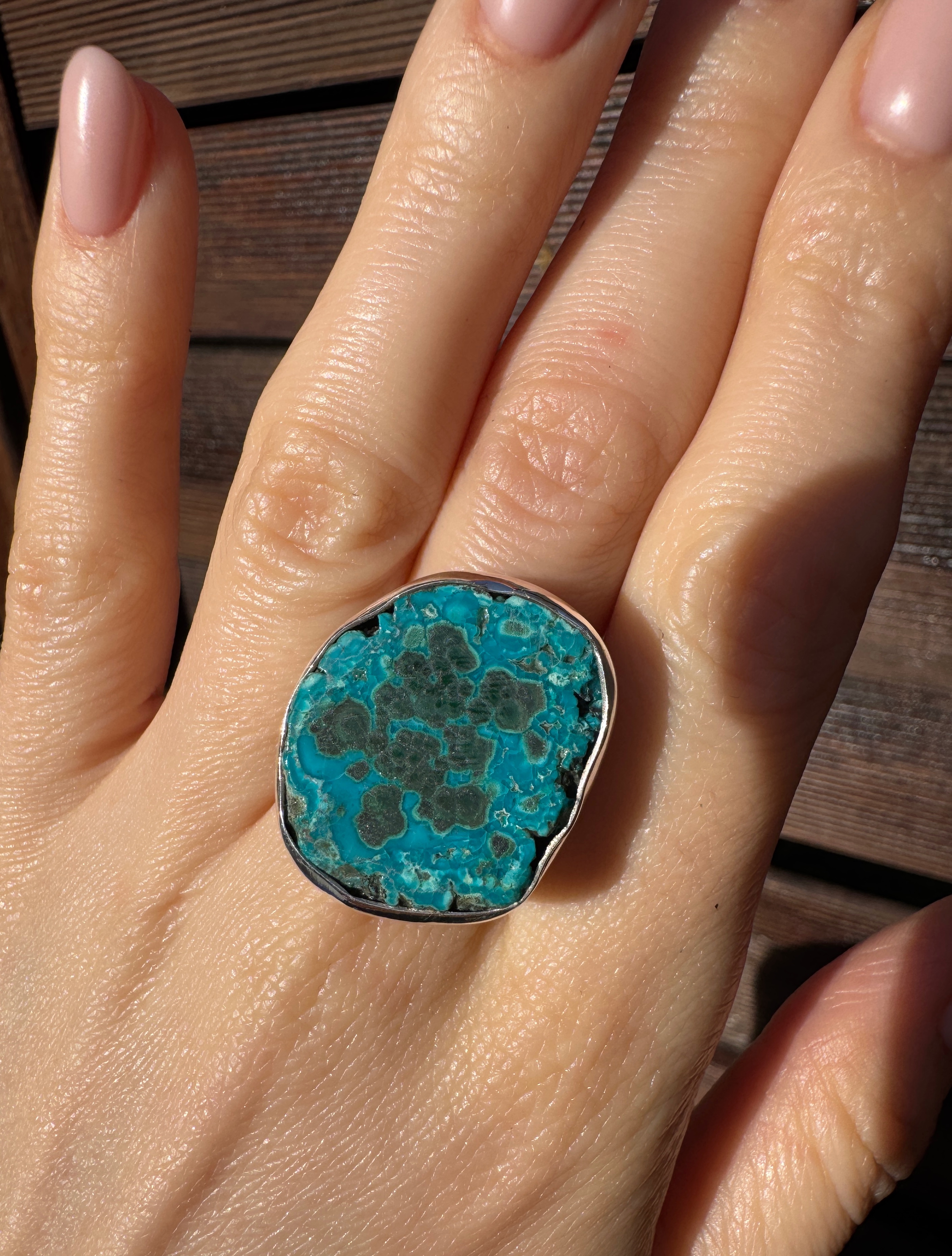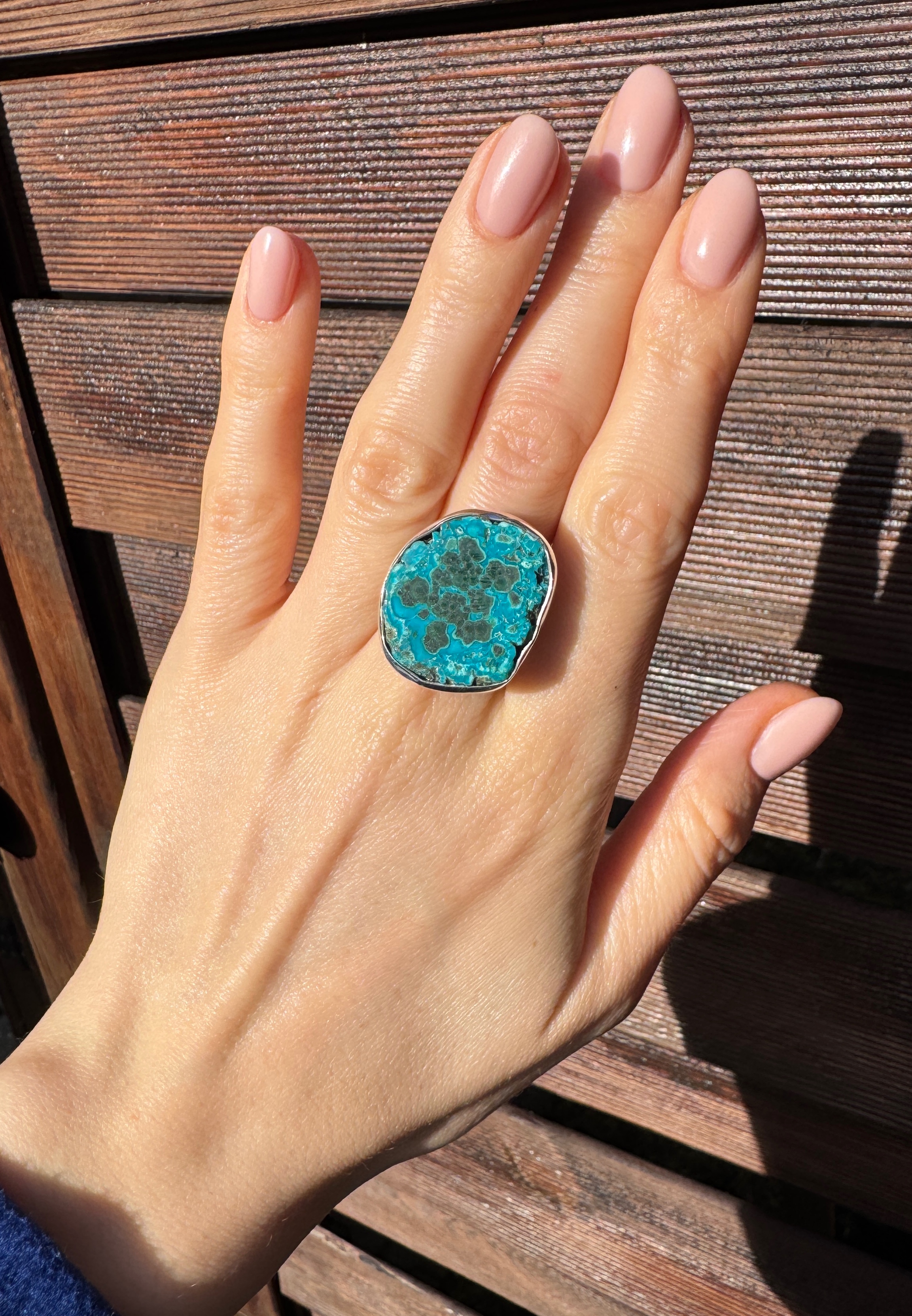 Ręcznie wykonany pierścionek z pięknej chryzokoli z malachitem i srebra pr.925