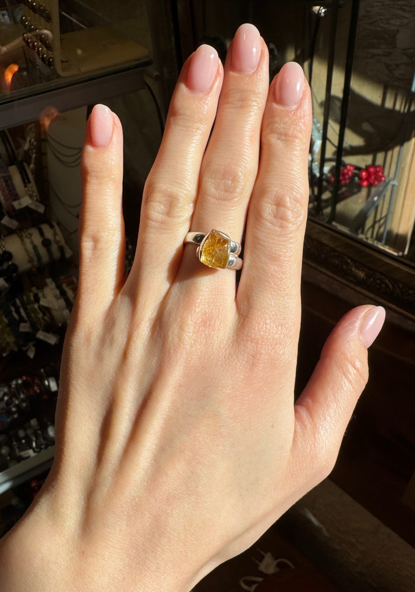 Ręcznie wykonany pierścionek z surowego, nieoszlifowanego cytrynu i srebra pr.925