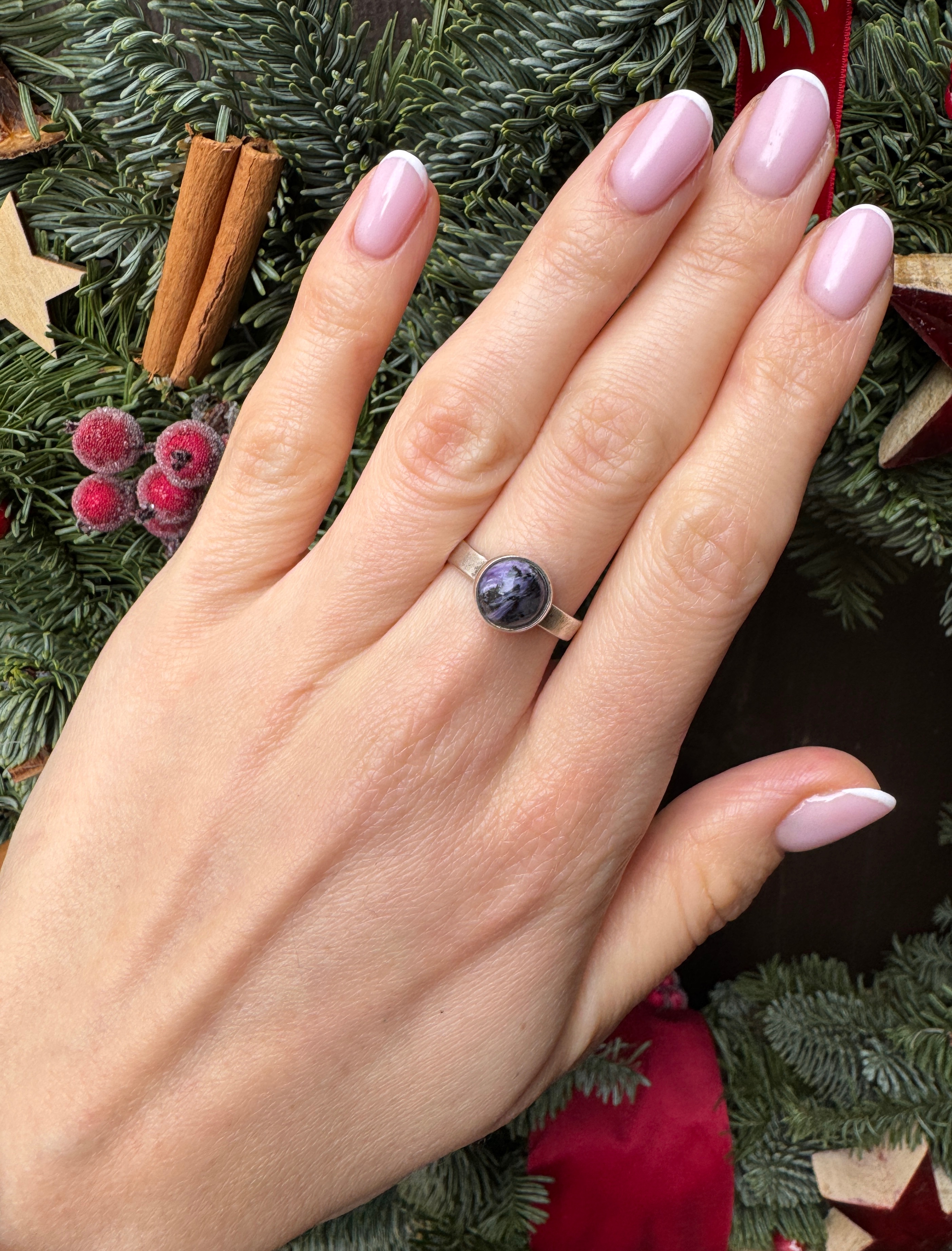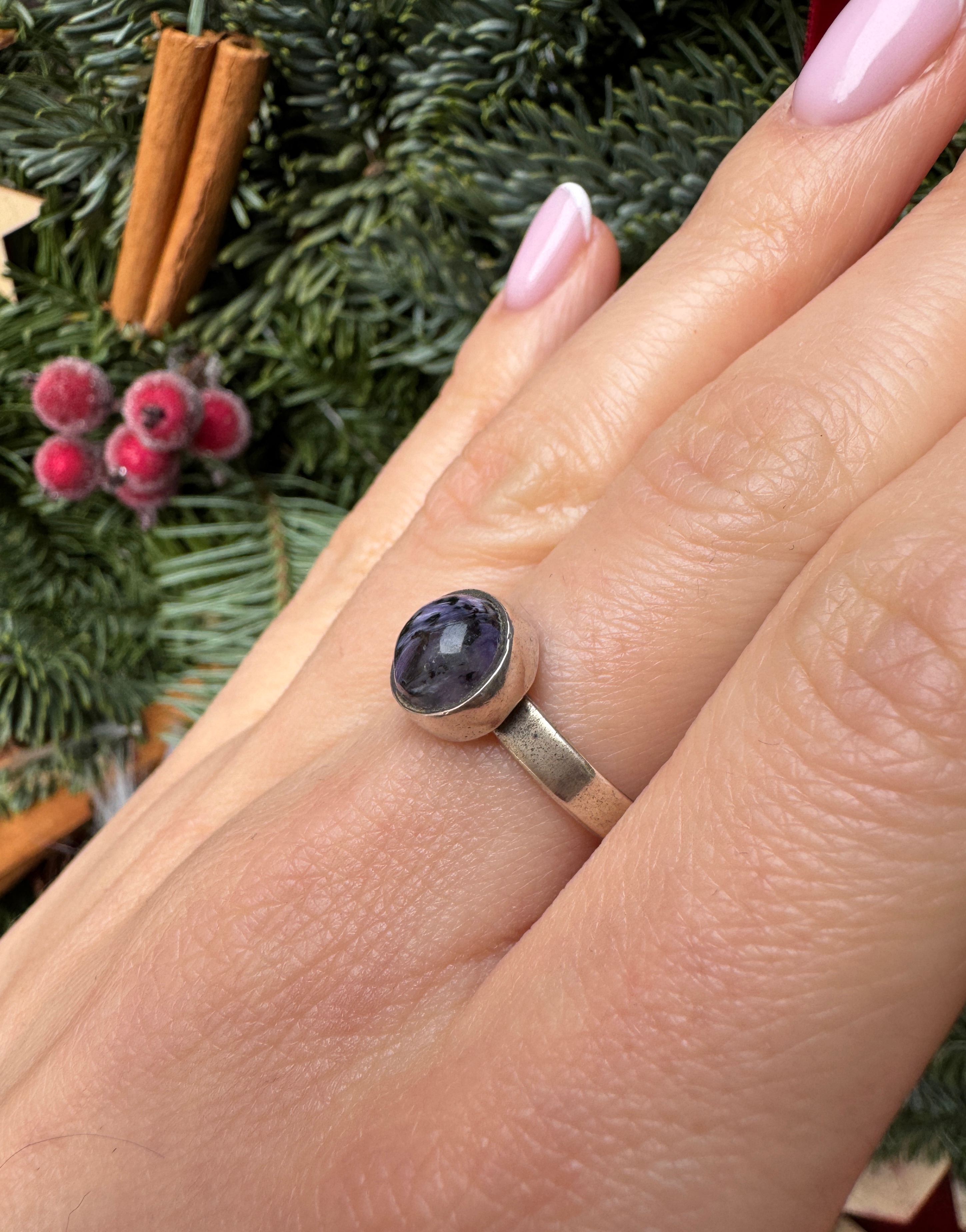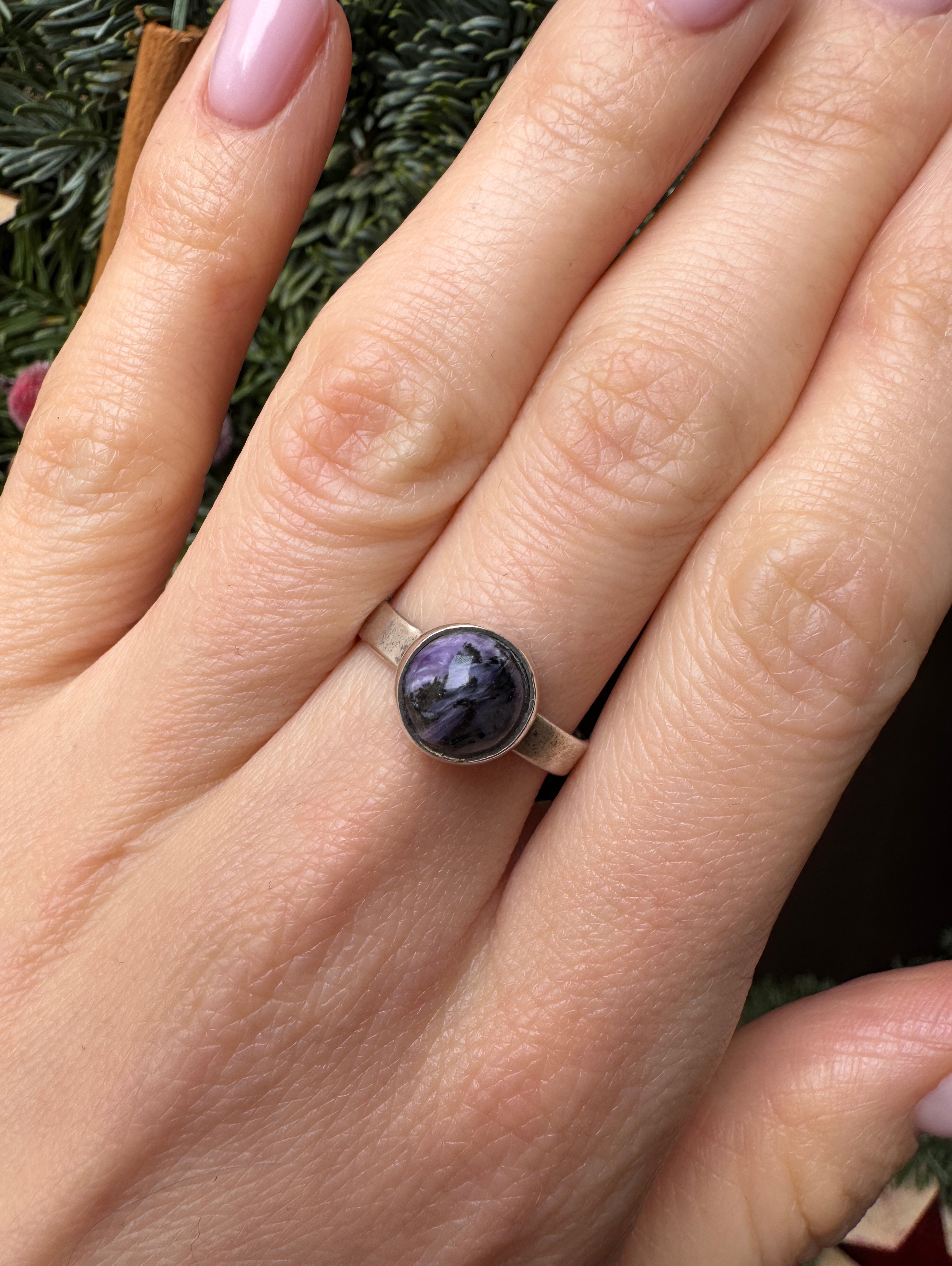Ręcznie wykonany pierścionek z kuleczki czaroitu i srebra pr.925