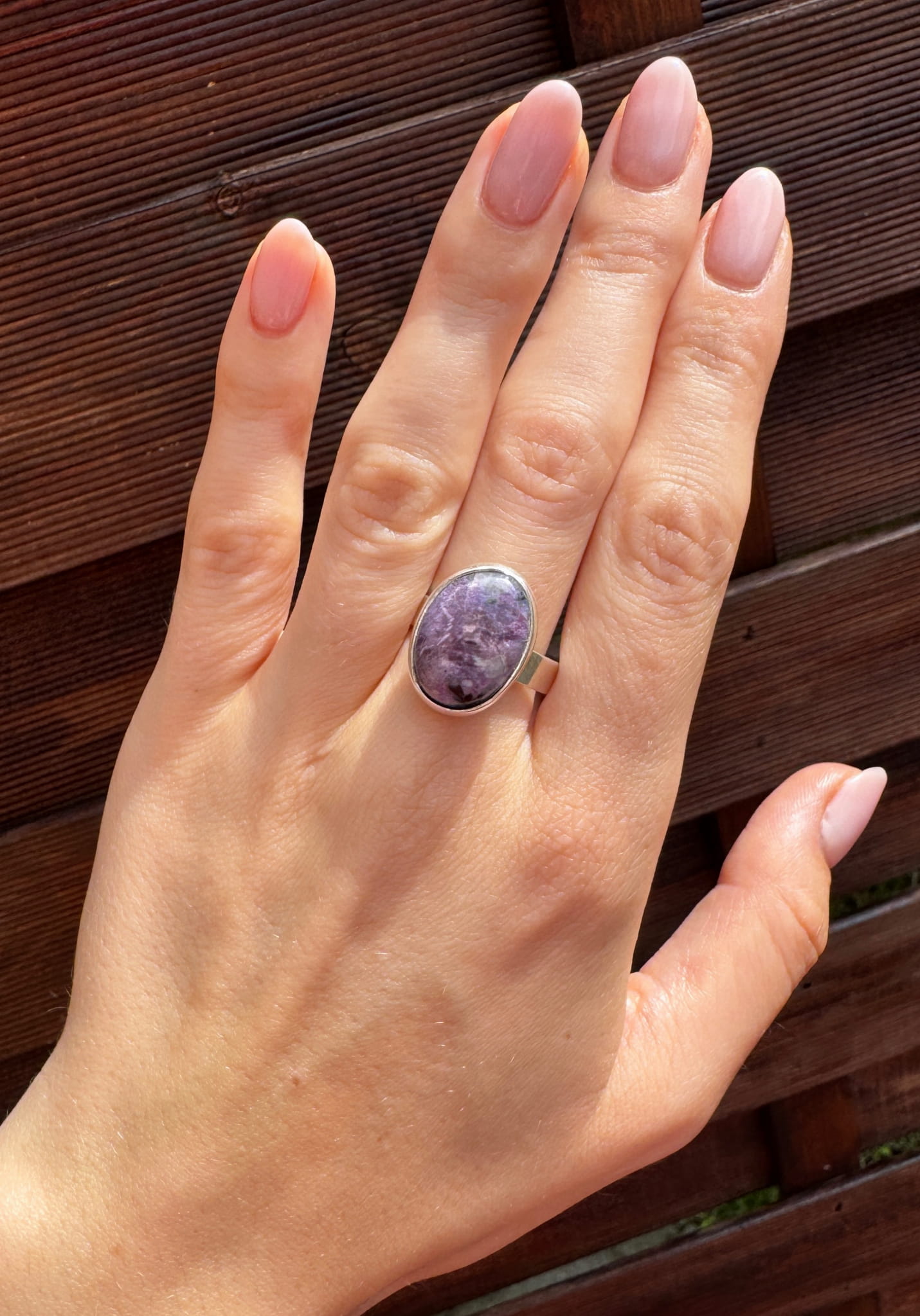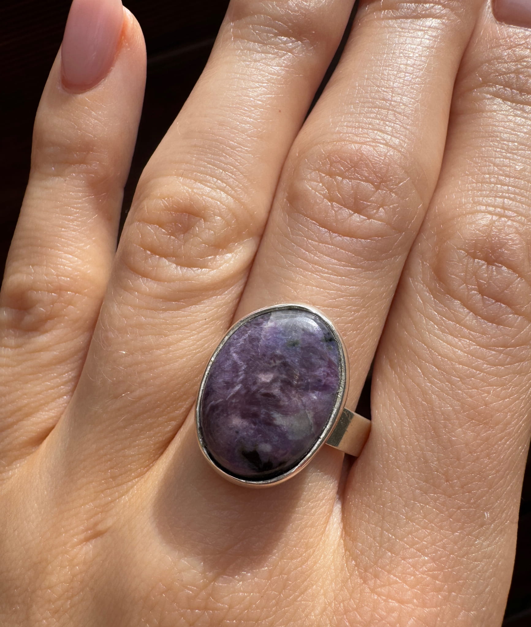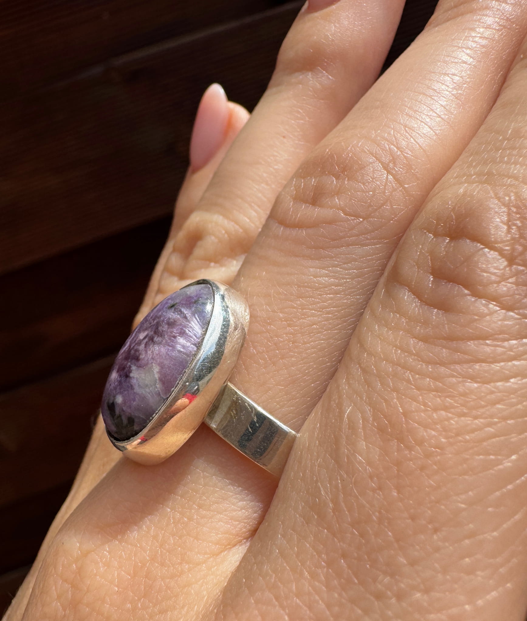 Ręcznie wykonany pierścionek z czaroitu i srebra pr.925