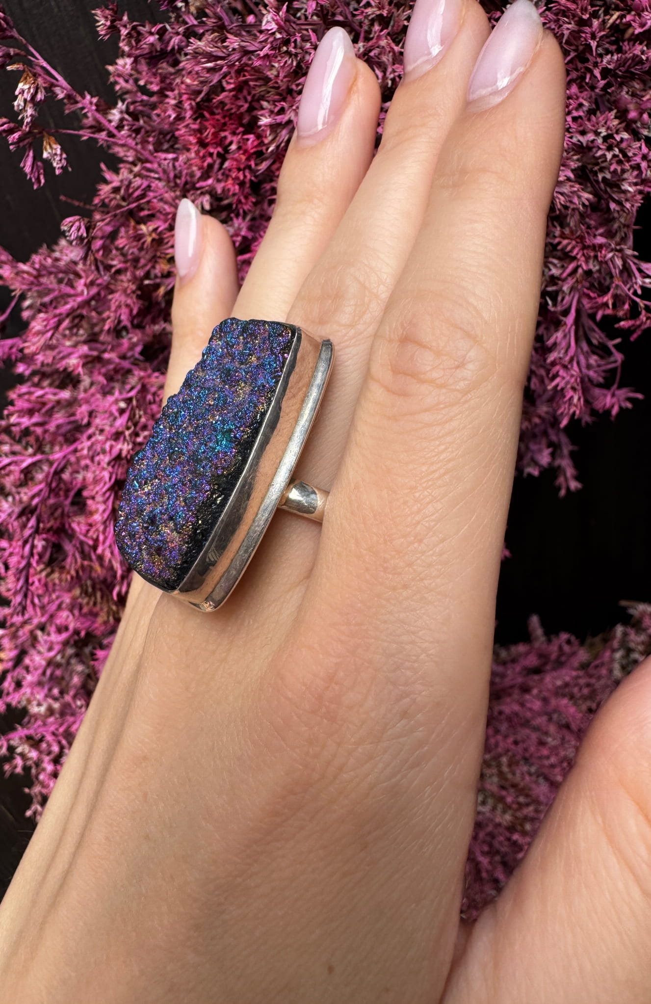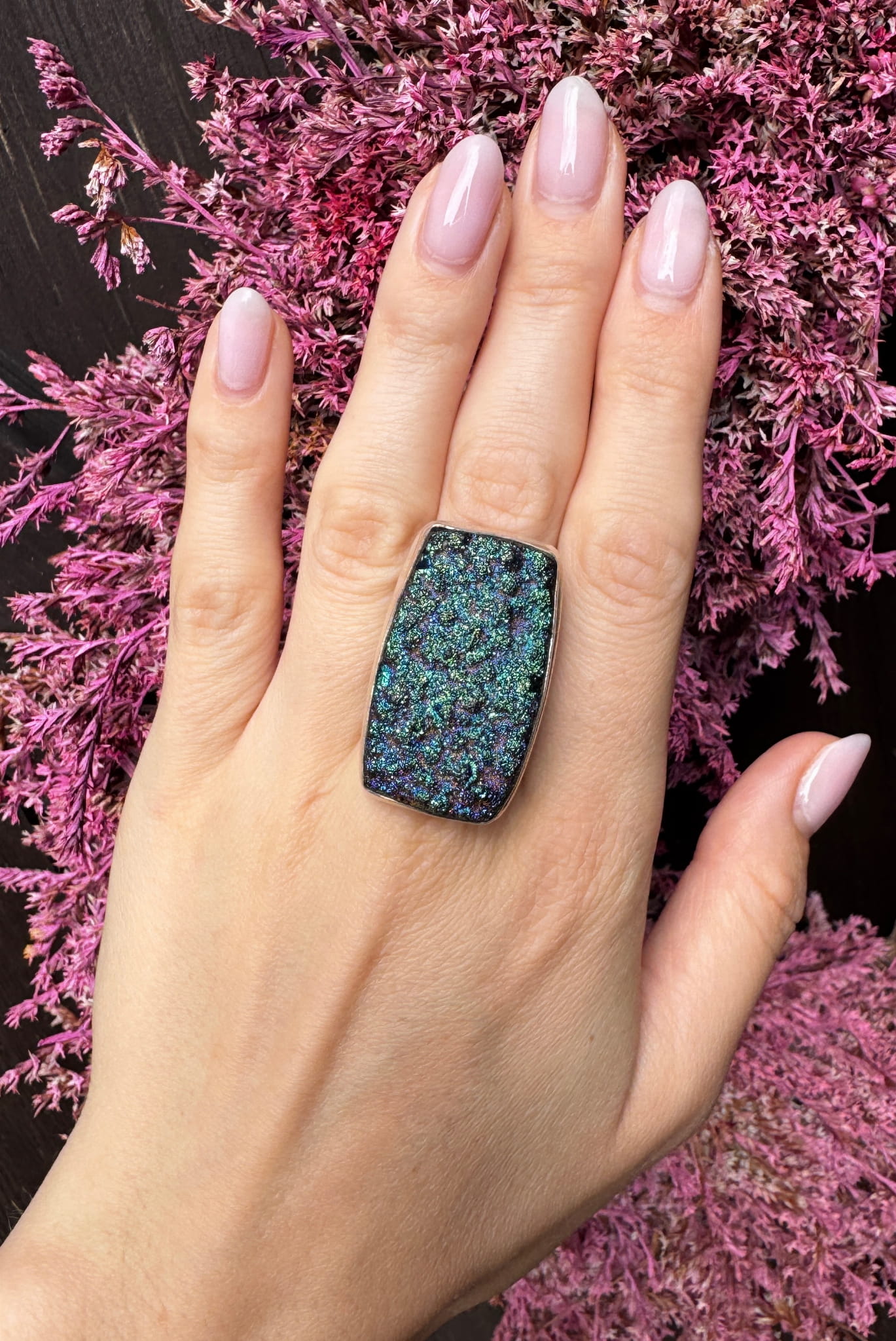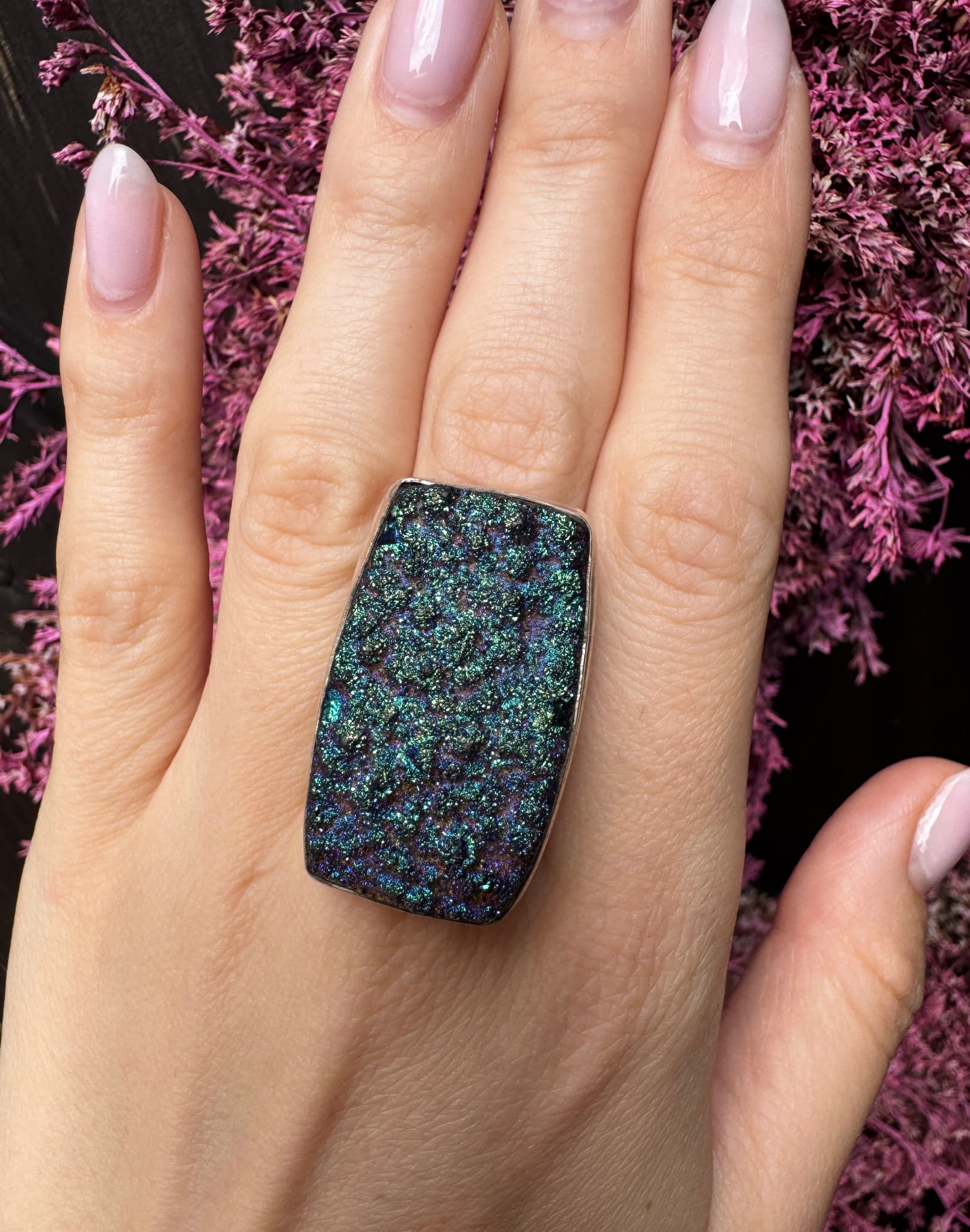 Piękny ręcznie wykonany pierścionek z druzy agatowej i srebra pr.925.