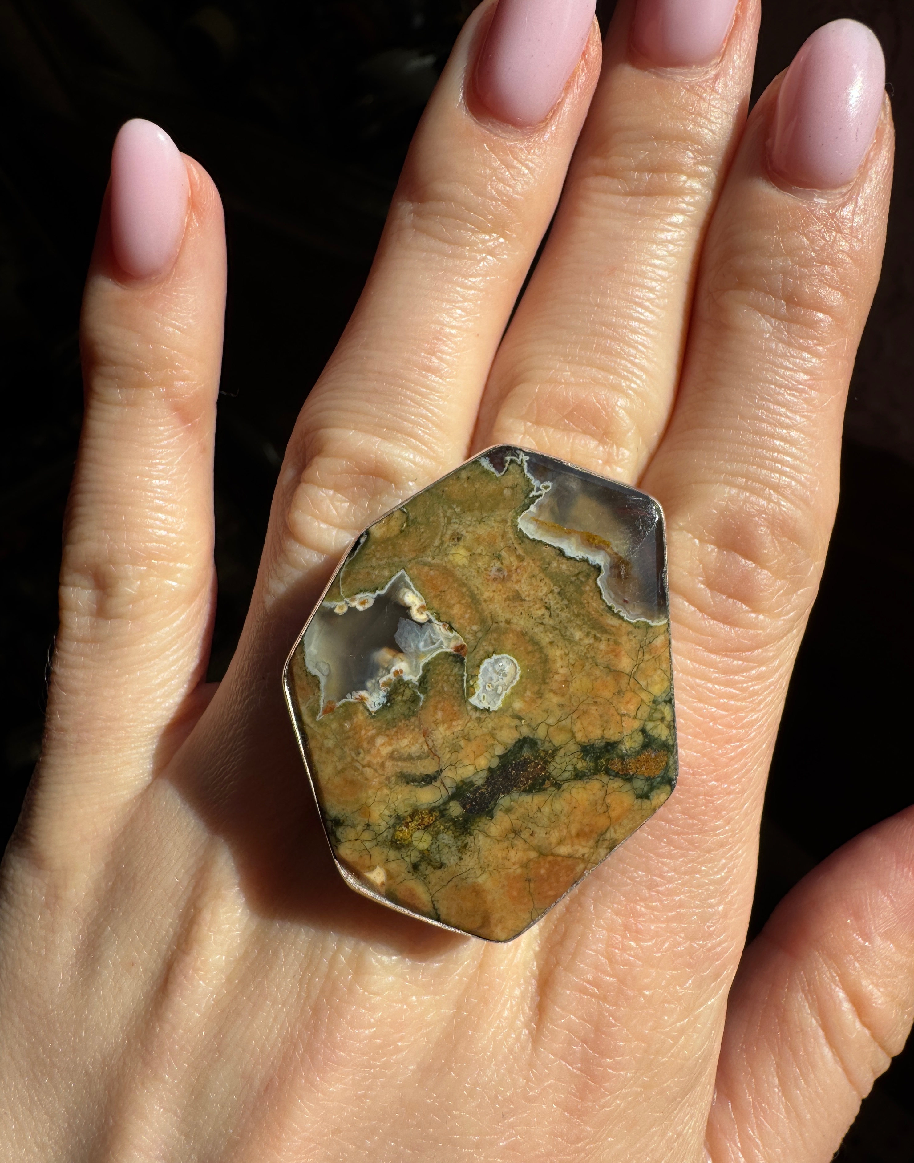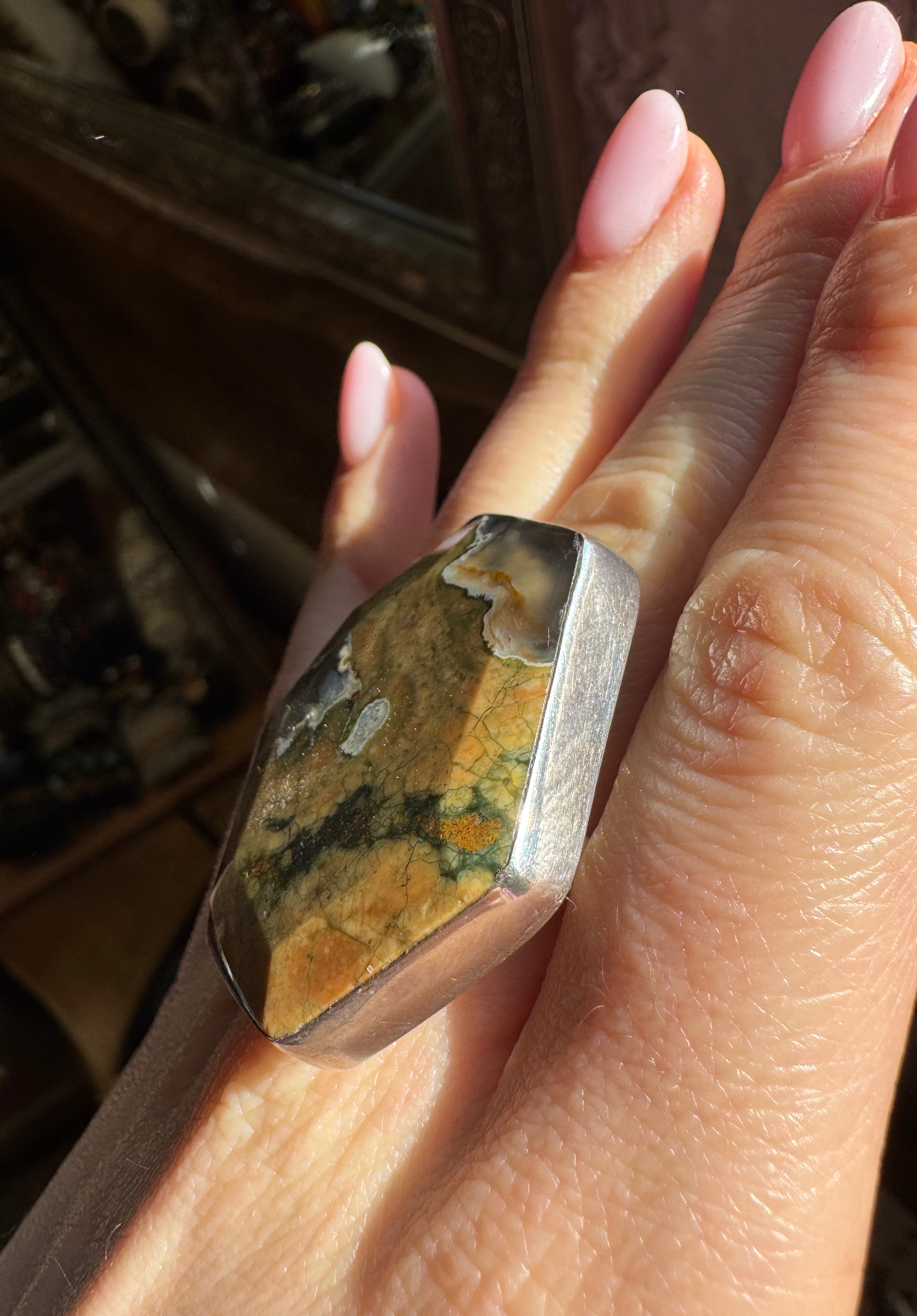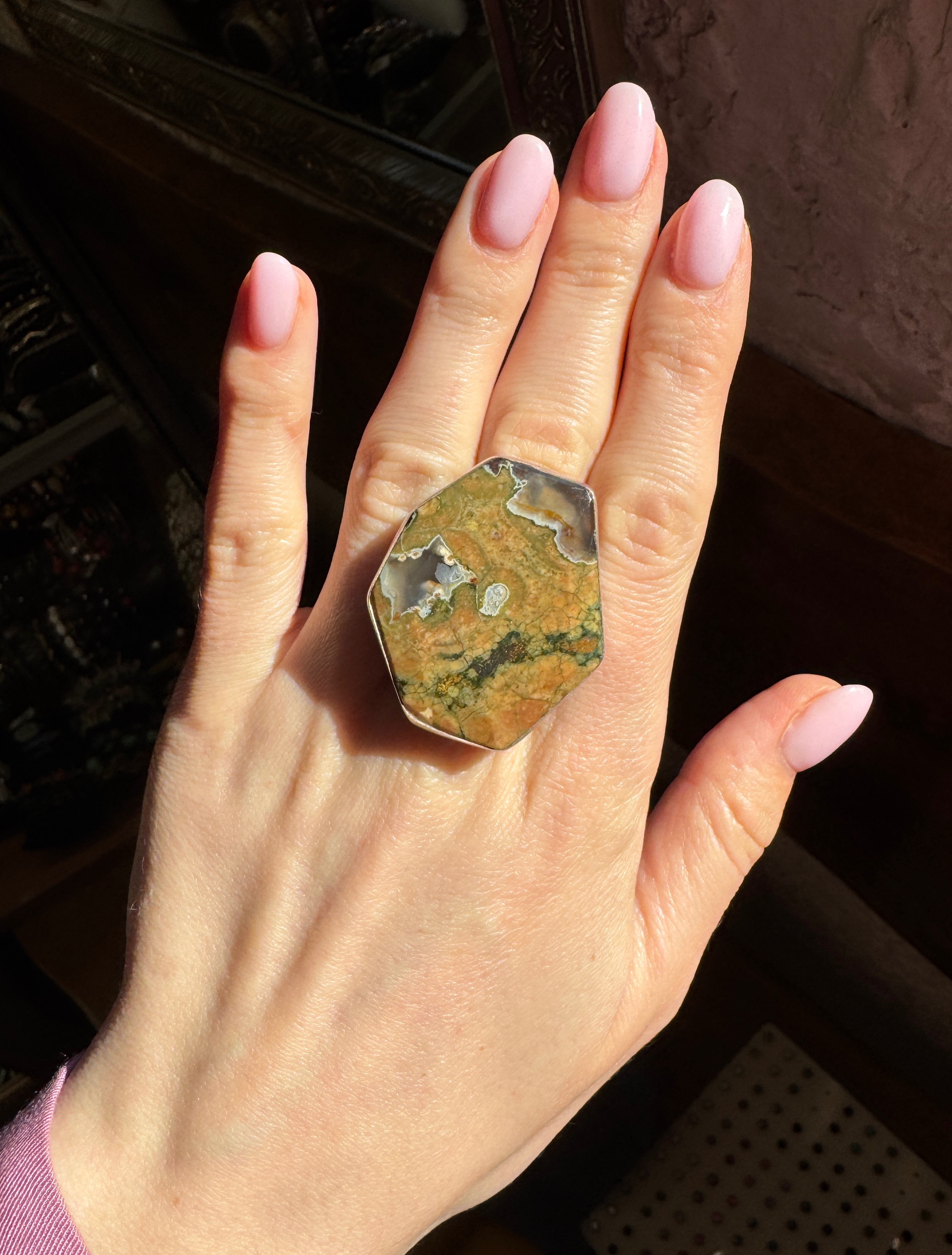 Ręcznie wykonany pierścionek z jaspisu ryolitu i srebra pr.925