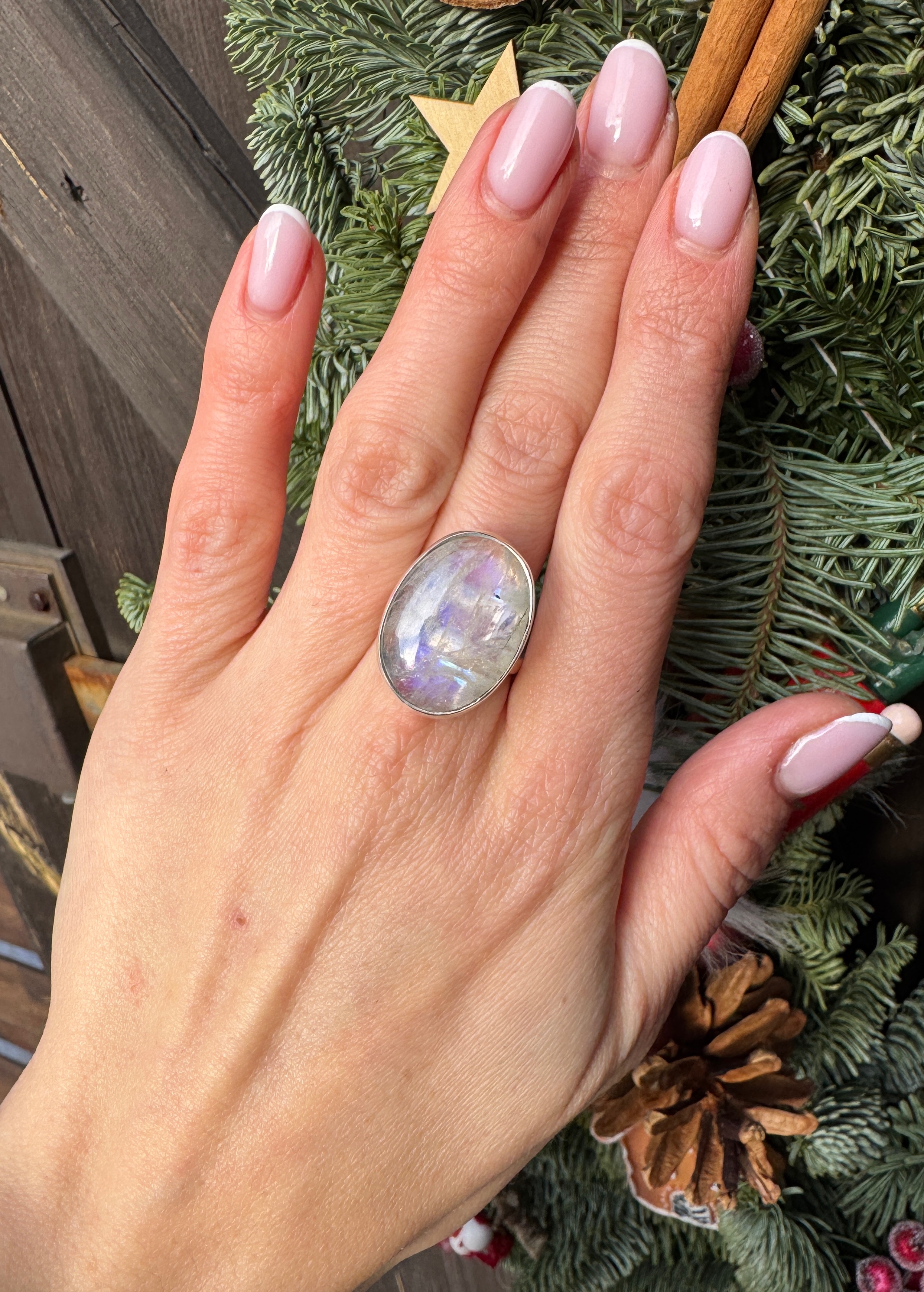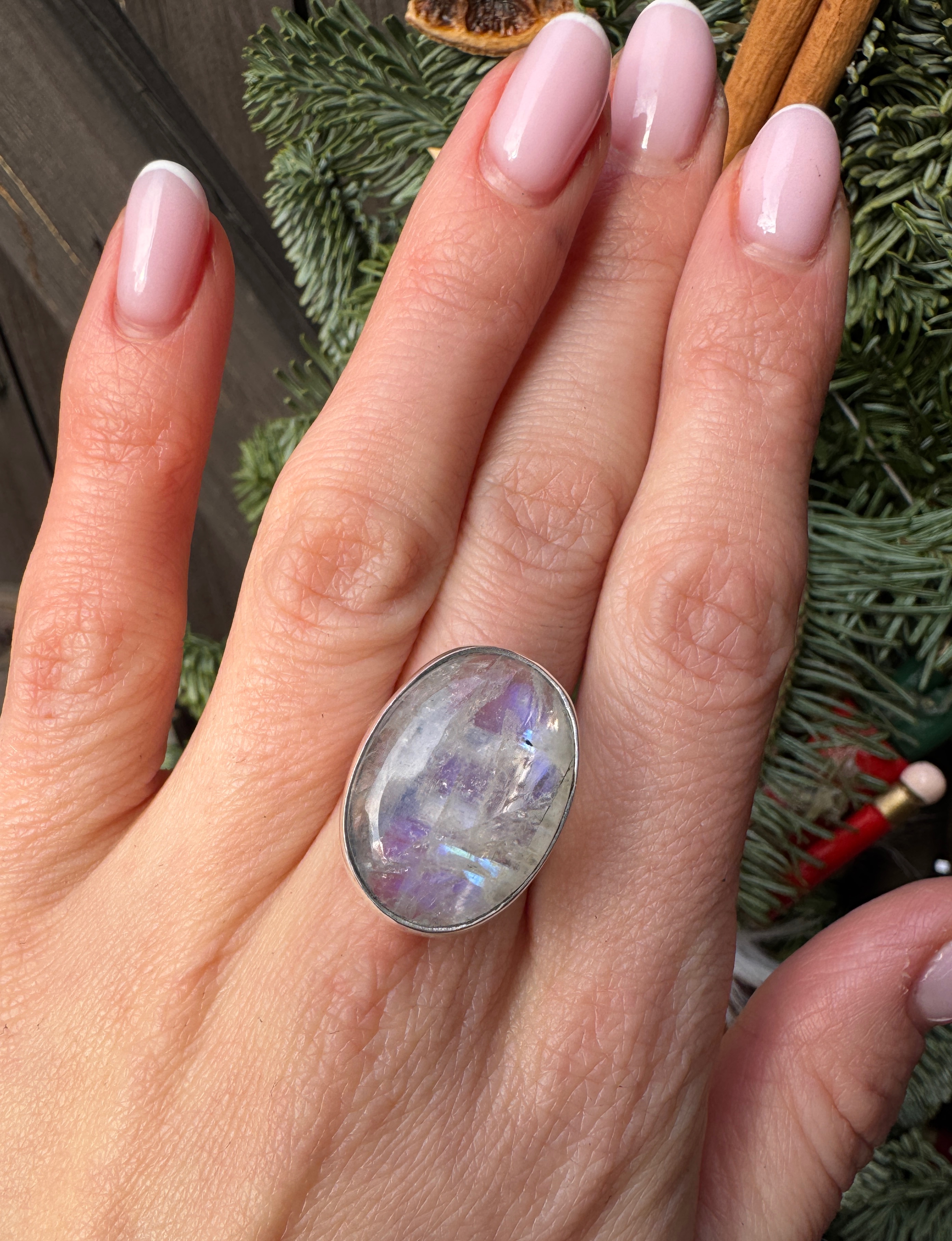 Ręcznie wykonany pierścionek z pięknie mieniącego się kamienia księżycowego w kształcie owalnym i srebra pr.925