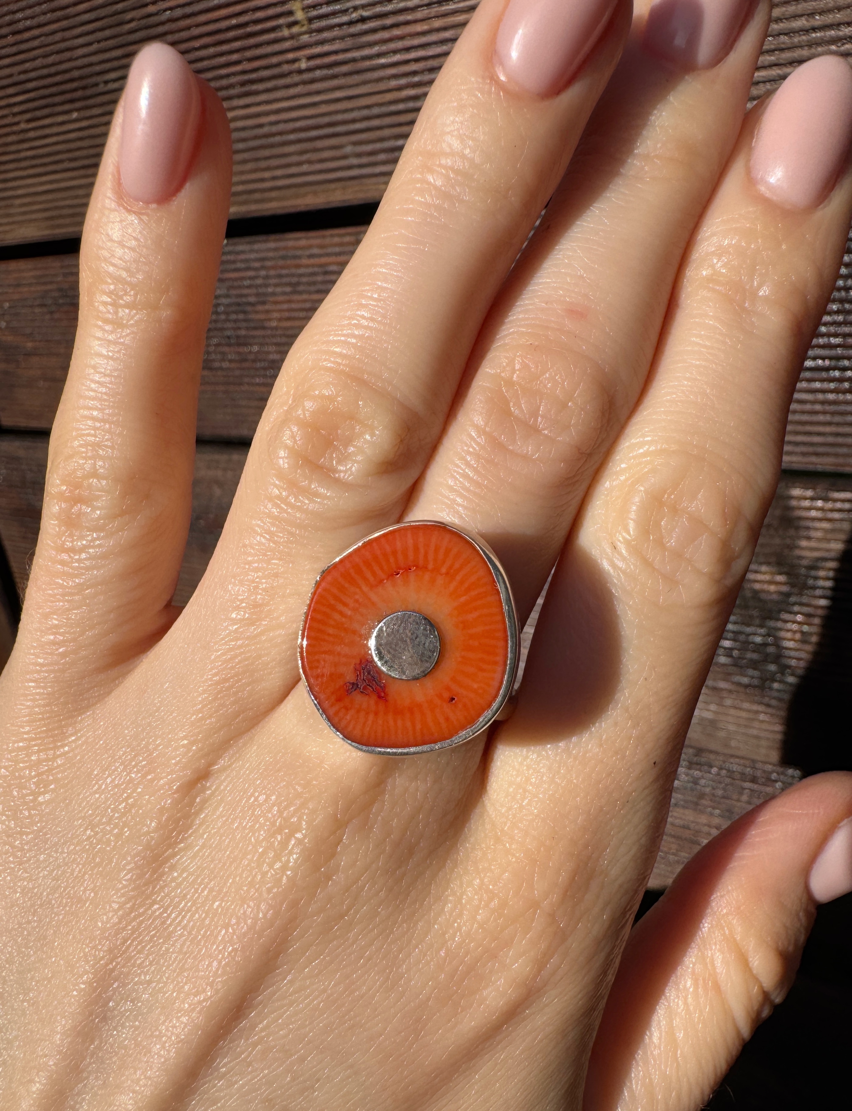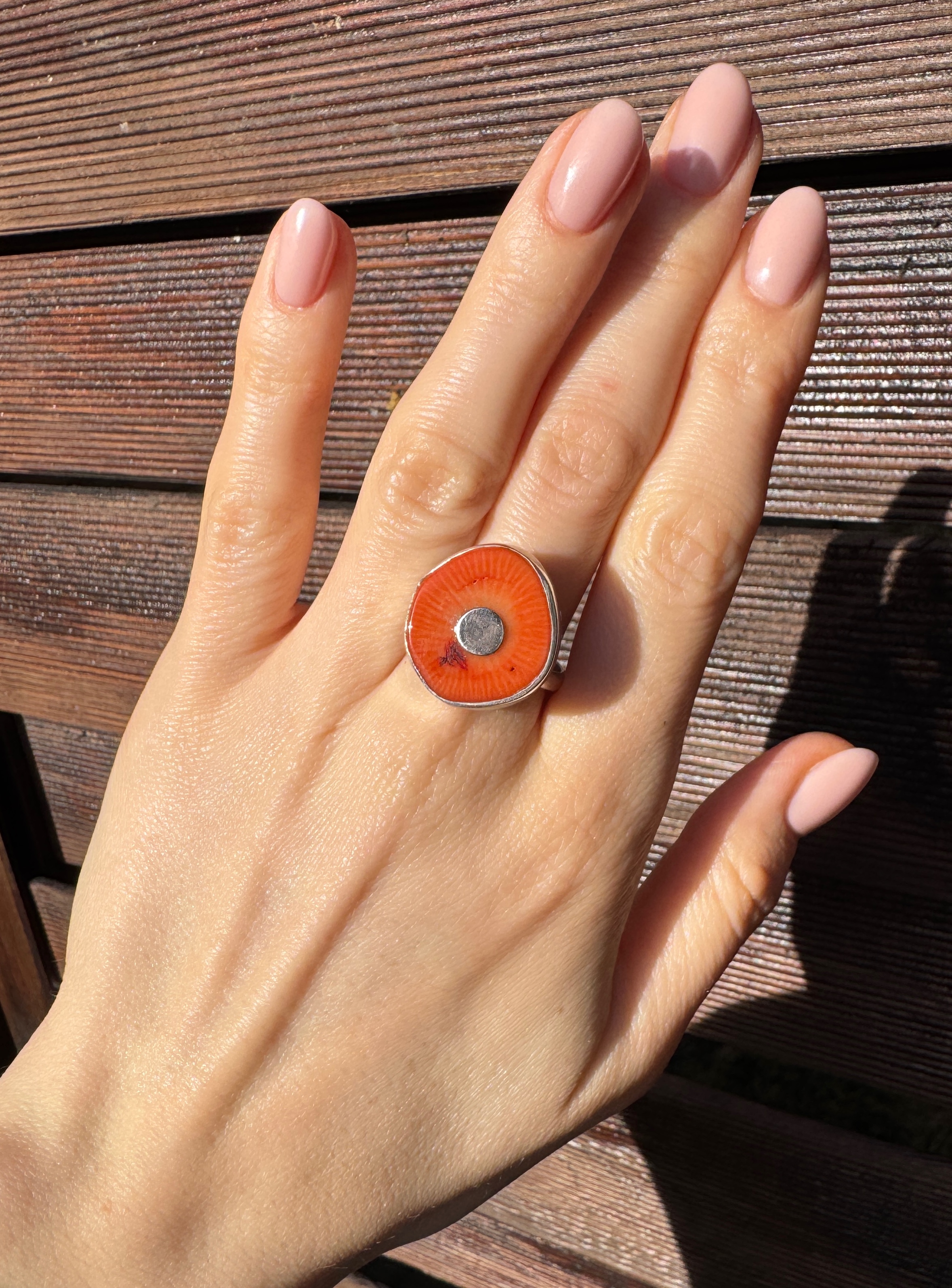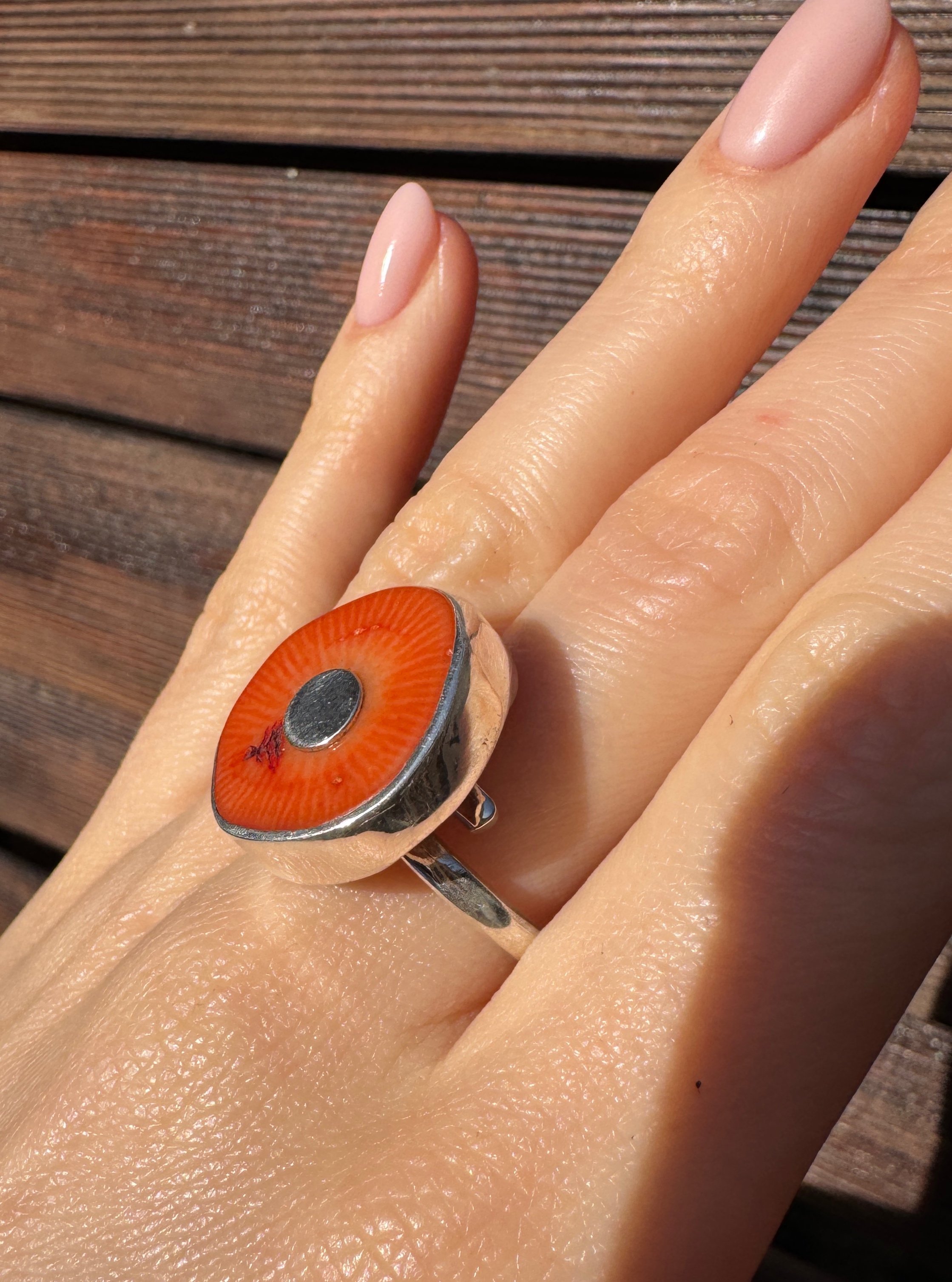 Ręcznie wykonany pierścionek z korala pomarańczowego oraz srebra pr.925