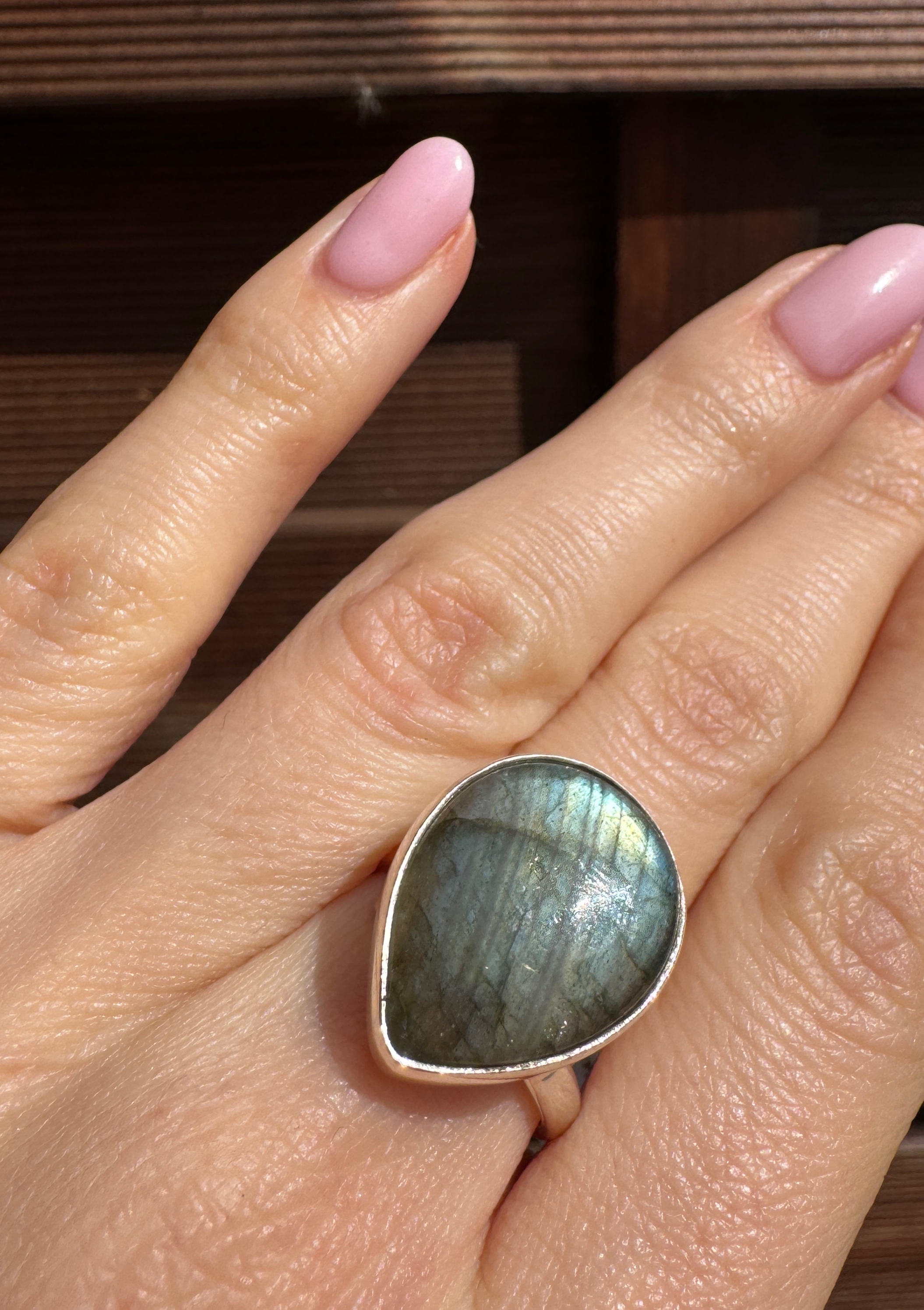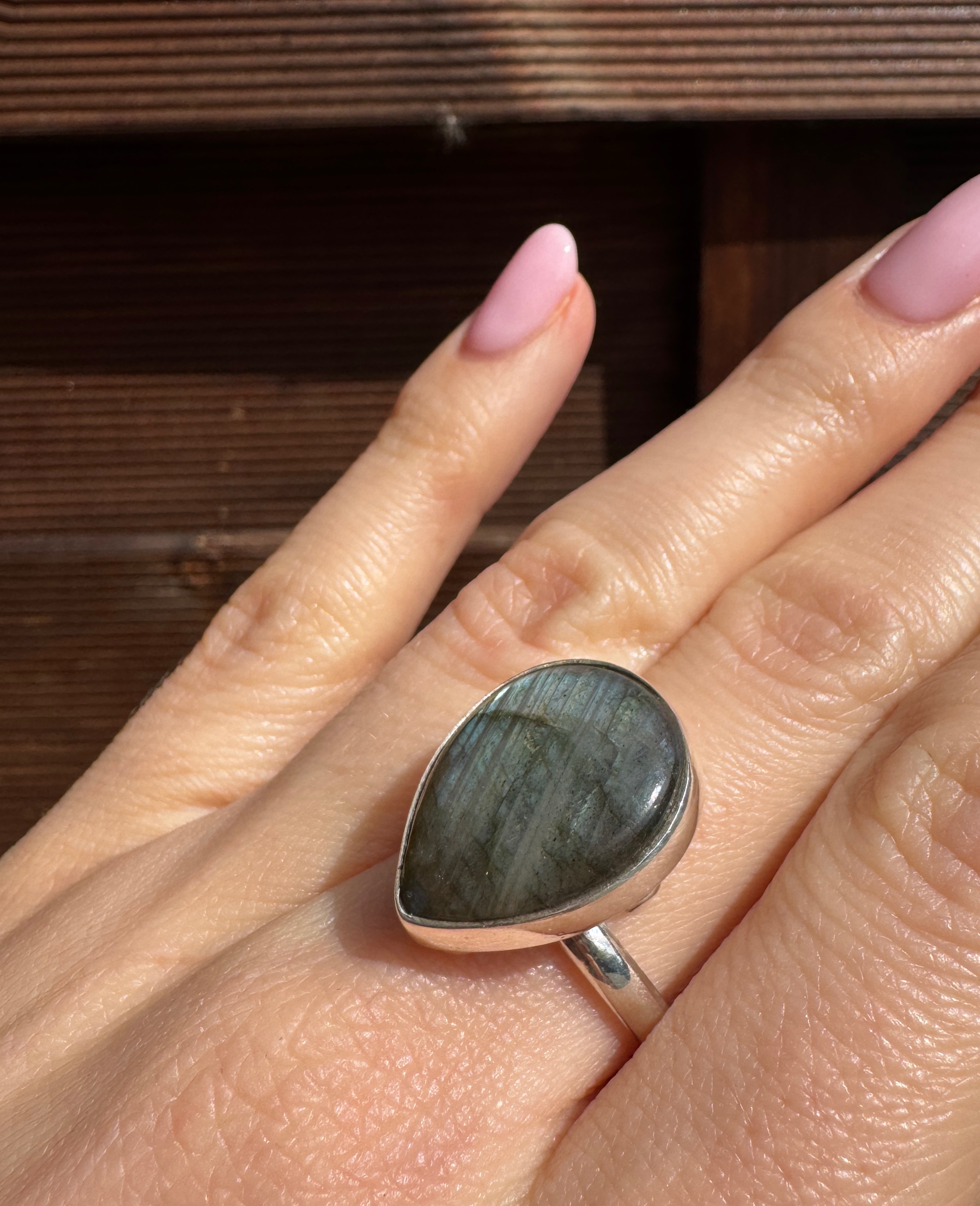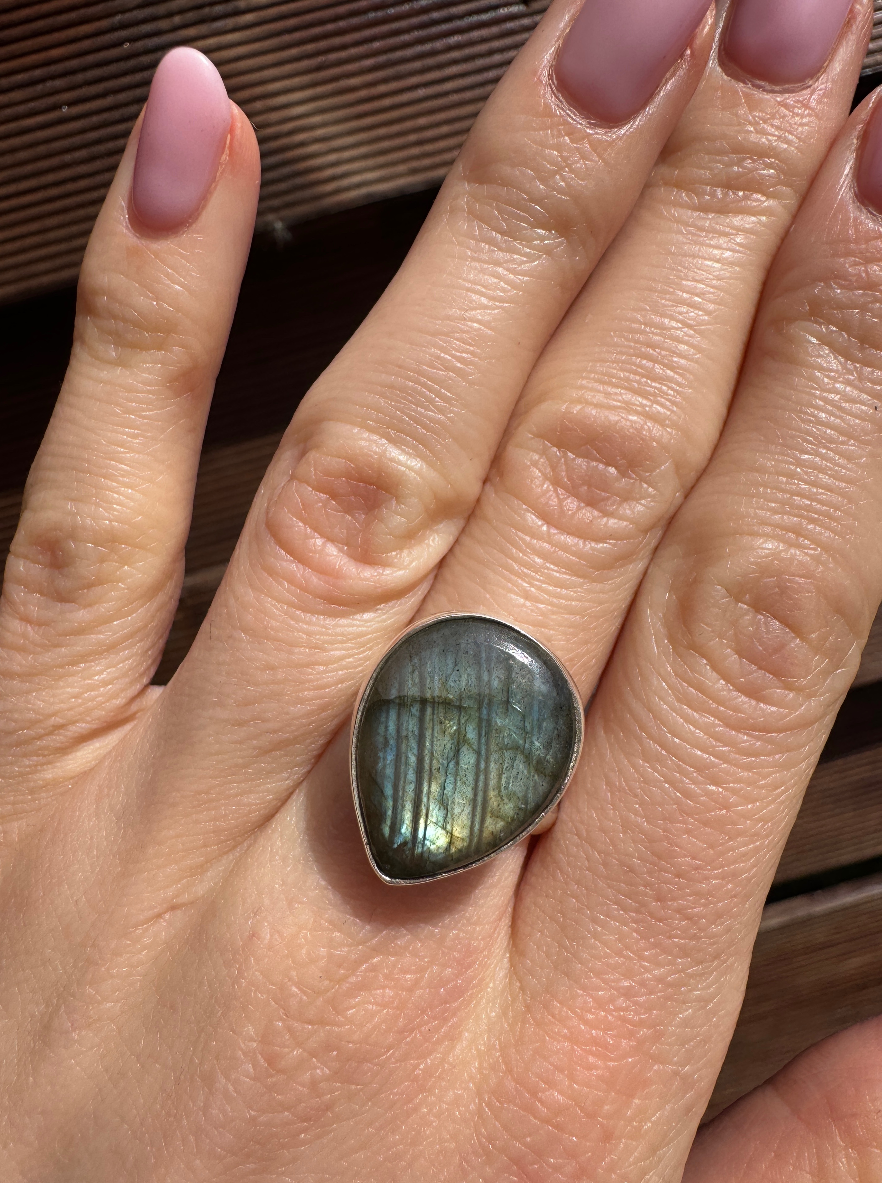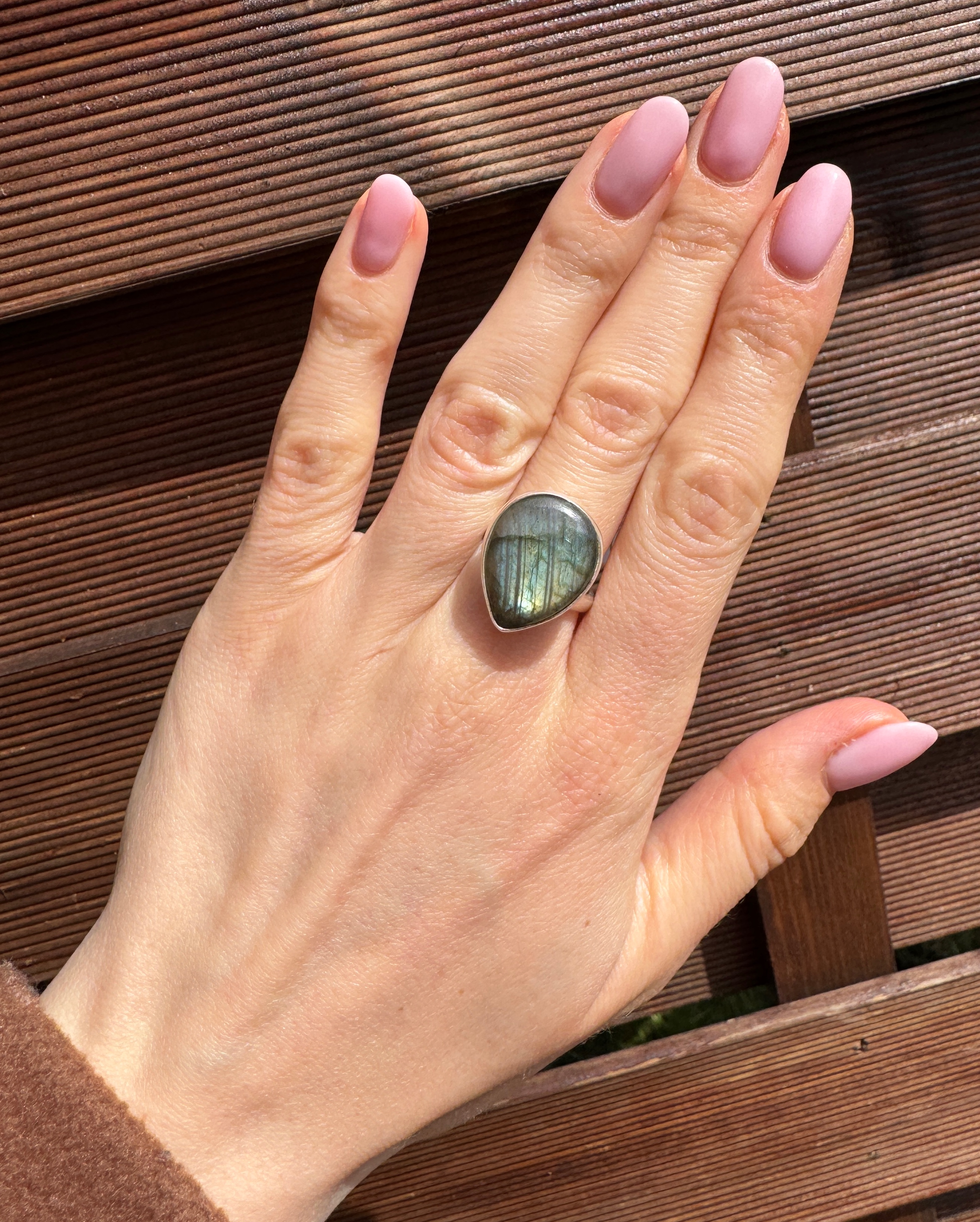 Ręcznie wykonany pierścionek z pięknie mieniącego się labradorytu w kształcie łezki i srebra pr.925