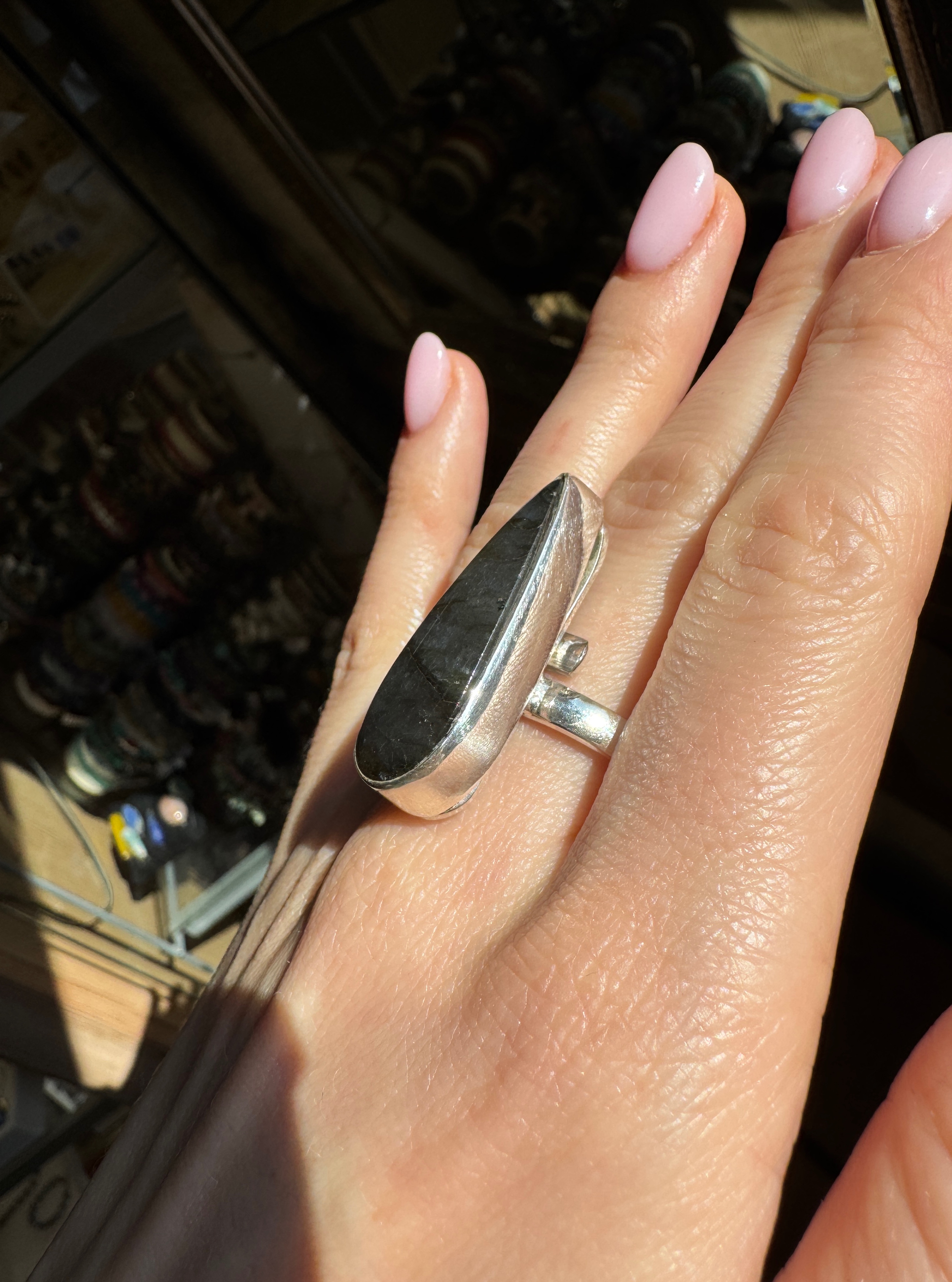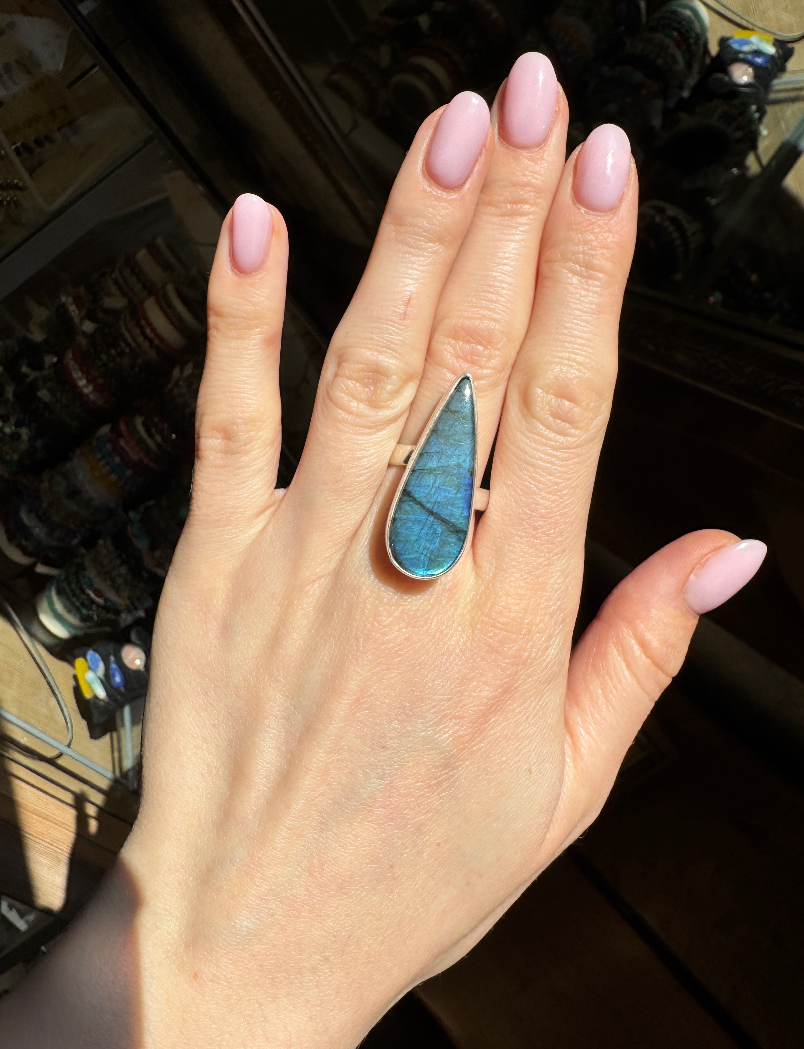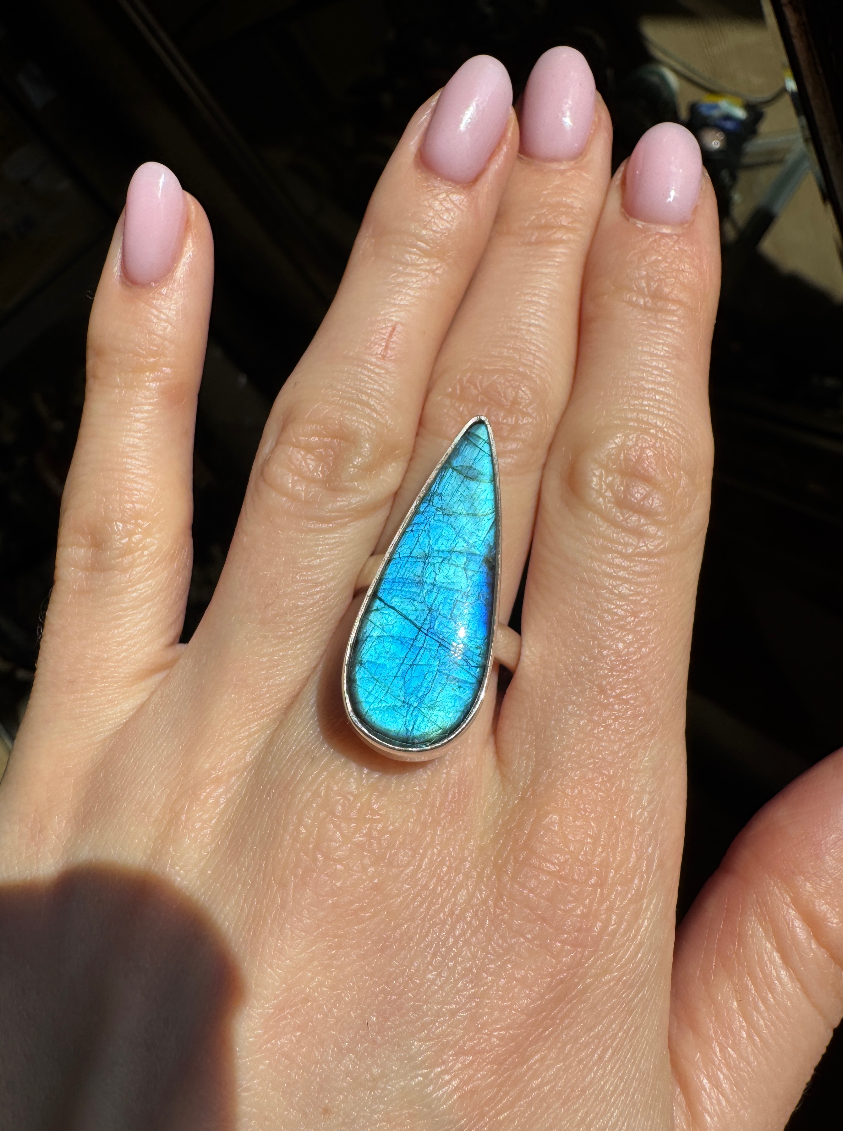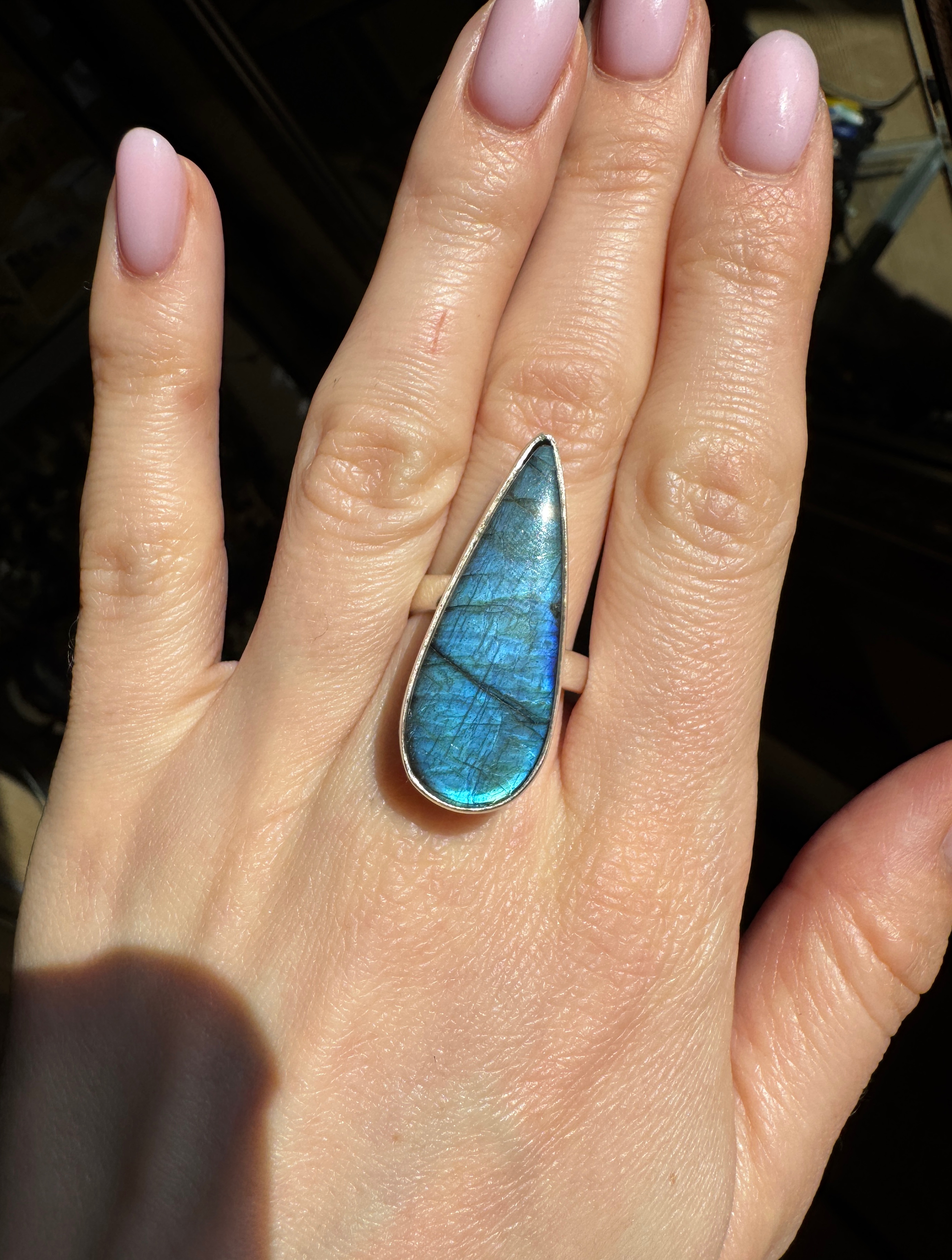 Ręcznie wykonany pierścionek z pięknie mieniącego się labradorytu w kształcie łezki i srebra pr.925