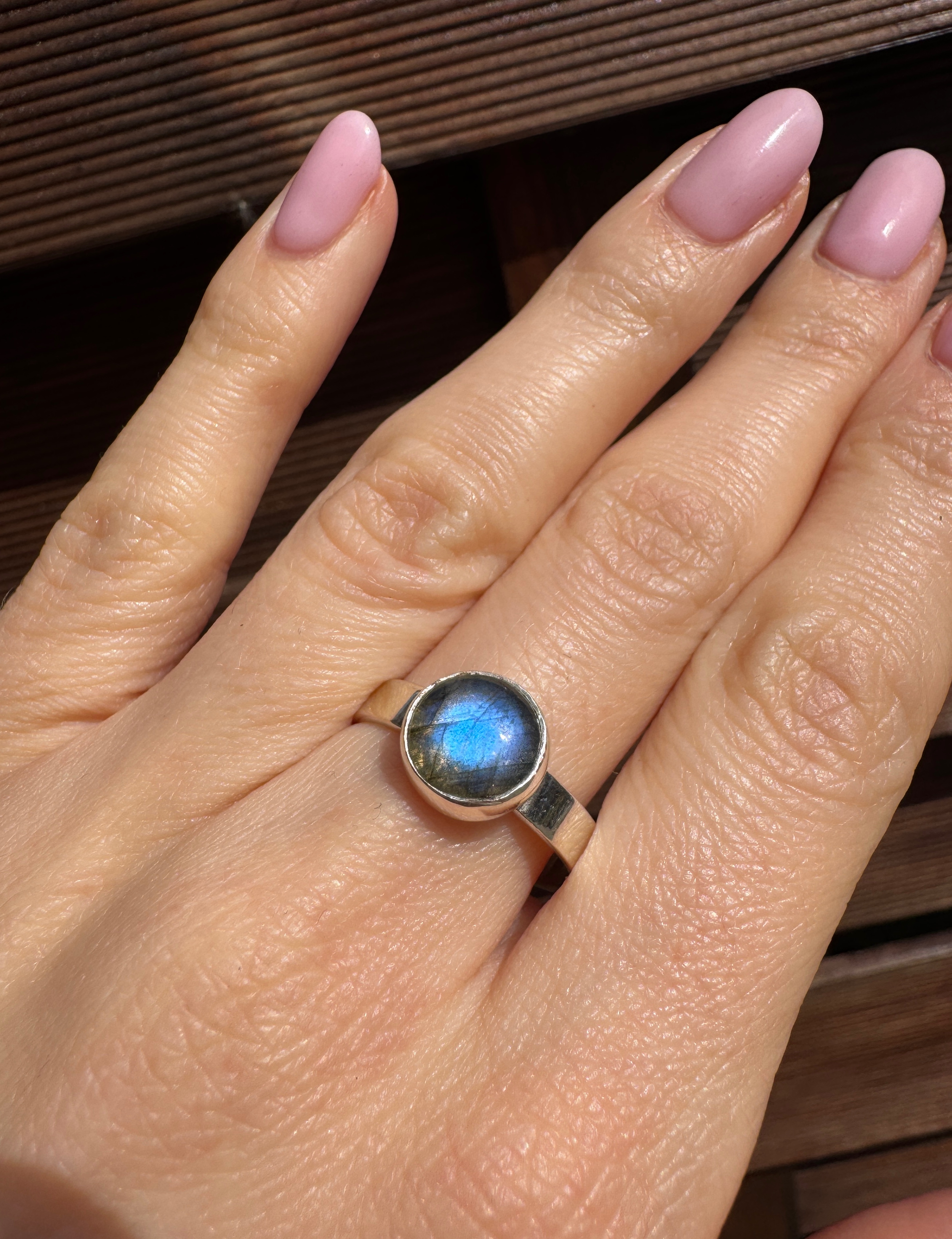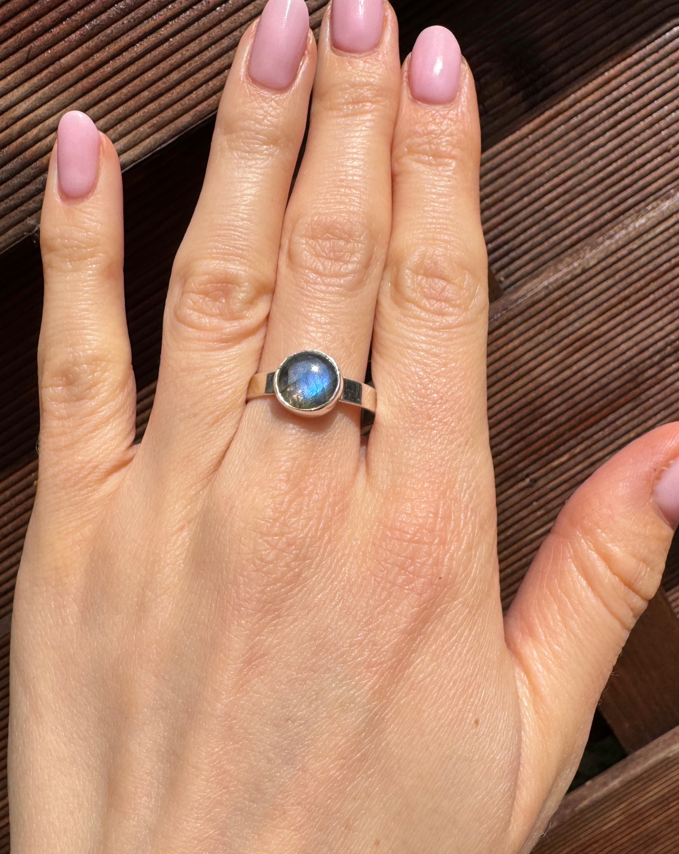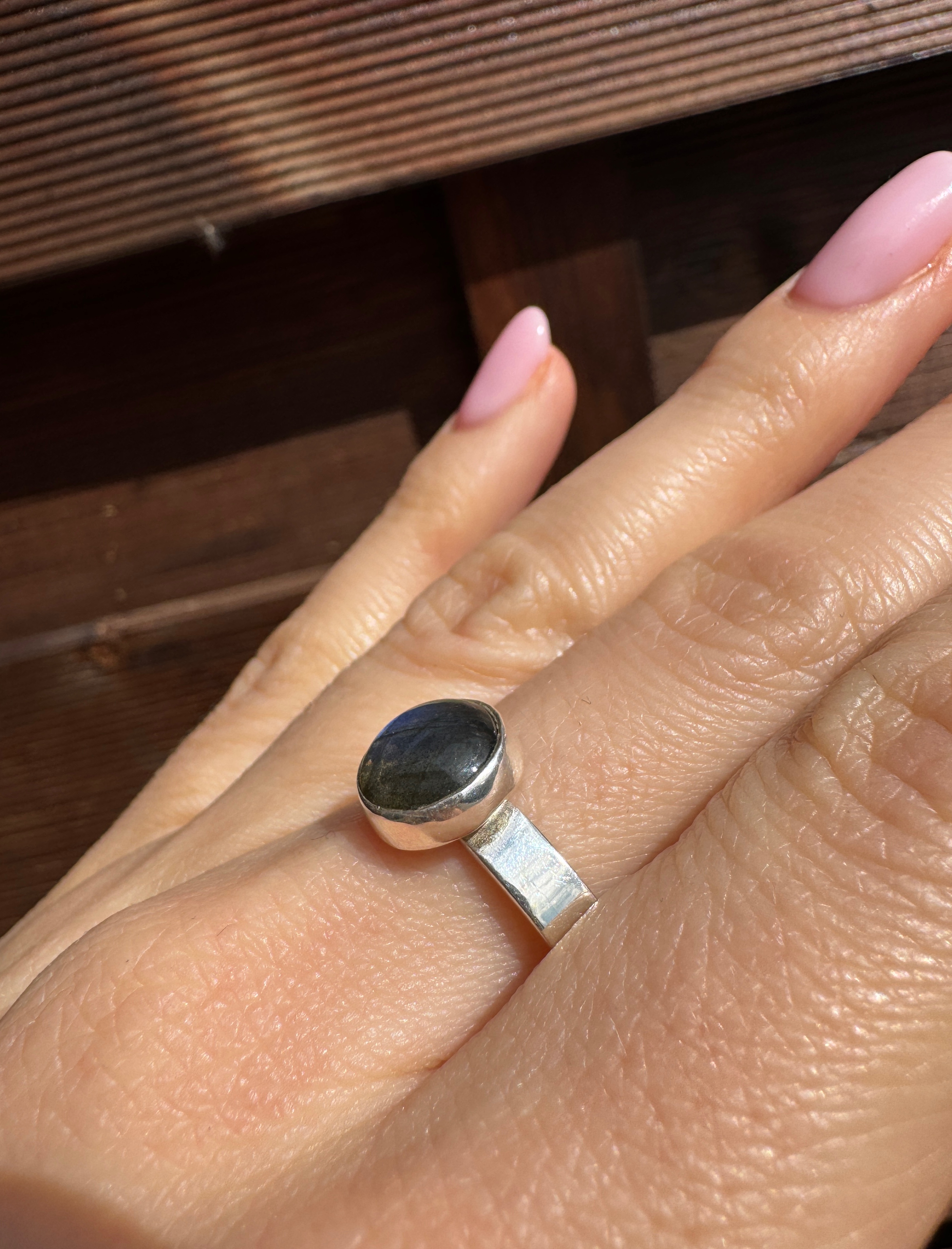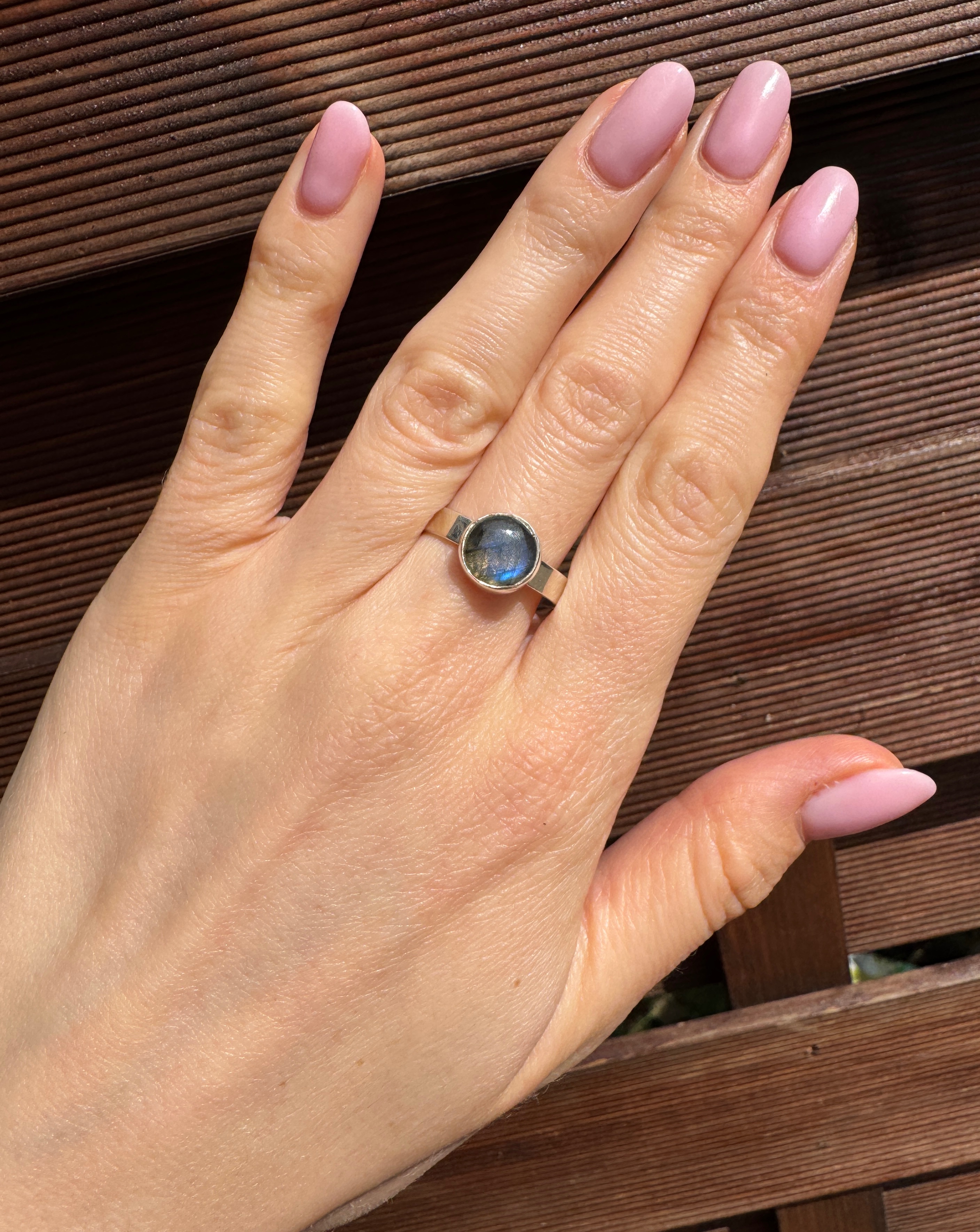 Ręcznie wykonany pierścionek z pięknie mieniącego się labradorytu w kształcie okrągłym i srebra pr.925