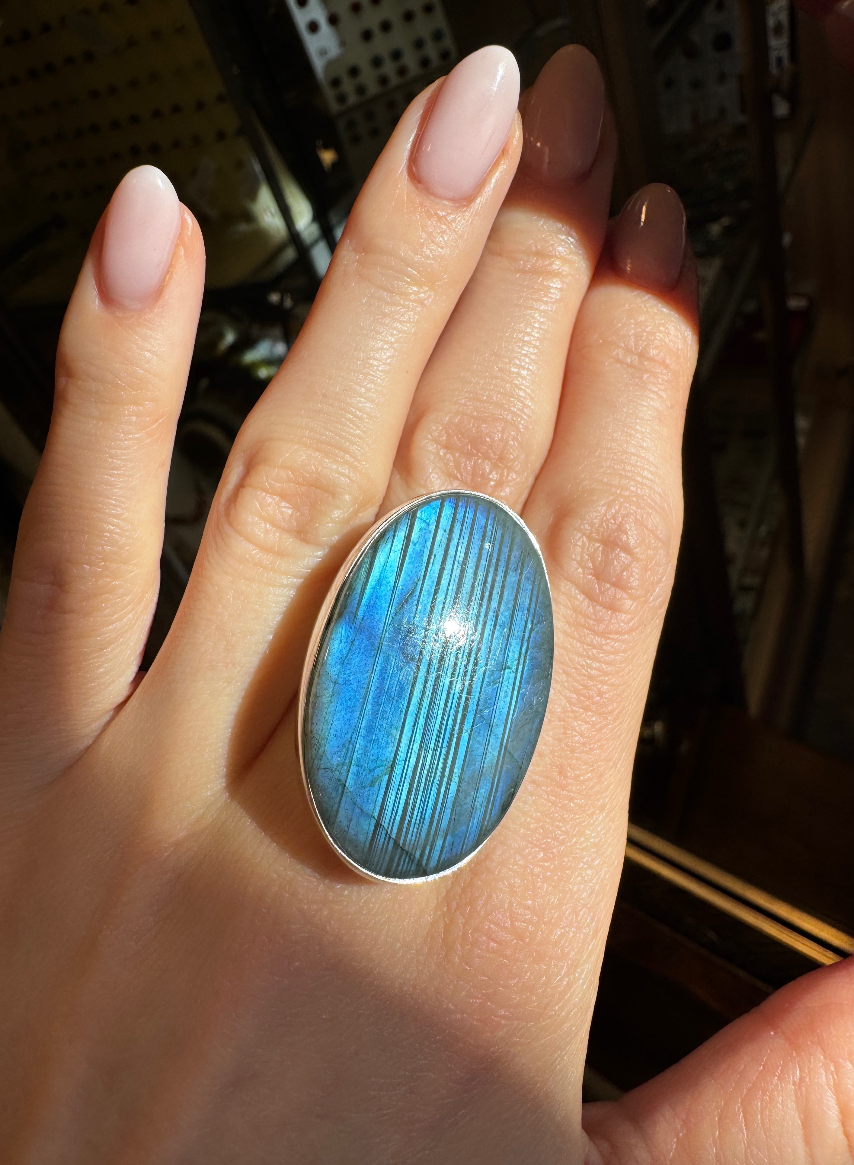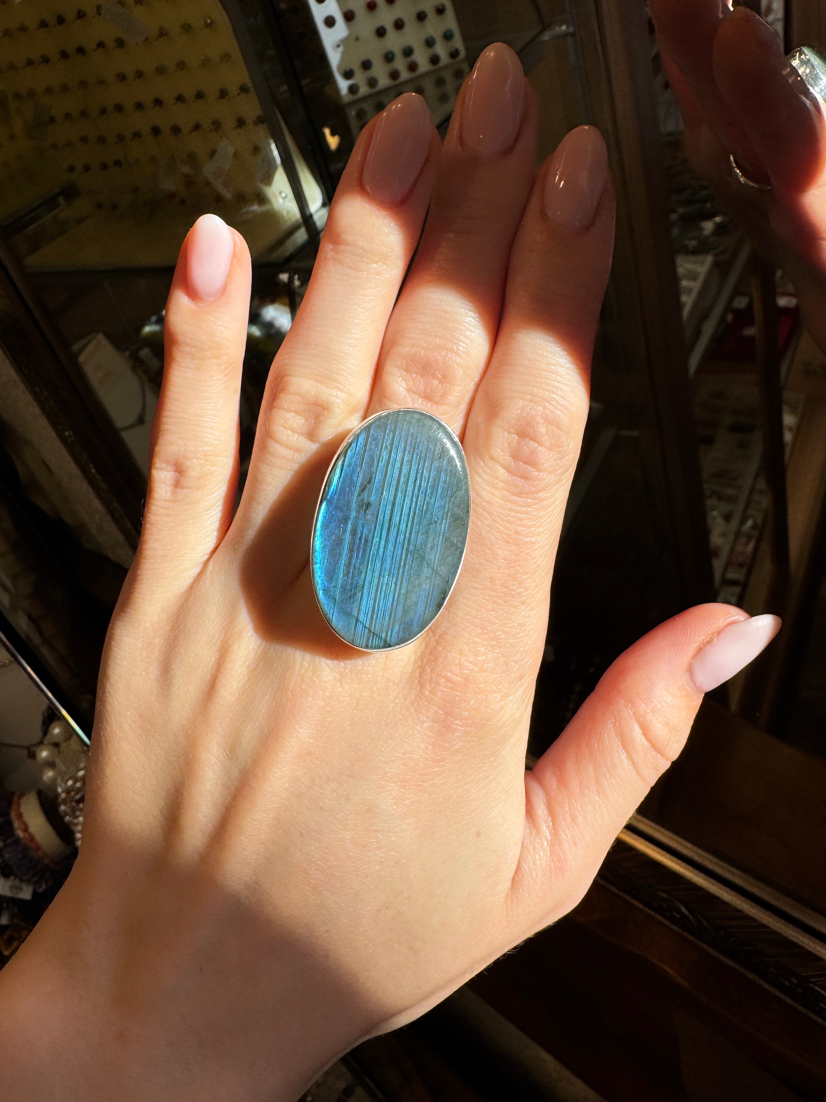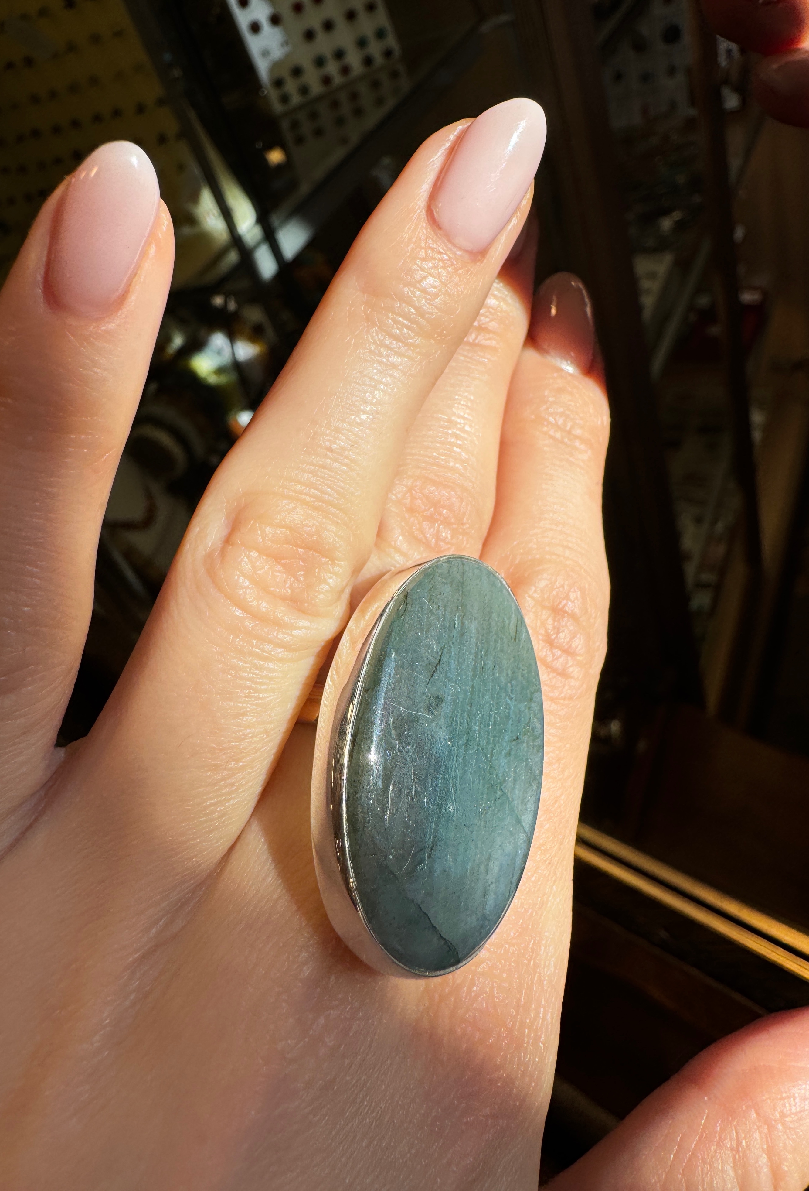 Ręcznie wykonany pierścionek z pięknie mieniącego się labradorytu w kształcie owalnym i srebra pr.925