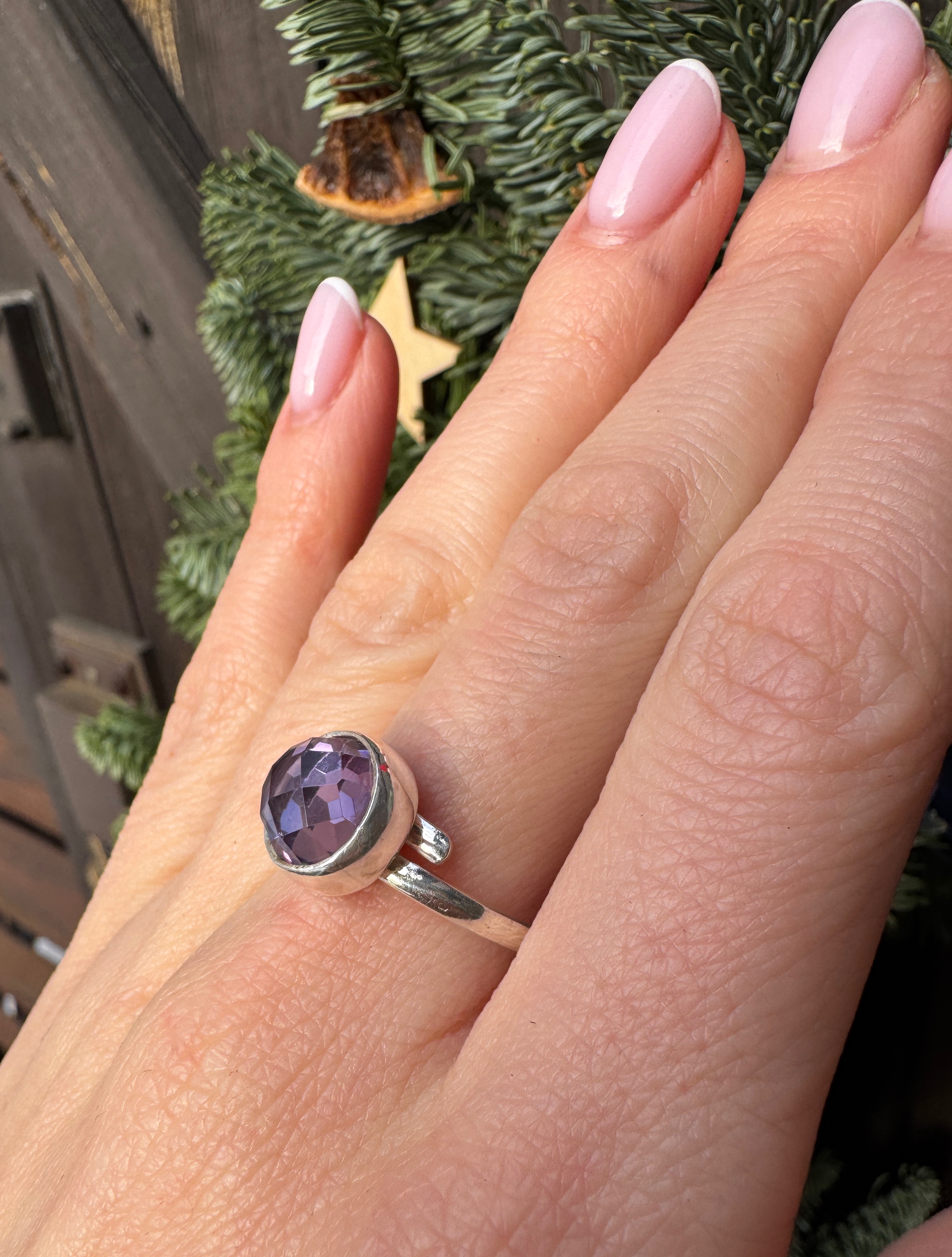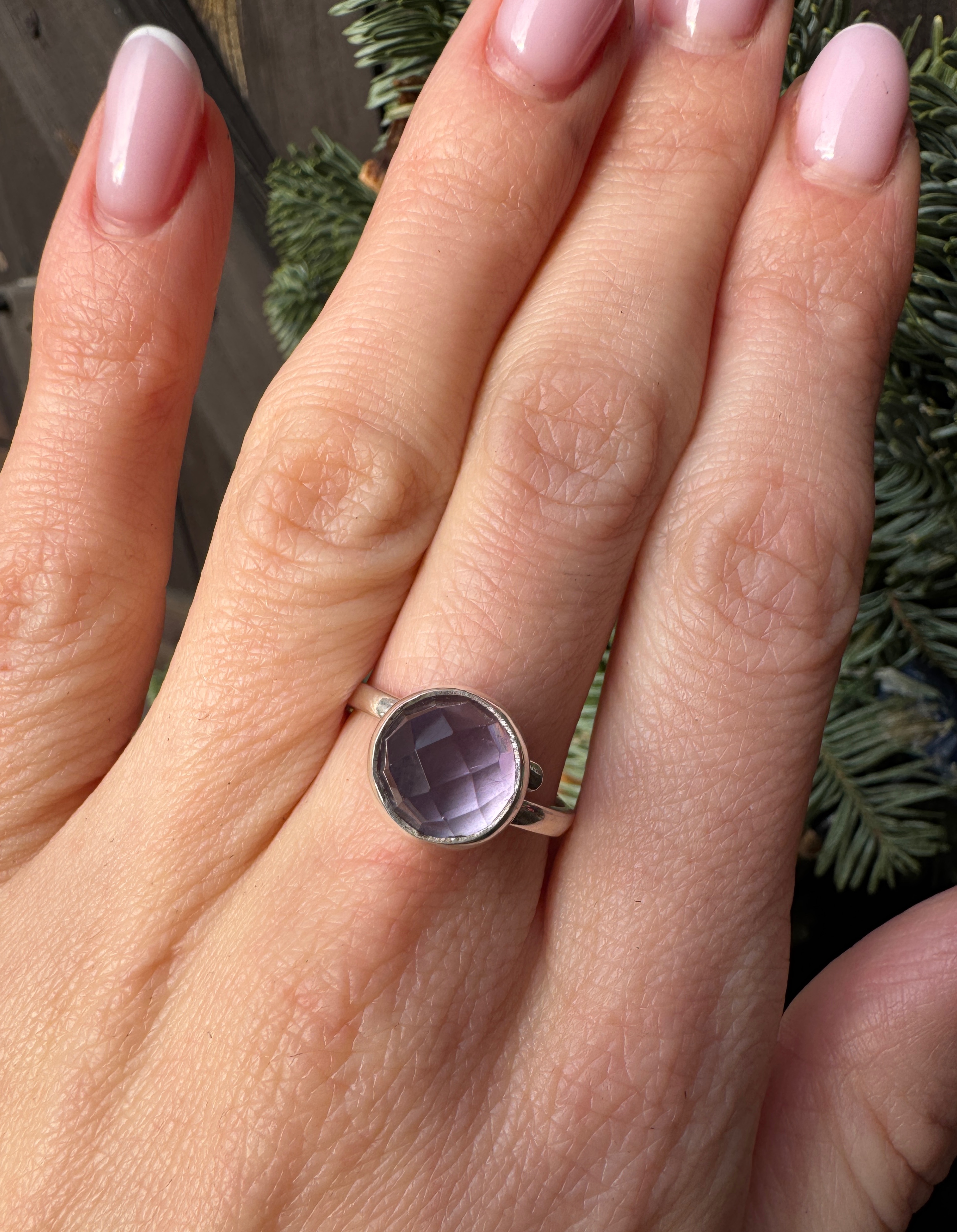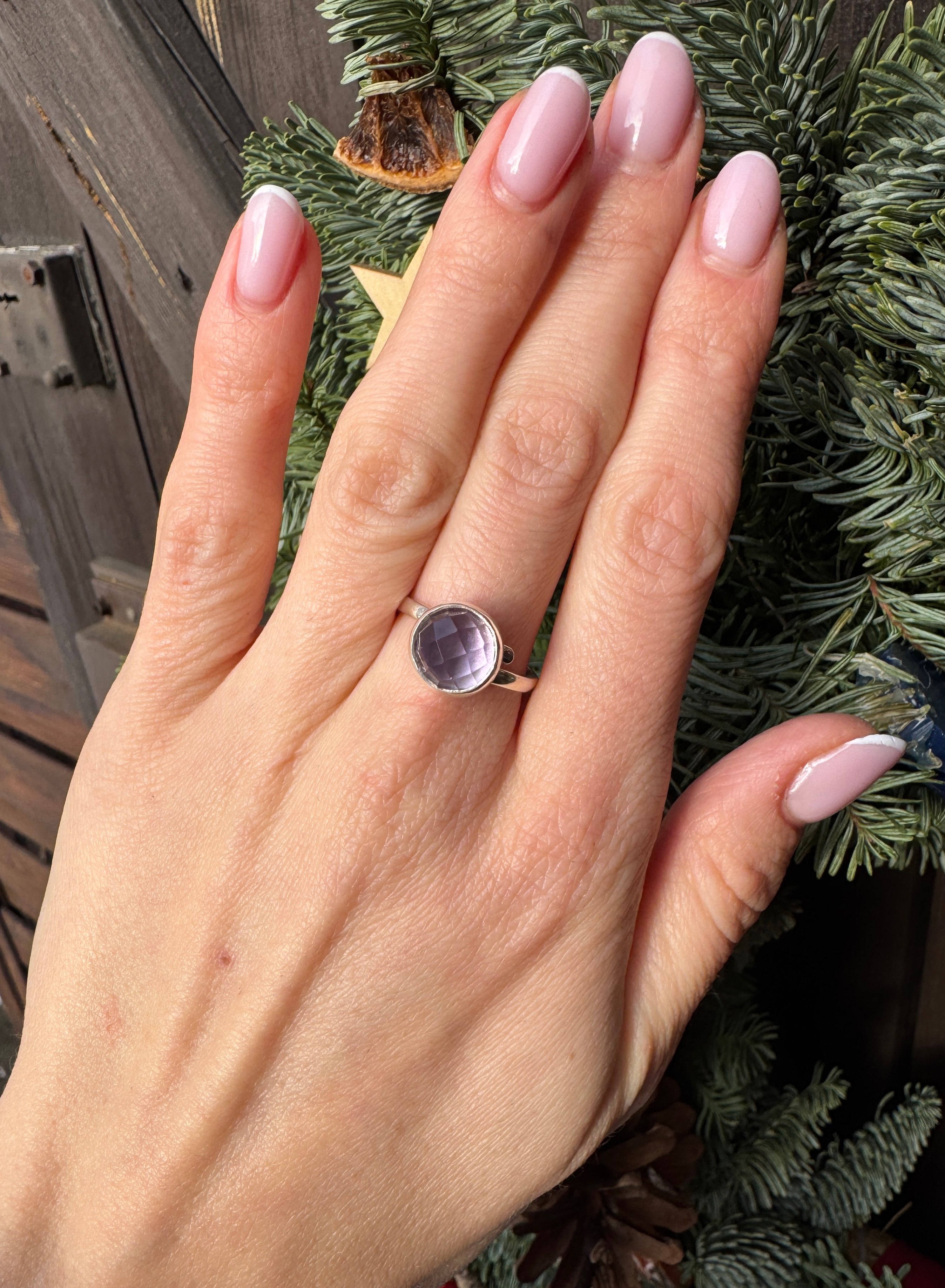 Ręcznie wykonany pierścionek z fioletowego, fasetowanego okrągłego ametystu i srebra pr.925