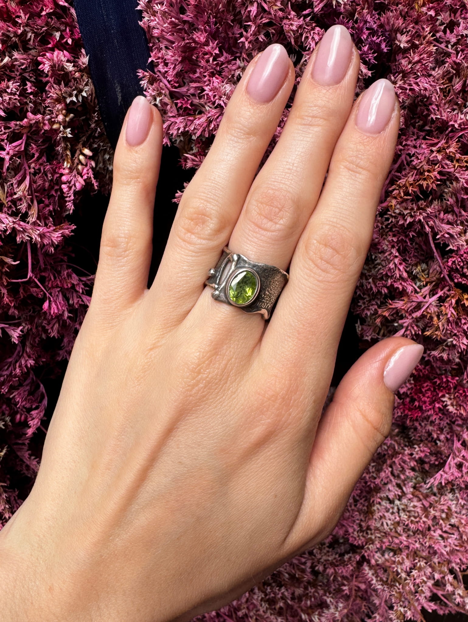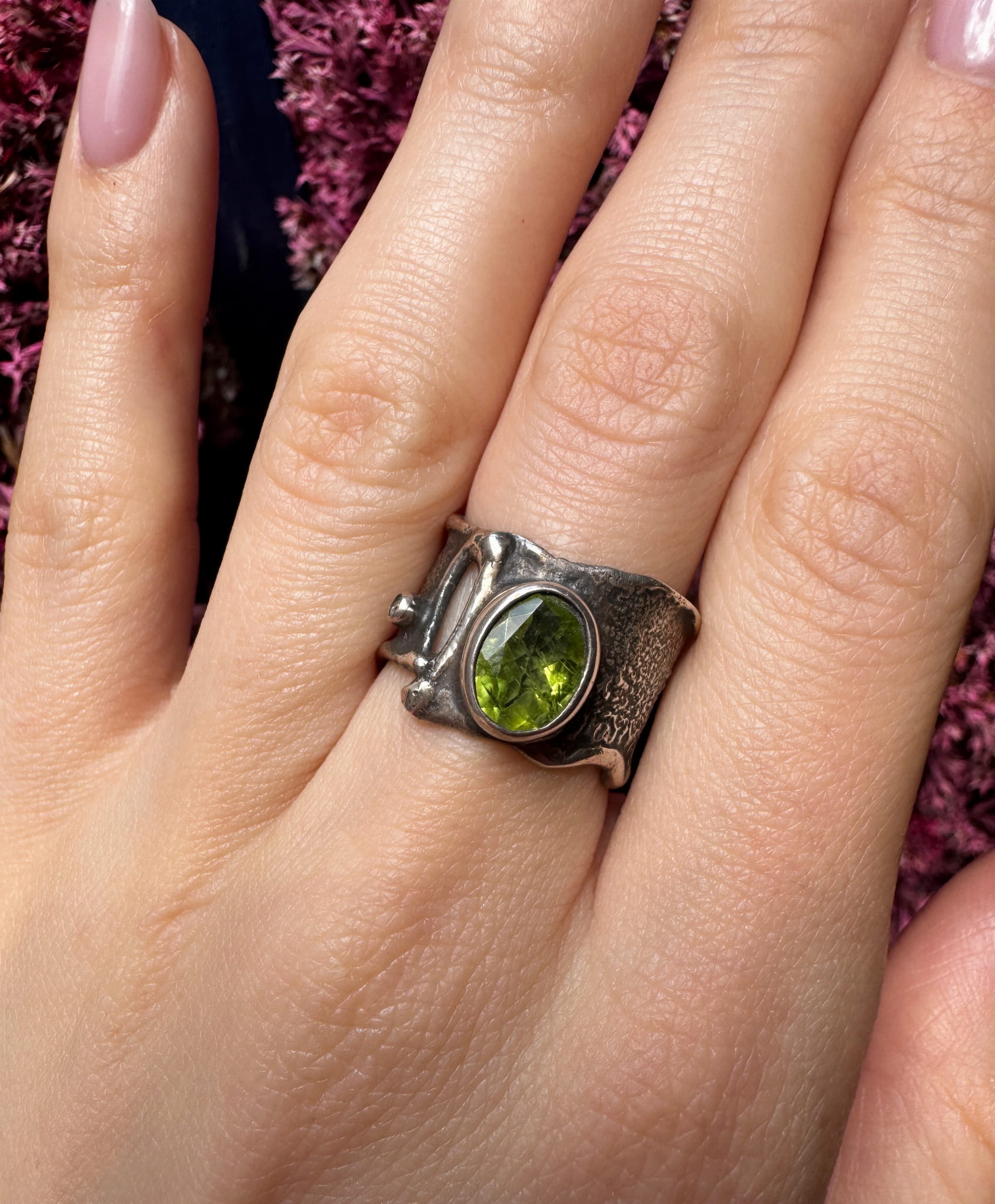 Pierścionek oliwin okrągły szeroka obrączka