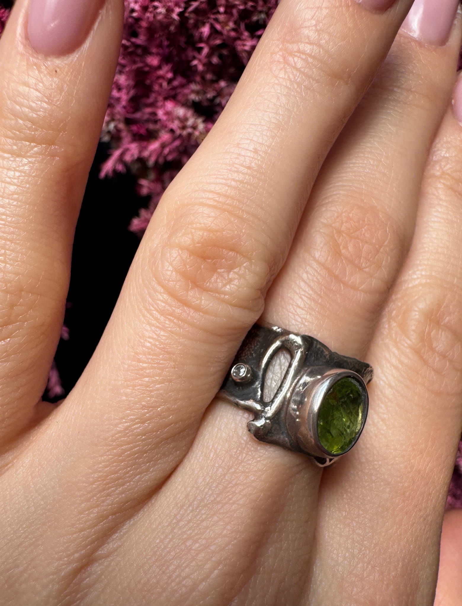 Ręcznie wykonany pierścionek z zielonego oliwinu owalnego i fasetowanego, drobnej białej cyrkonii i srebra pr.925 oksydowanego