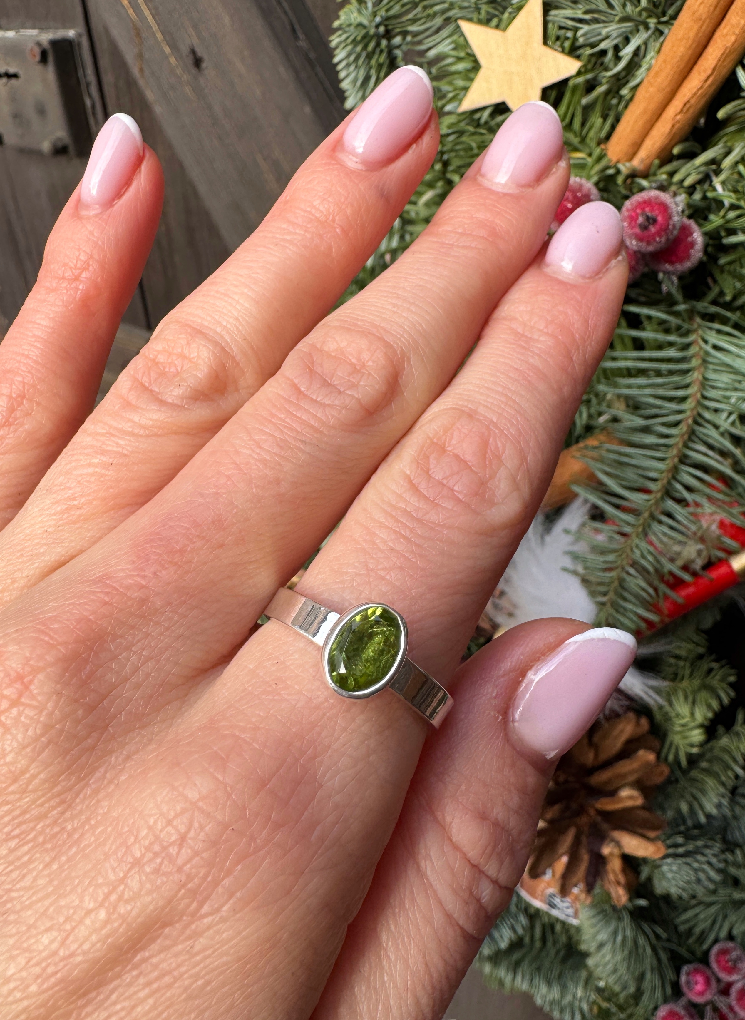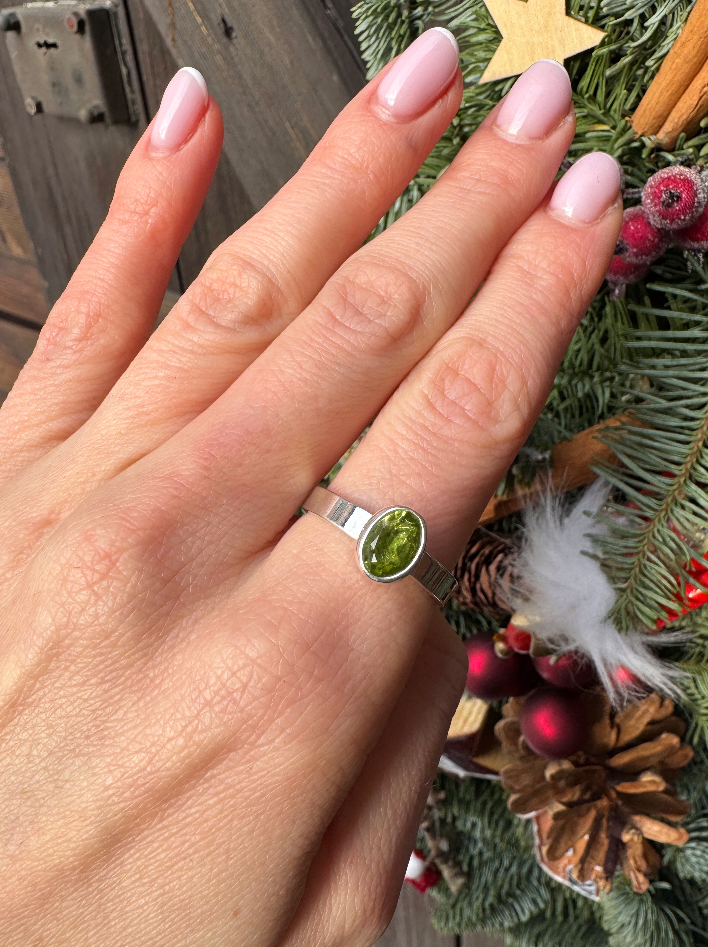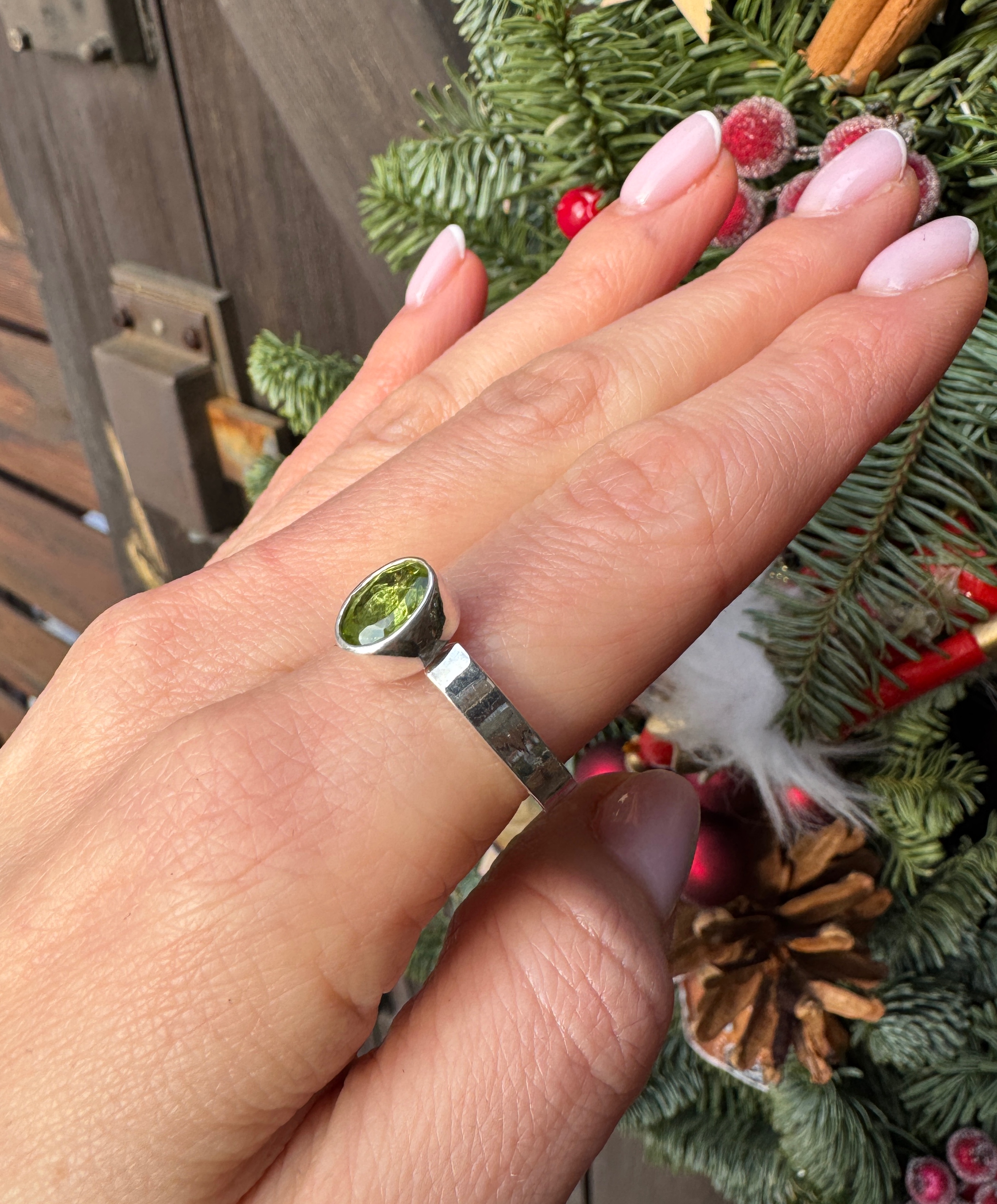 Ręcznie wykonany pierścionek z zielonym oliwinem fasetowanym i srebra pr.925
