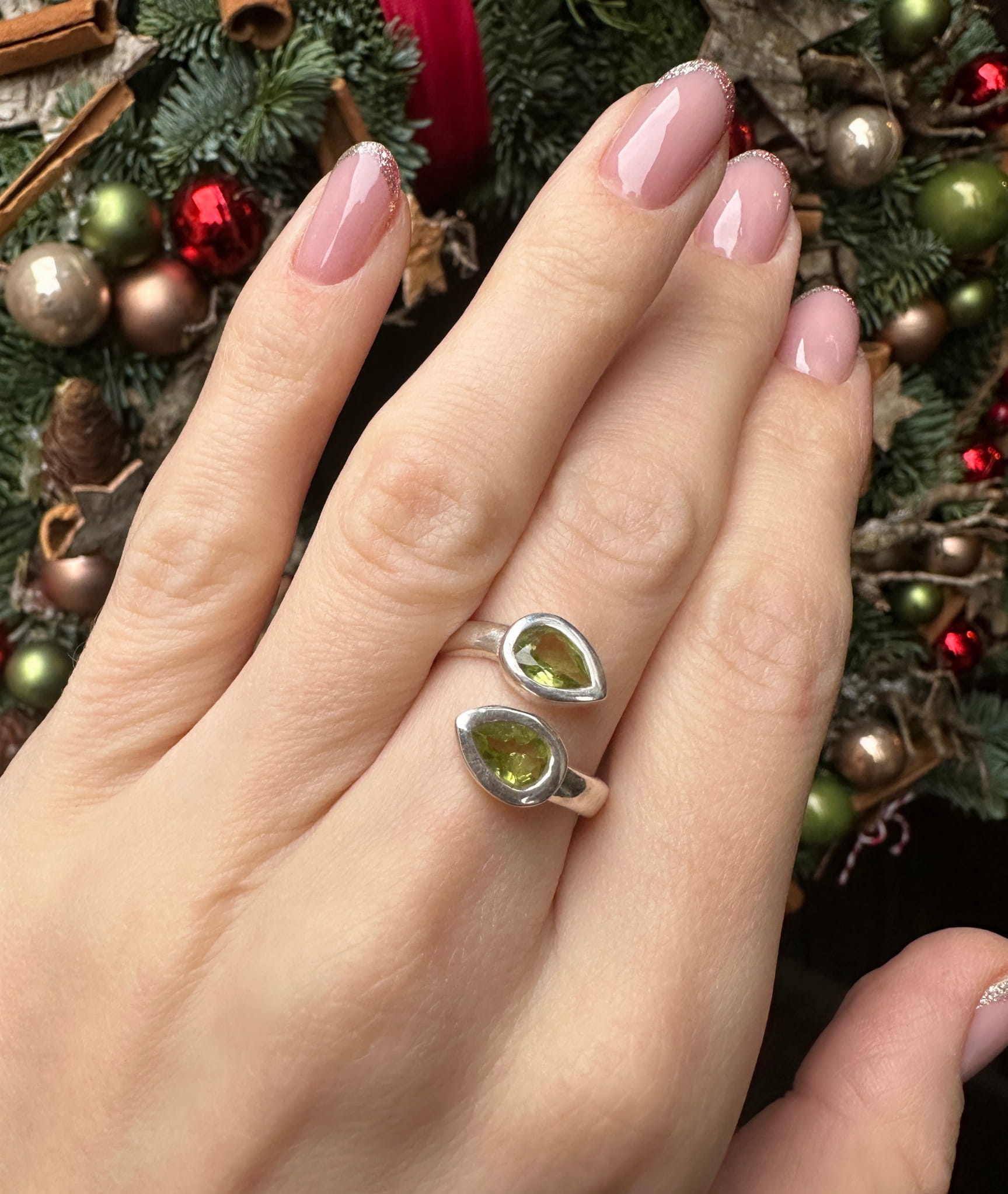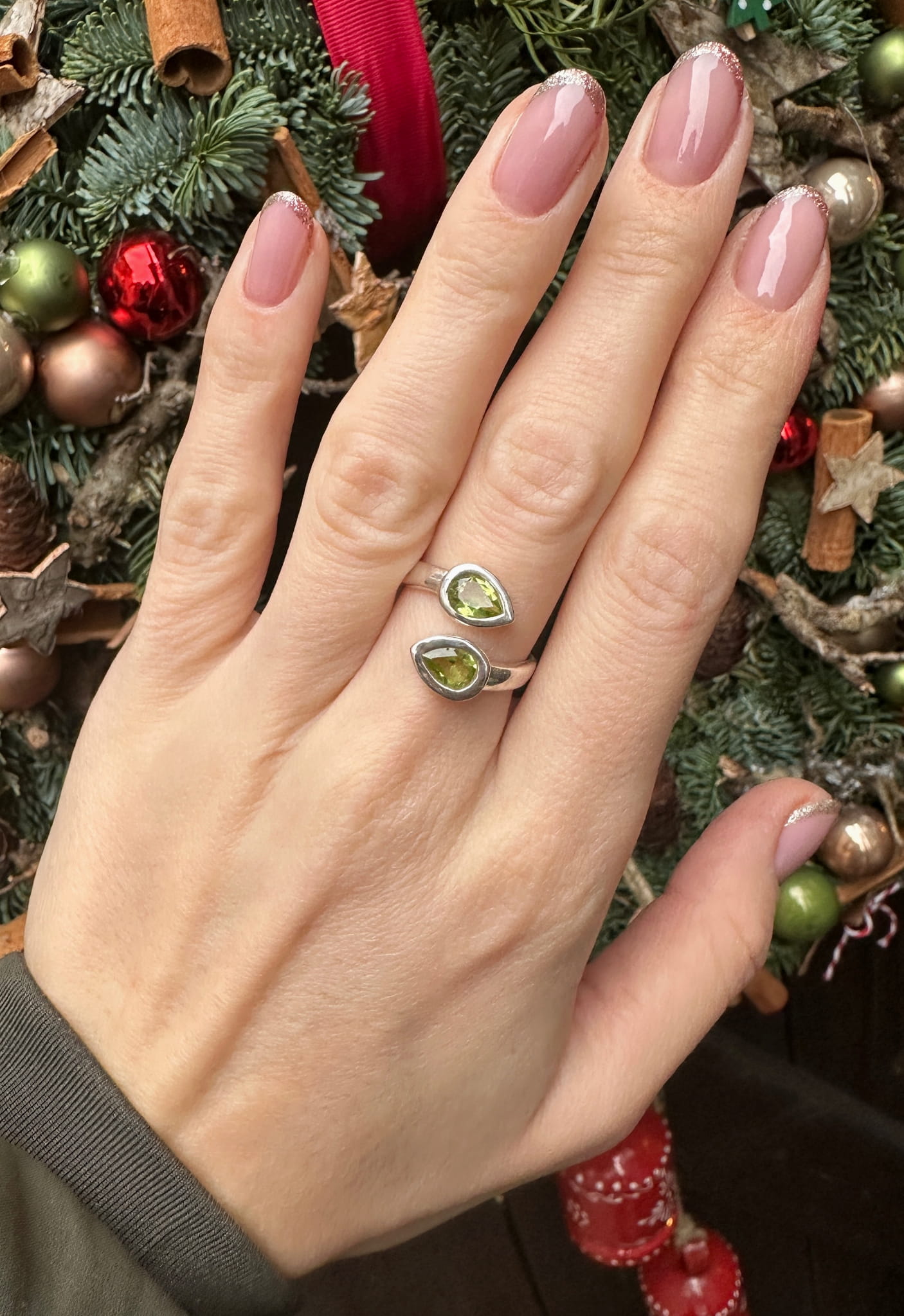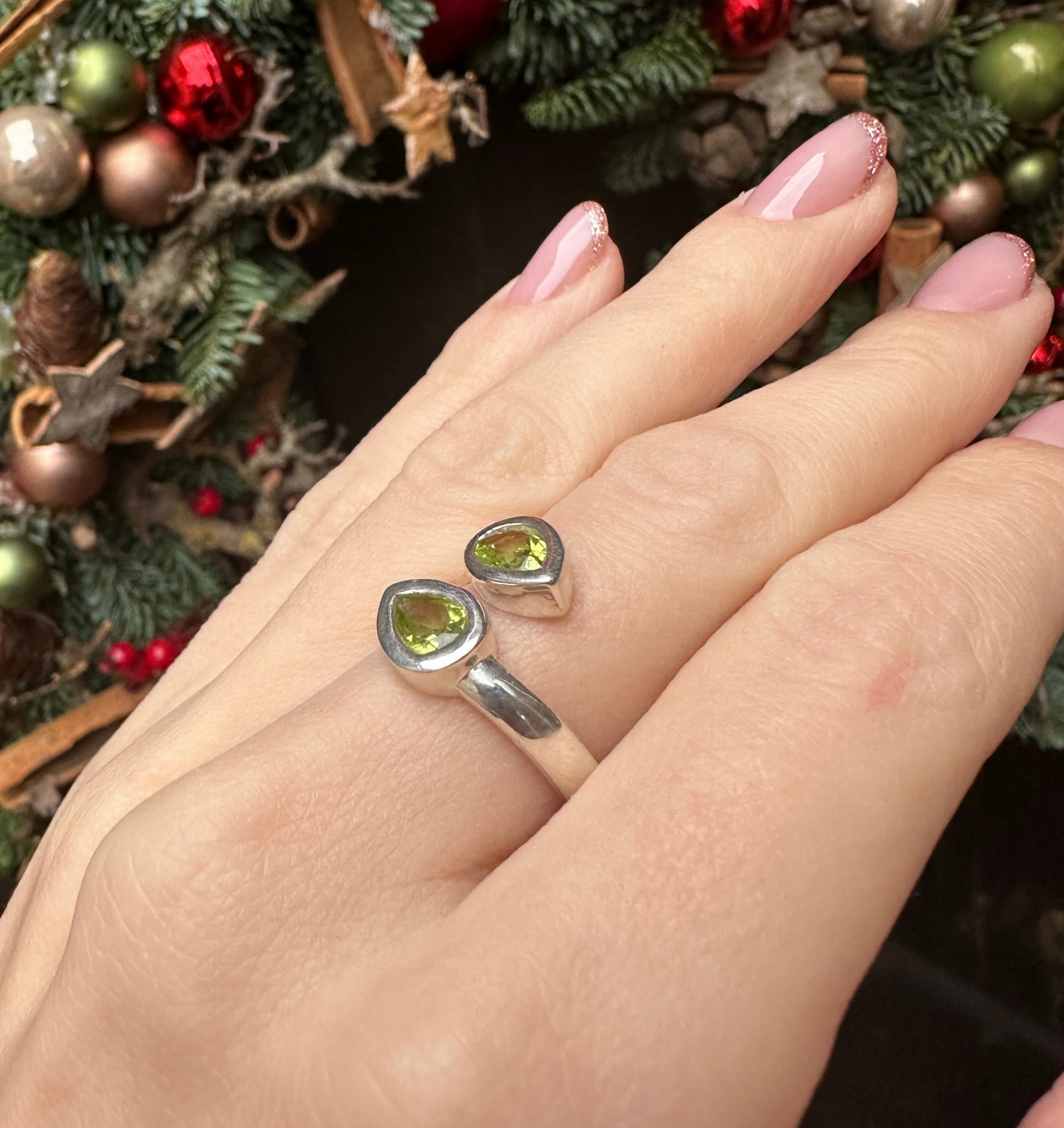 Ręcznie wykonany pierścionek z zielonych oliwinów fasetowanych i srebra pr.925