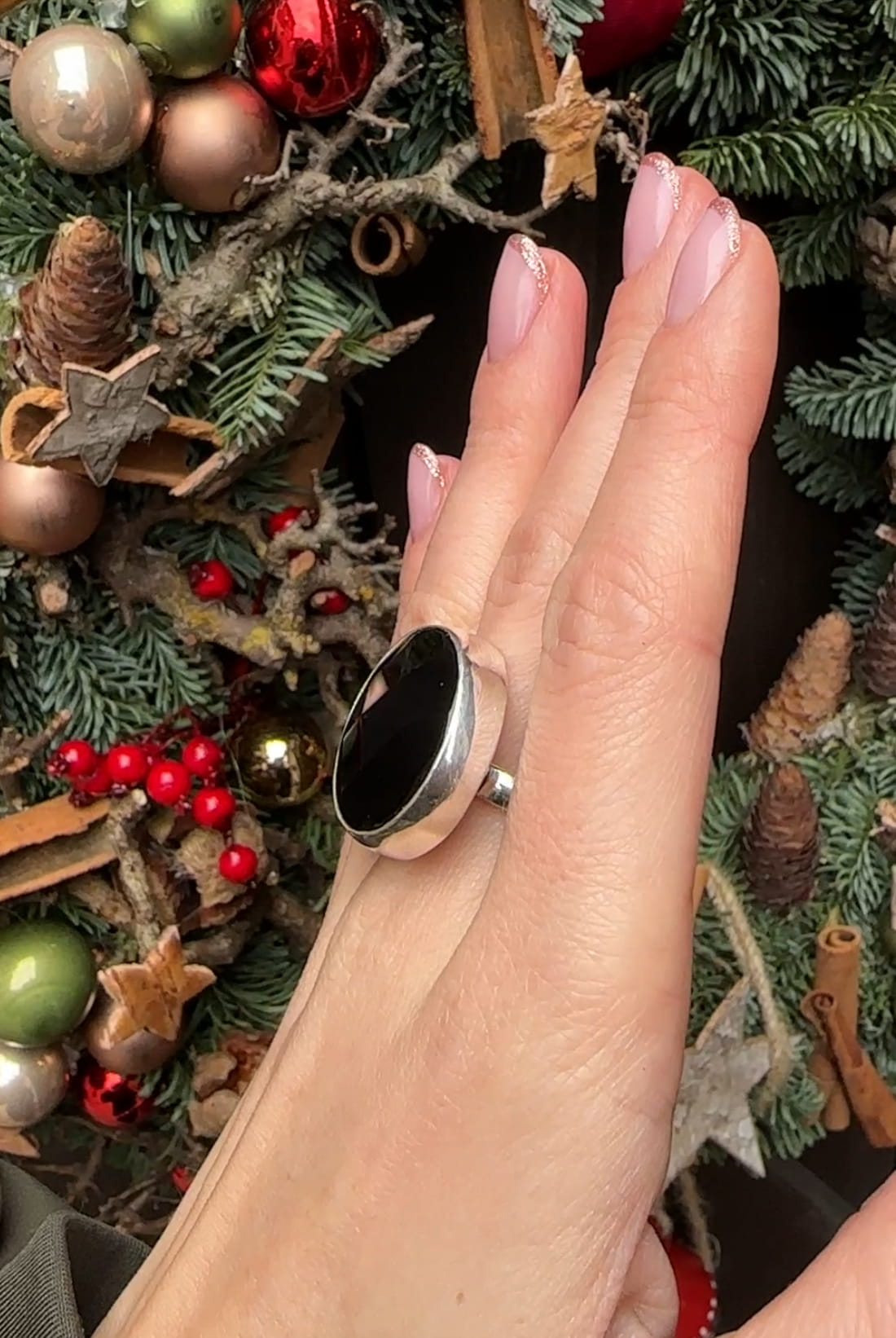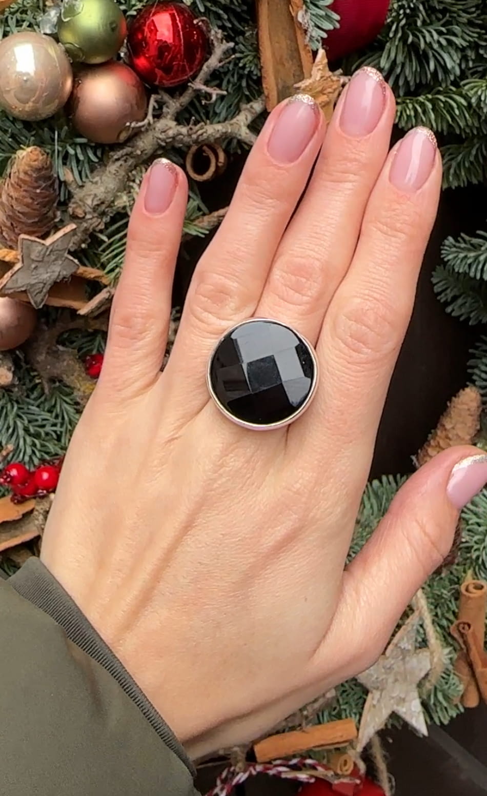 Ręcznie wykonany pierścionek z okrągłego, fasetowanego onyksu i srebra pr.925