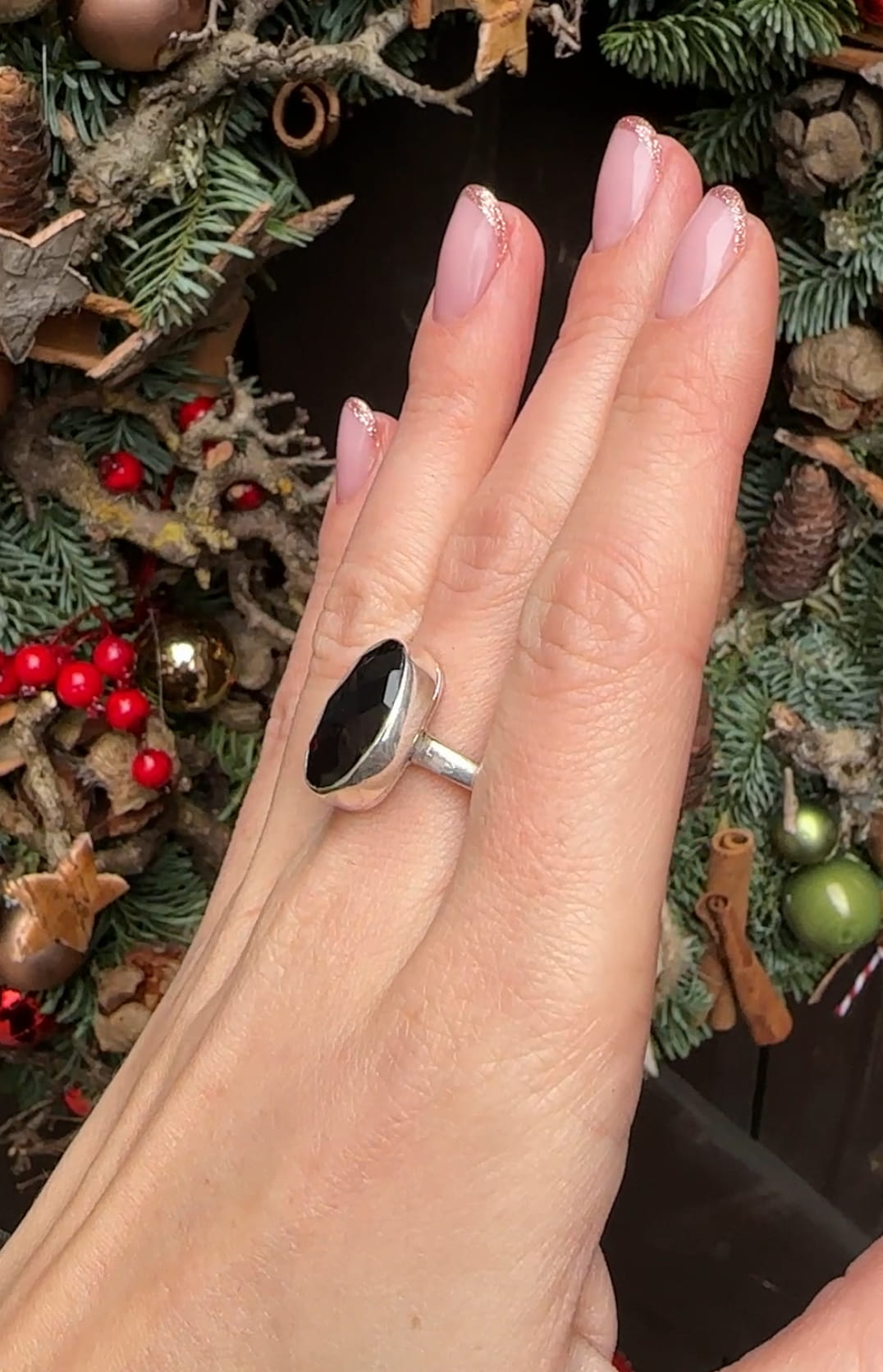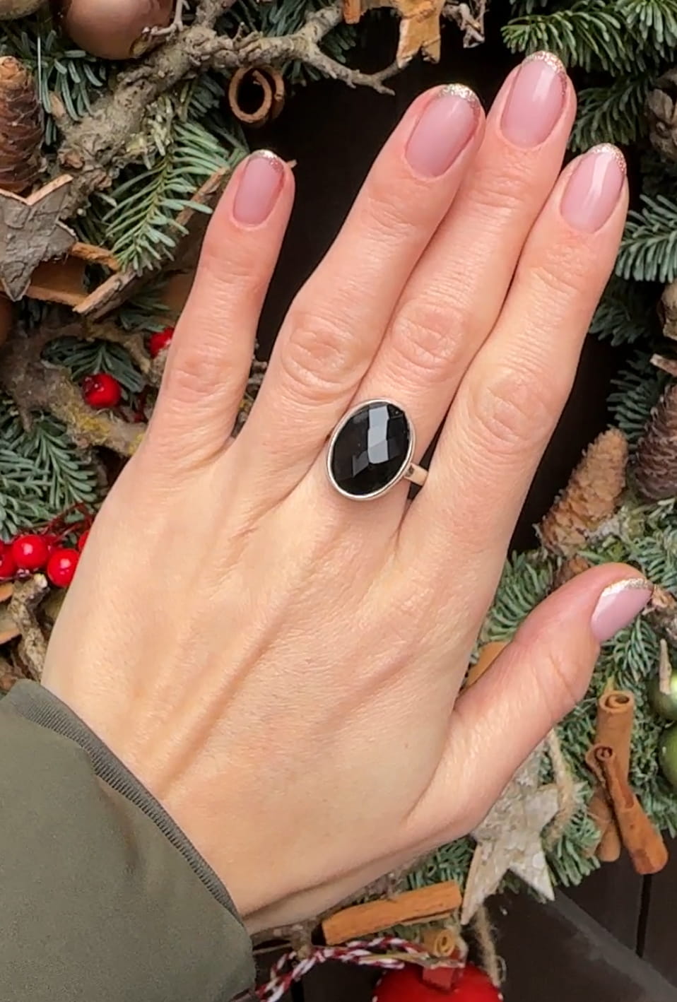 Ręcznie wykonany pierścionek z owalnego, fasetowanego onyksu i srebra pr.925