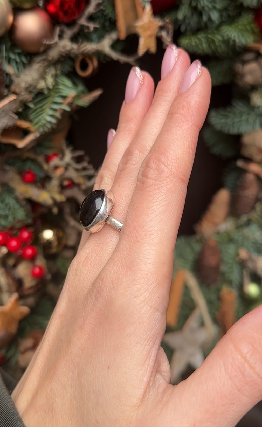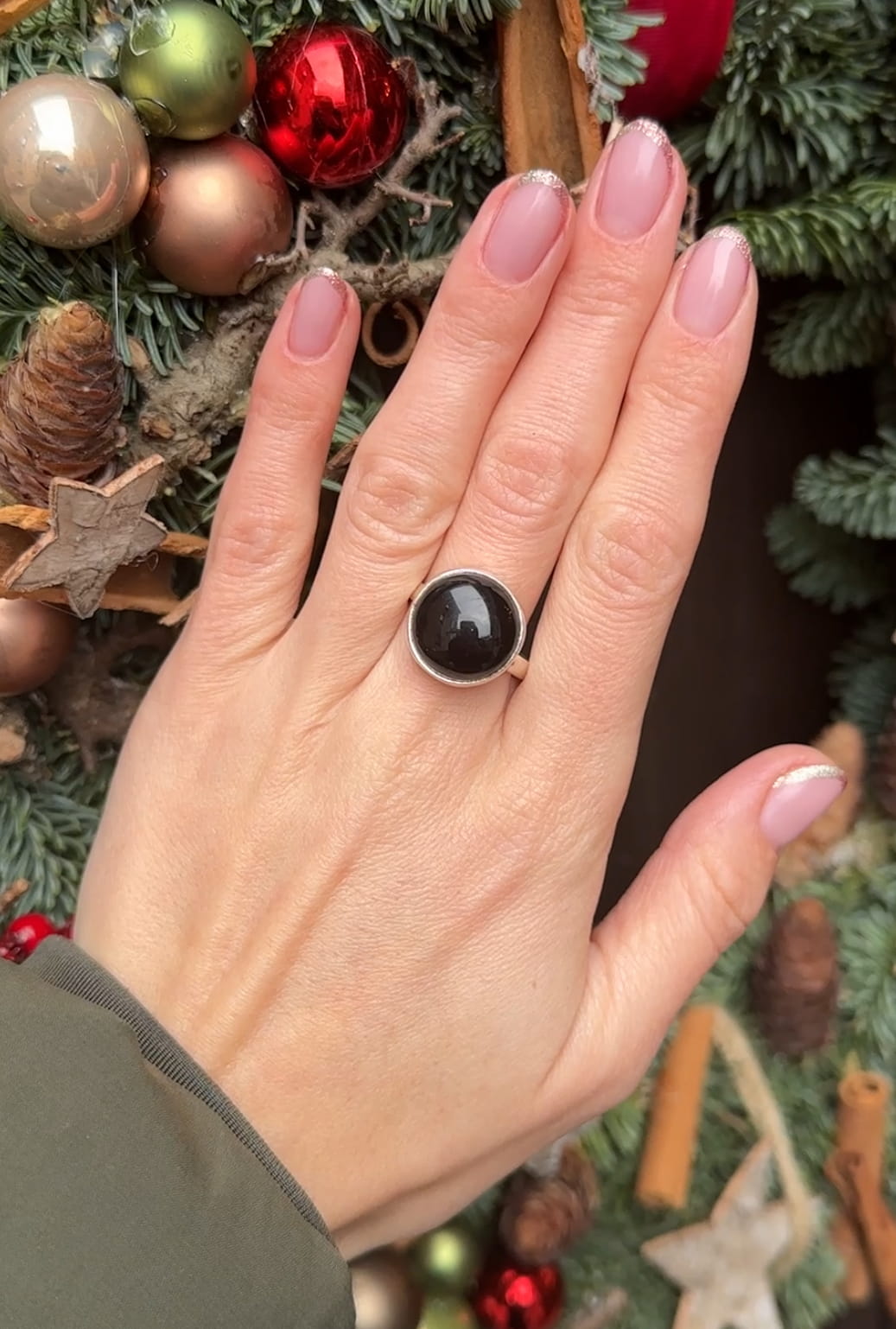 Ręcznie wykonany pierścionek z okrągłego, onyksu i srebra pr.925