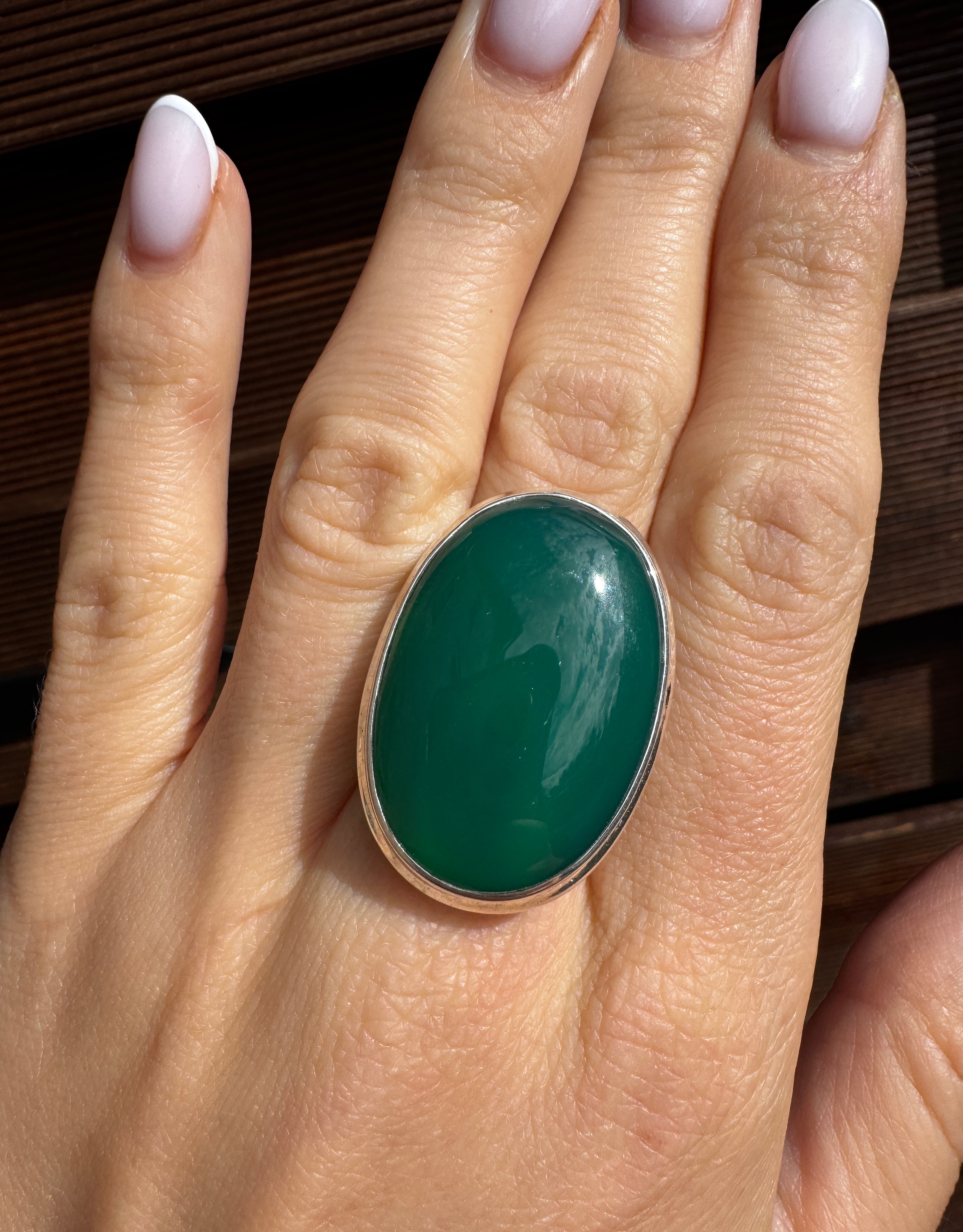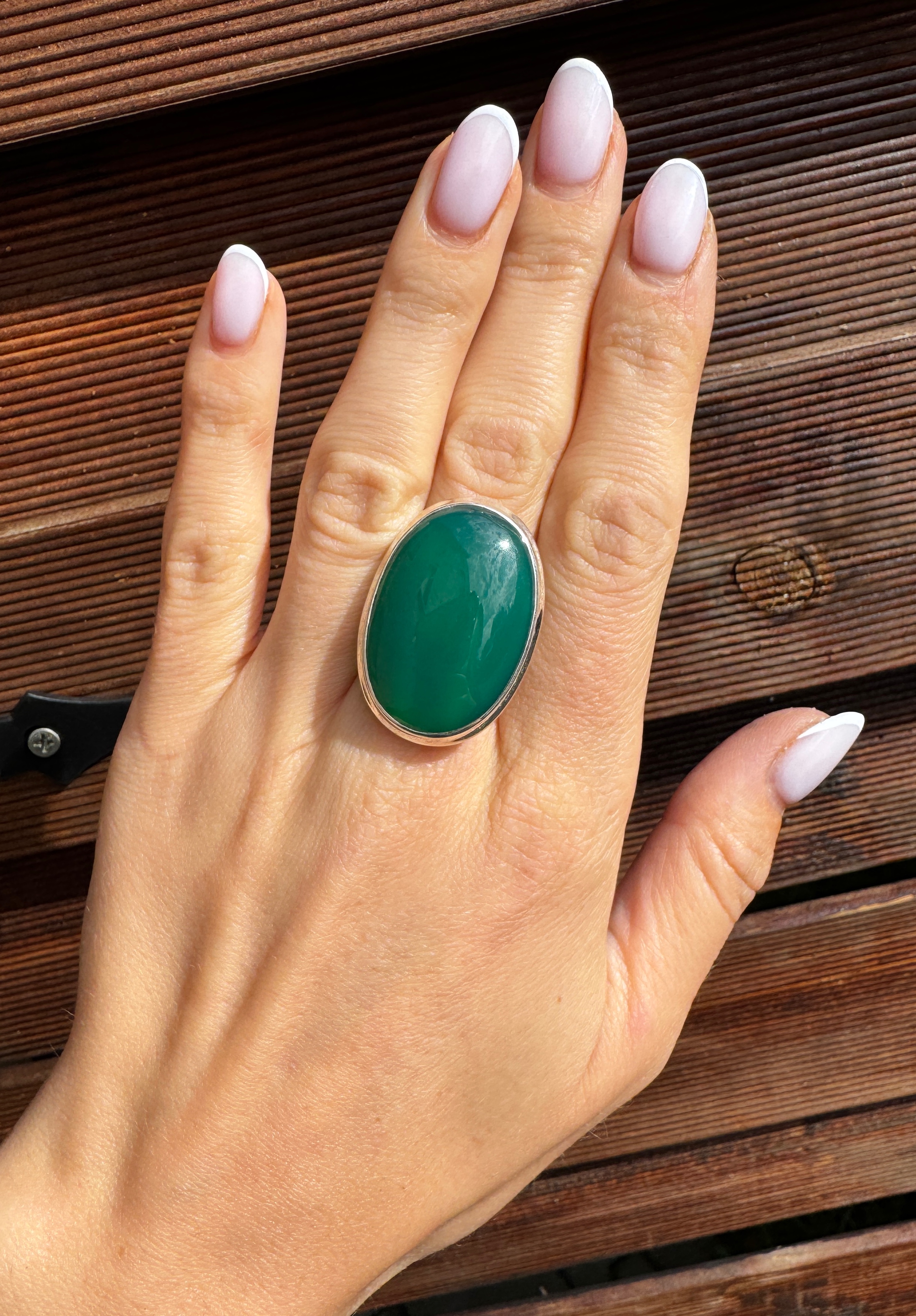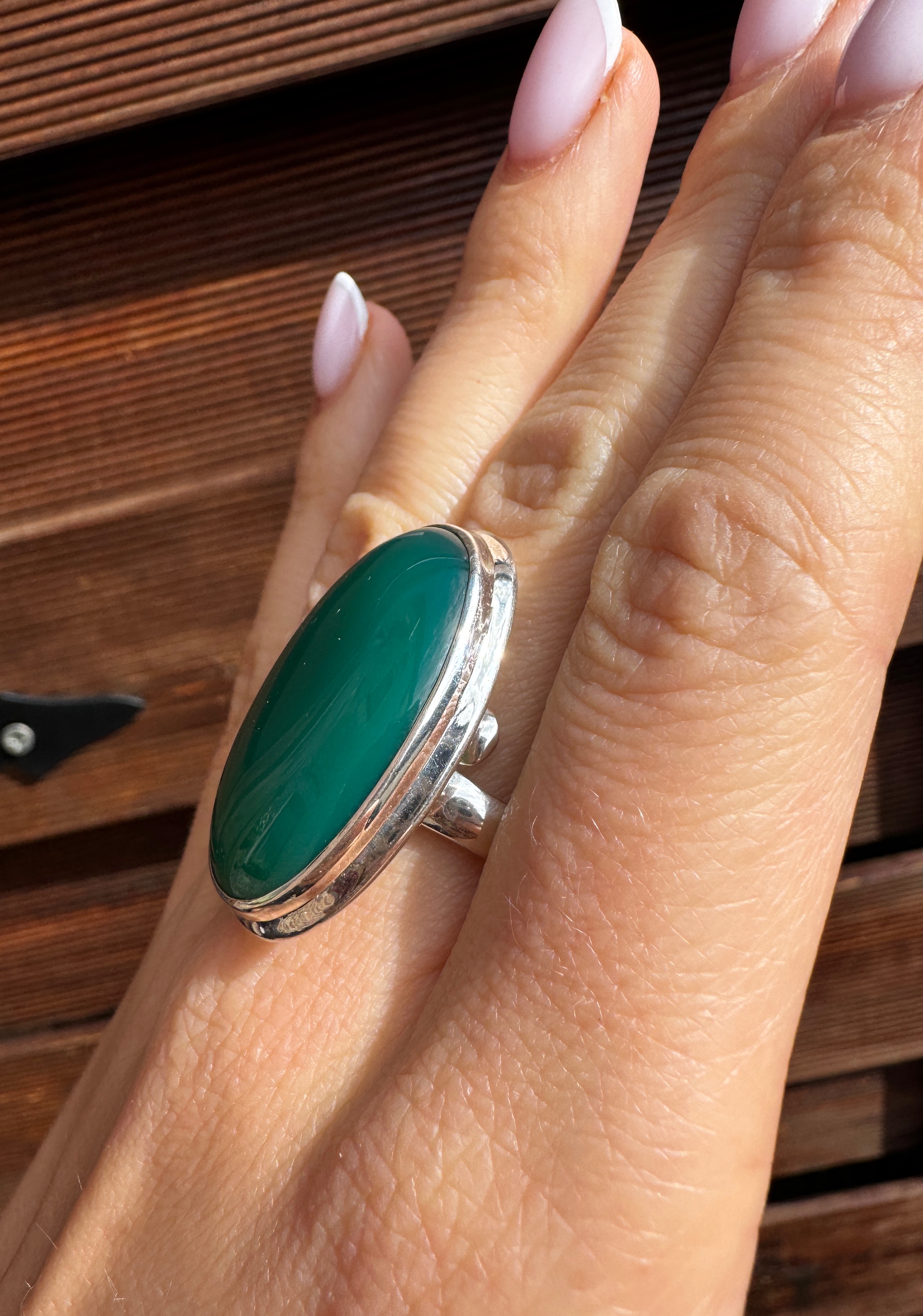 Ręcznie wykonany pierścionek z owalnego zielonego onyksu i srebra pr.925