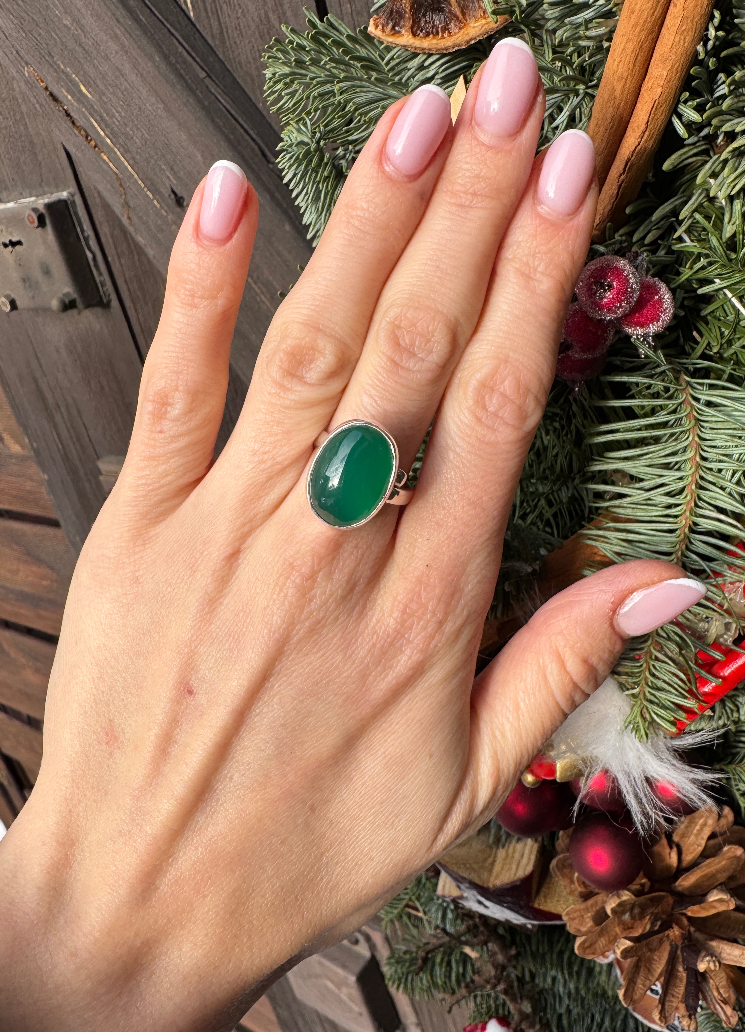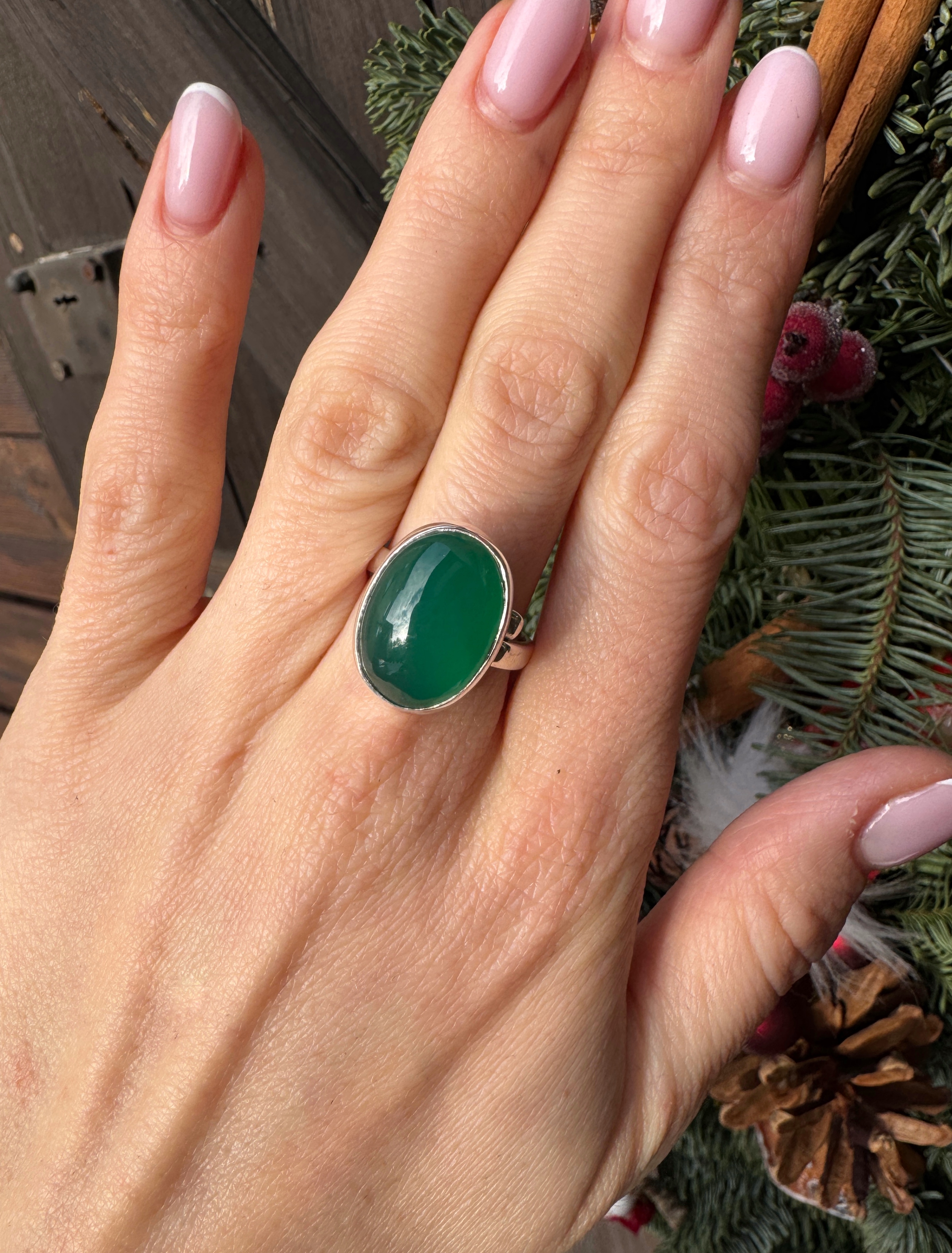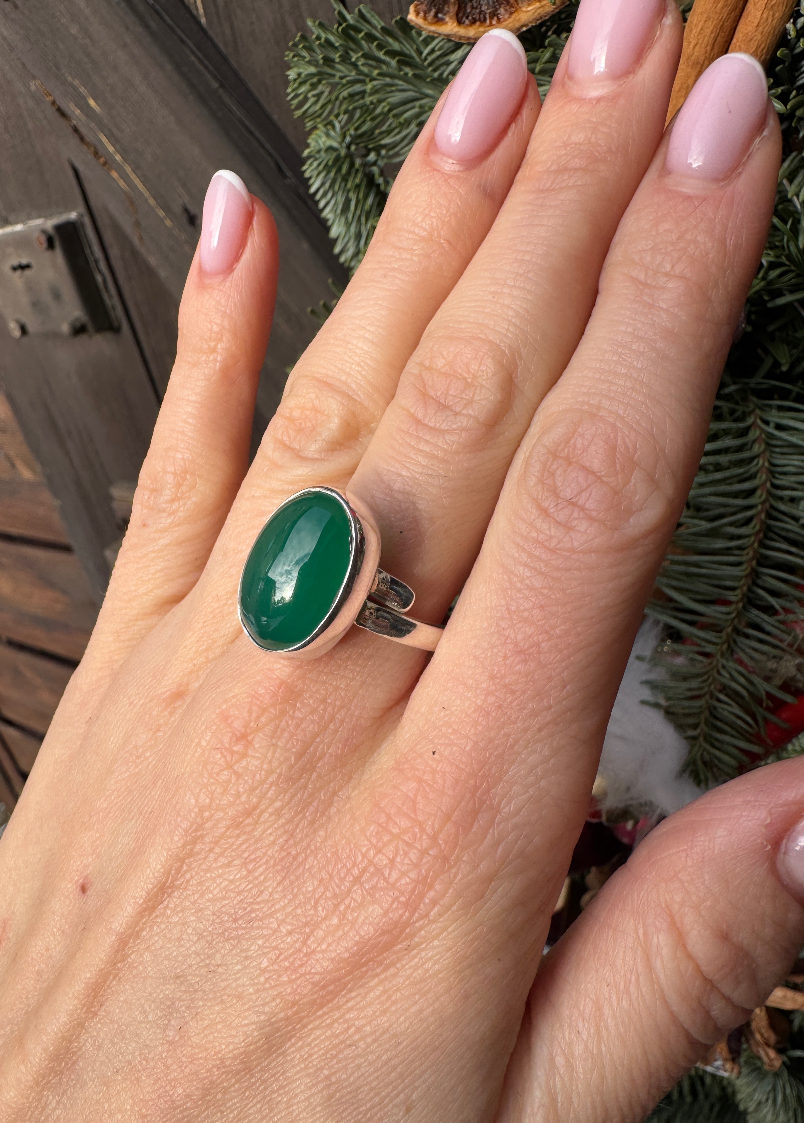 Ręcznie wykonany pierścionek z owalnego zielonego onyksu  i srebra pr.925