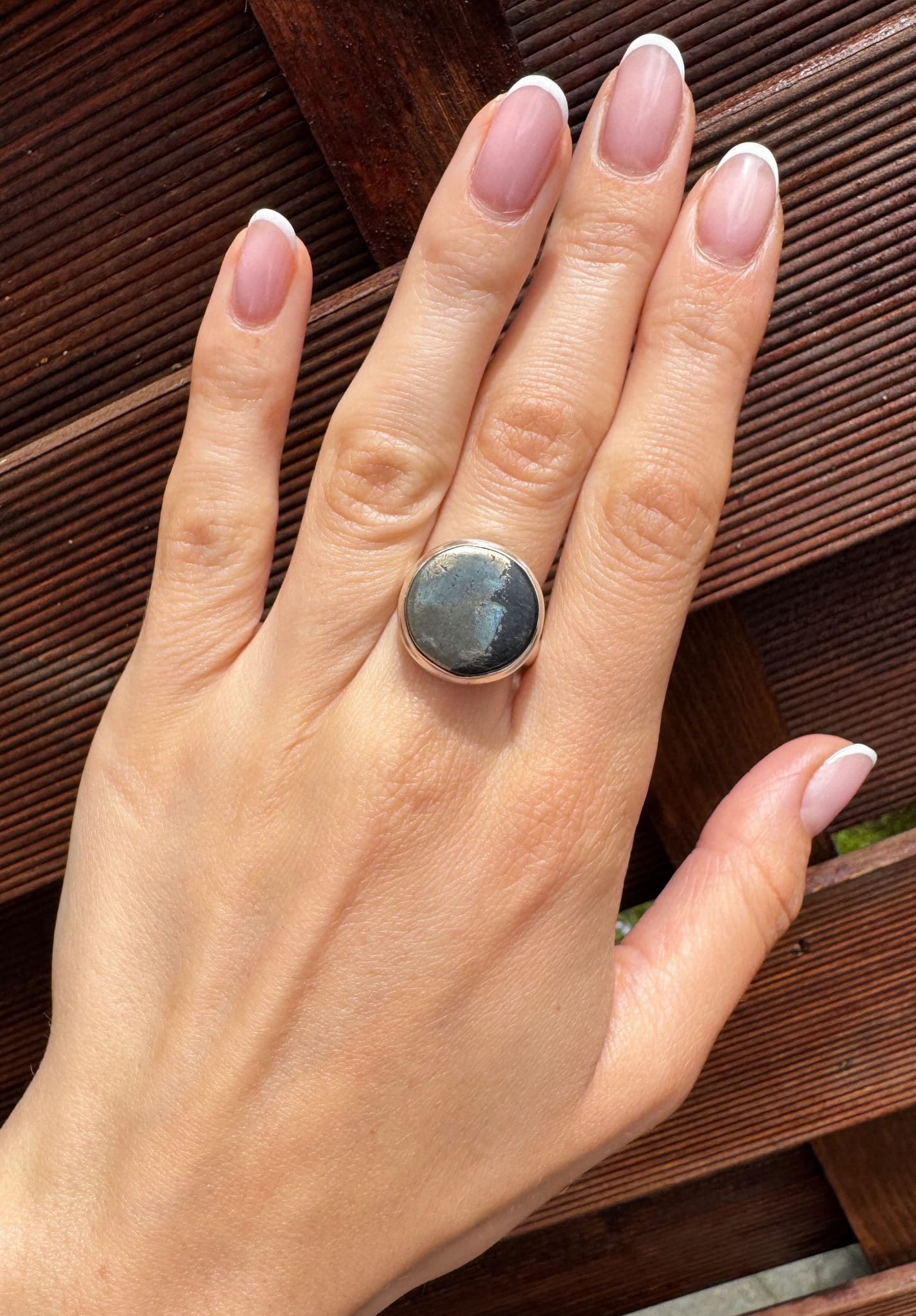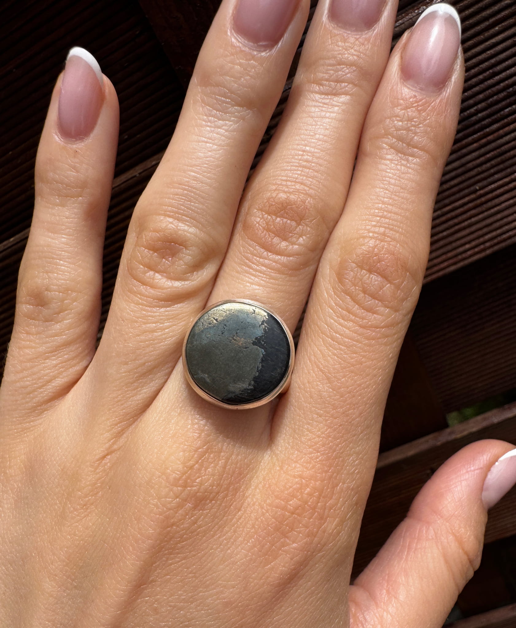 Ręcznie wykonany pierścionek z okrągłego pirytu i srebra pr.925