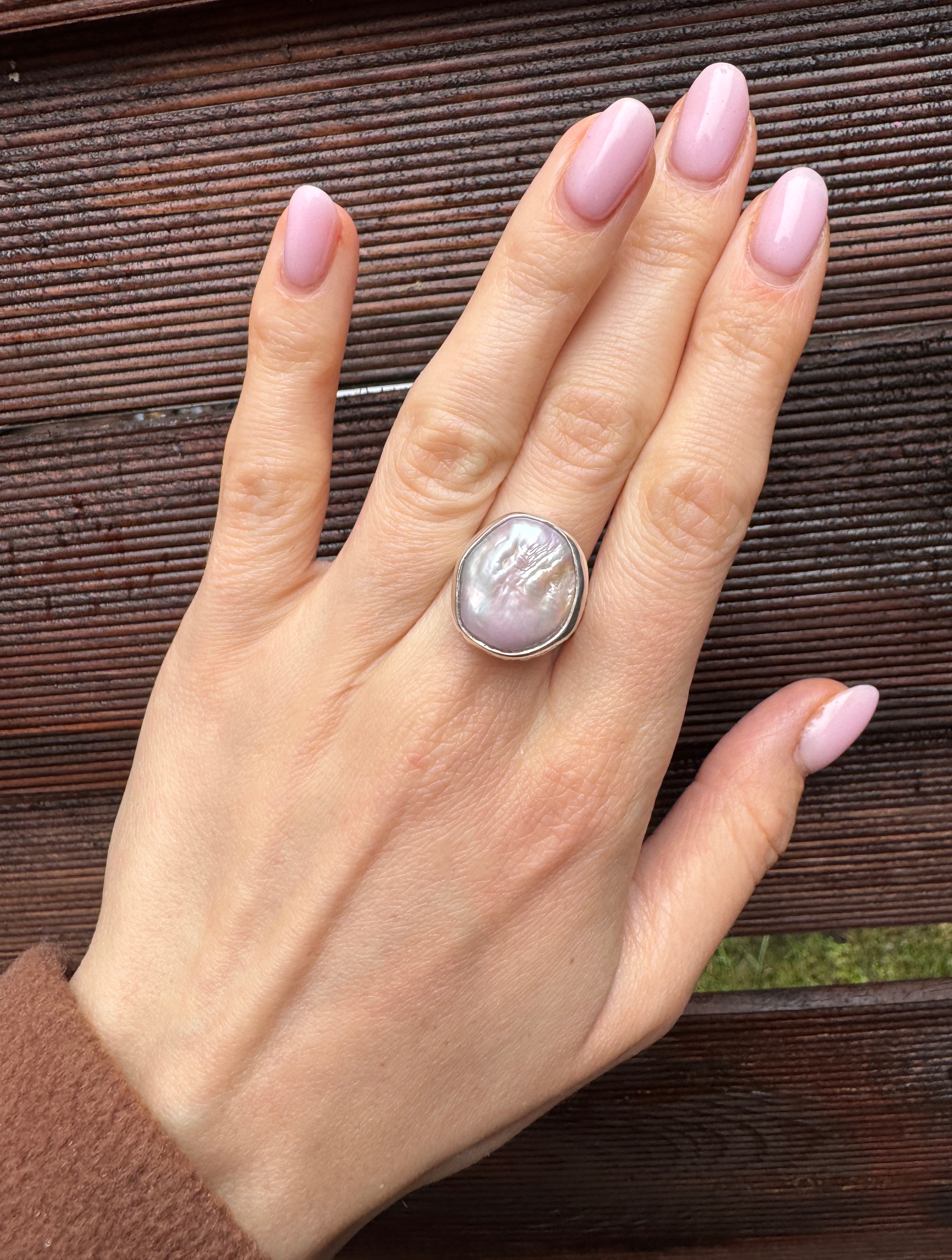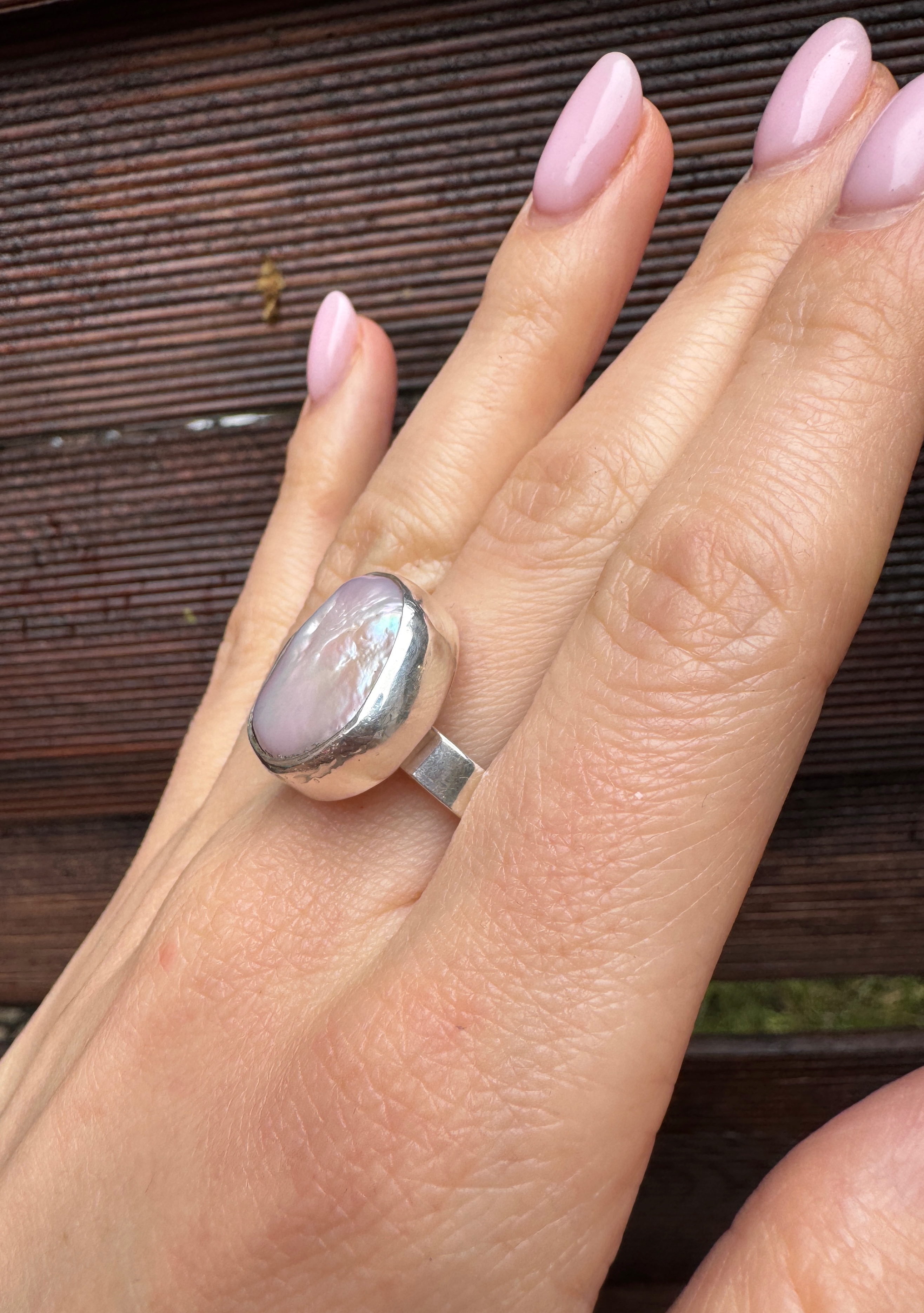 Ręcznie wykonany pierścionek z różowej perły hodowlanej i srebra pr.925.