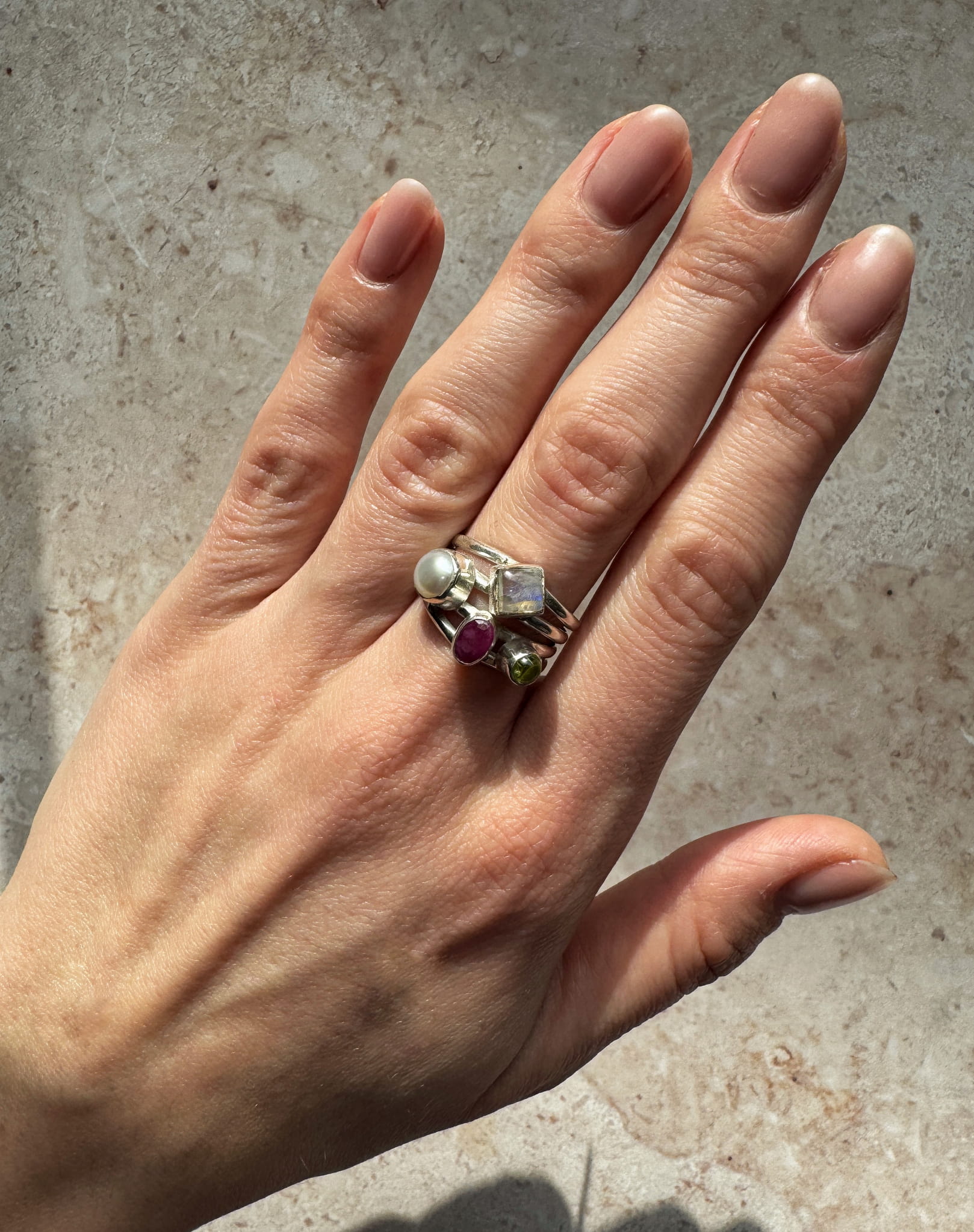 Różowy ręcznie wykonany pierścionek z fasetowanego rubinu, zielonego oliwinu, białej perły hodowanej, kamienia księżycowego i srebra pr.925