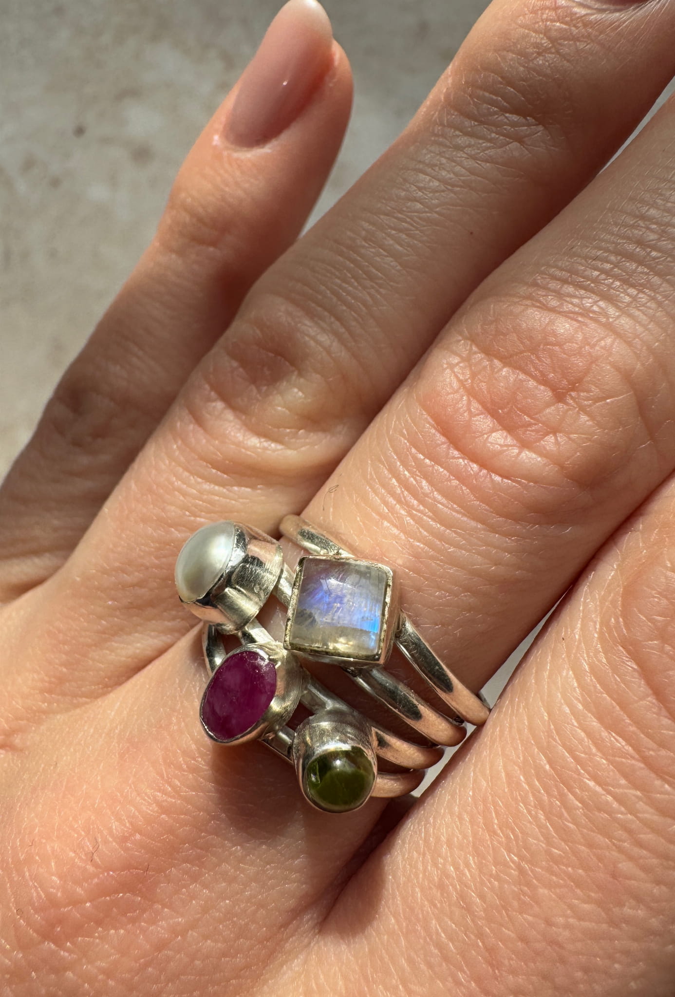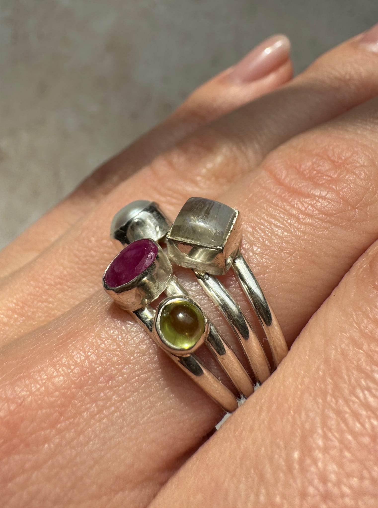 Pierścionek rubin, oliwin, perła i kamień księżycowy
