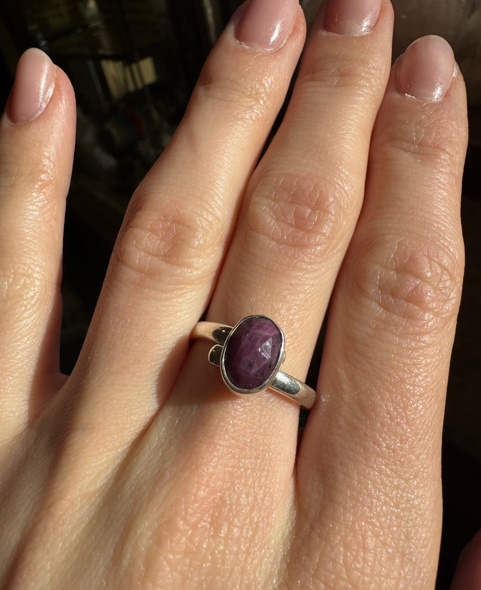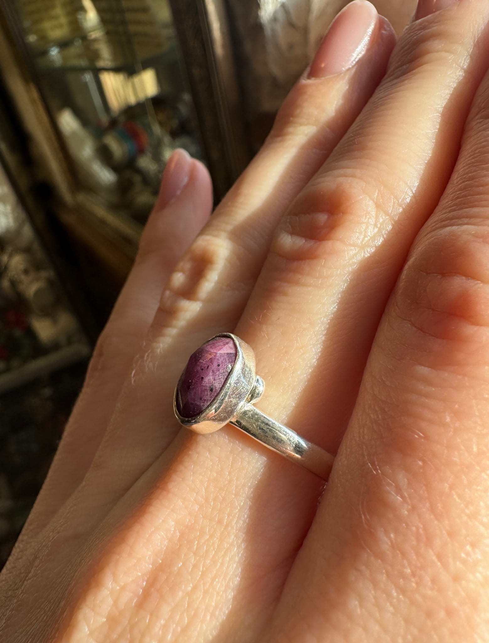 Różowy ręcznie wykonany pierścionek z fasetowanego rubinu i srebra pr.925