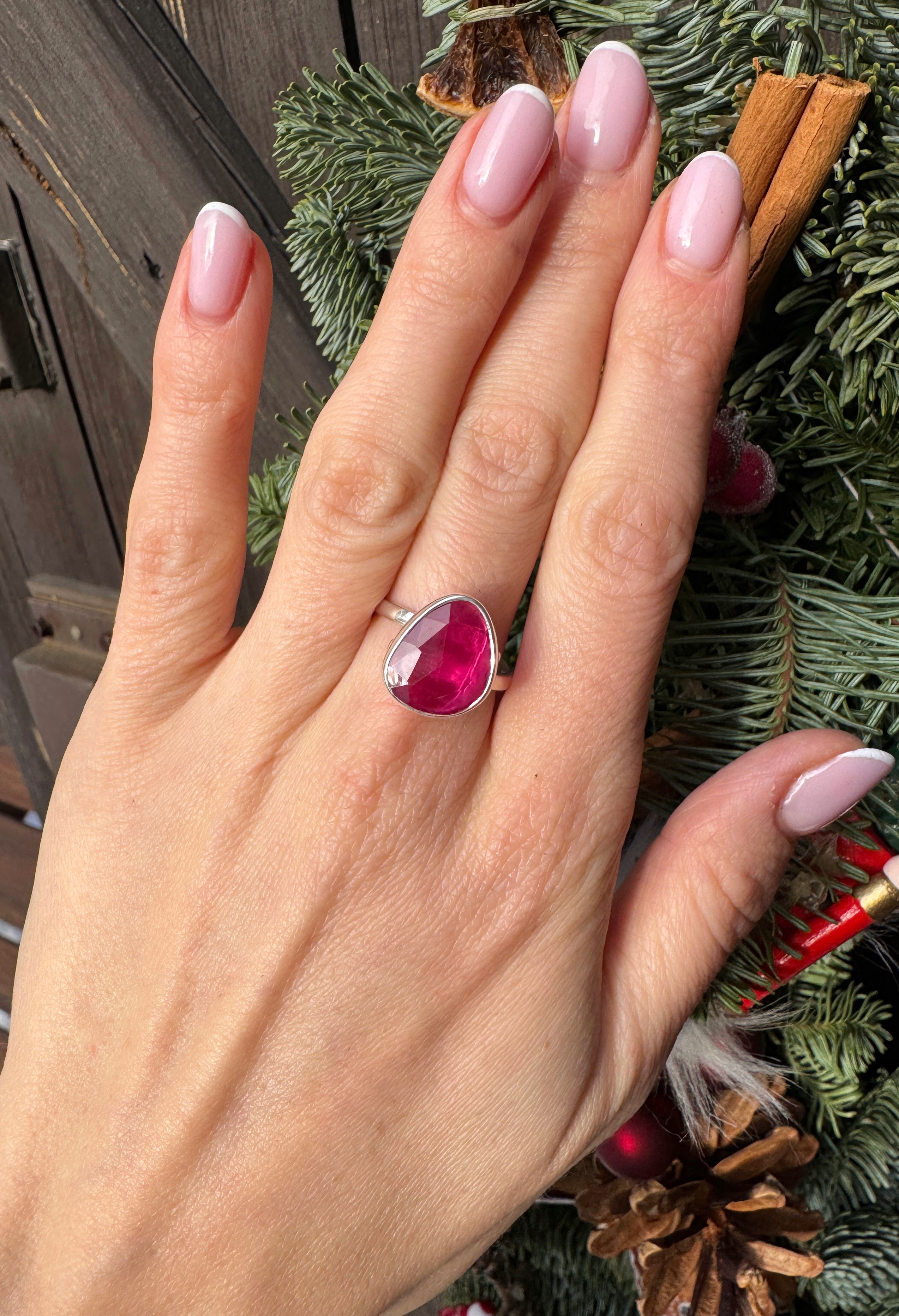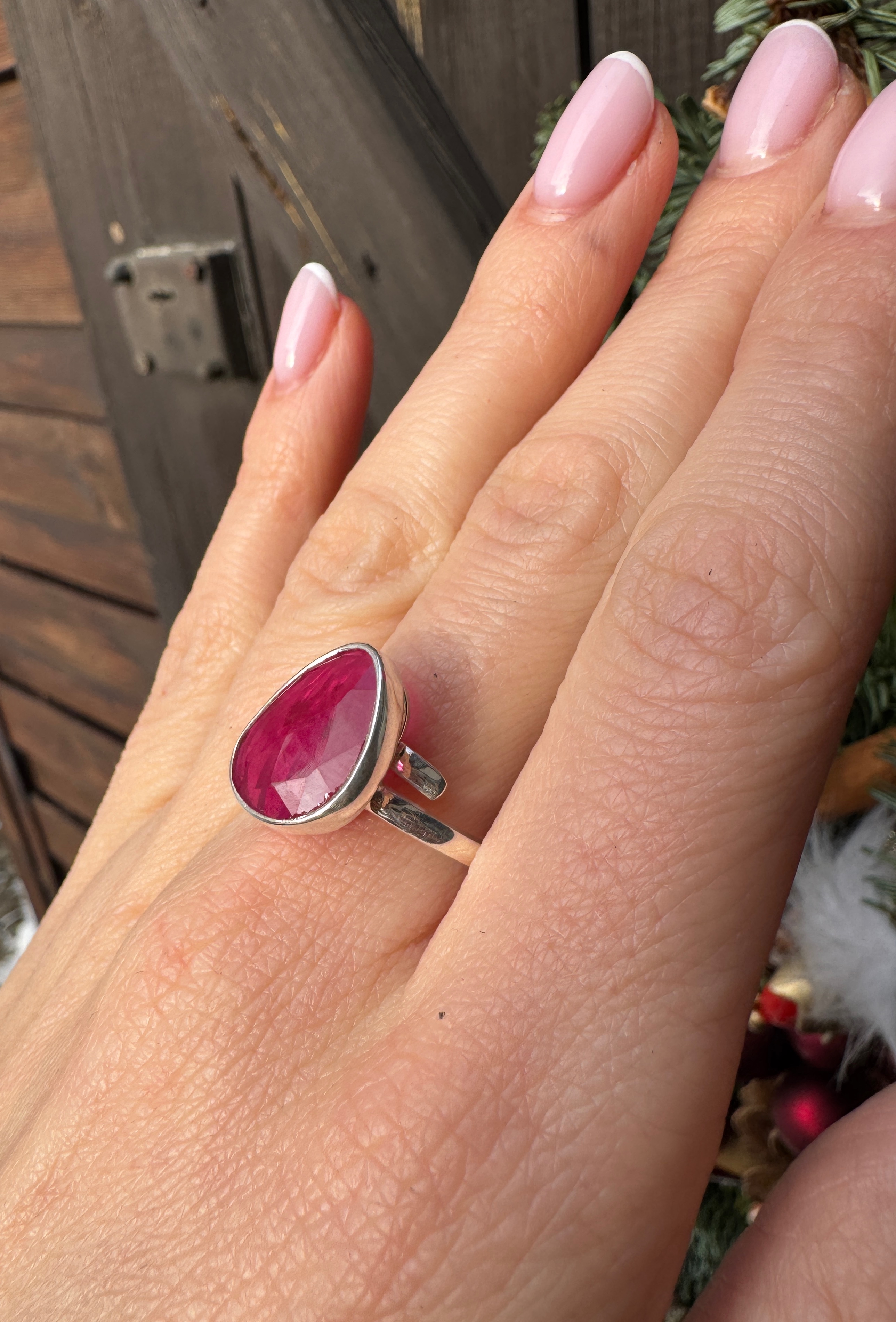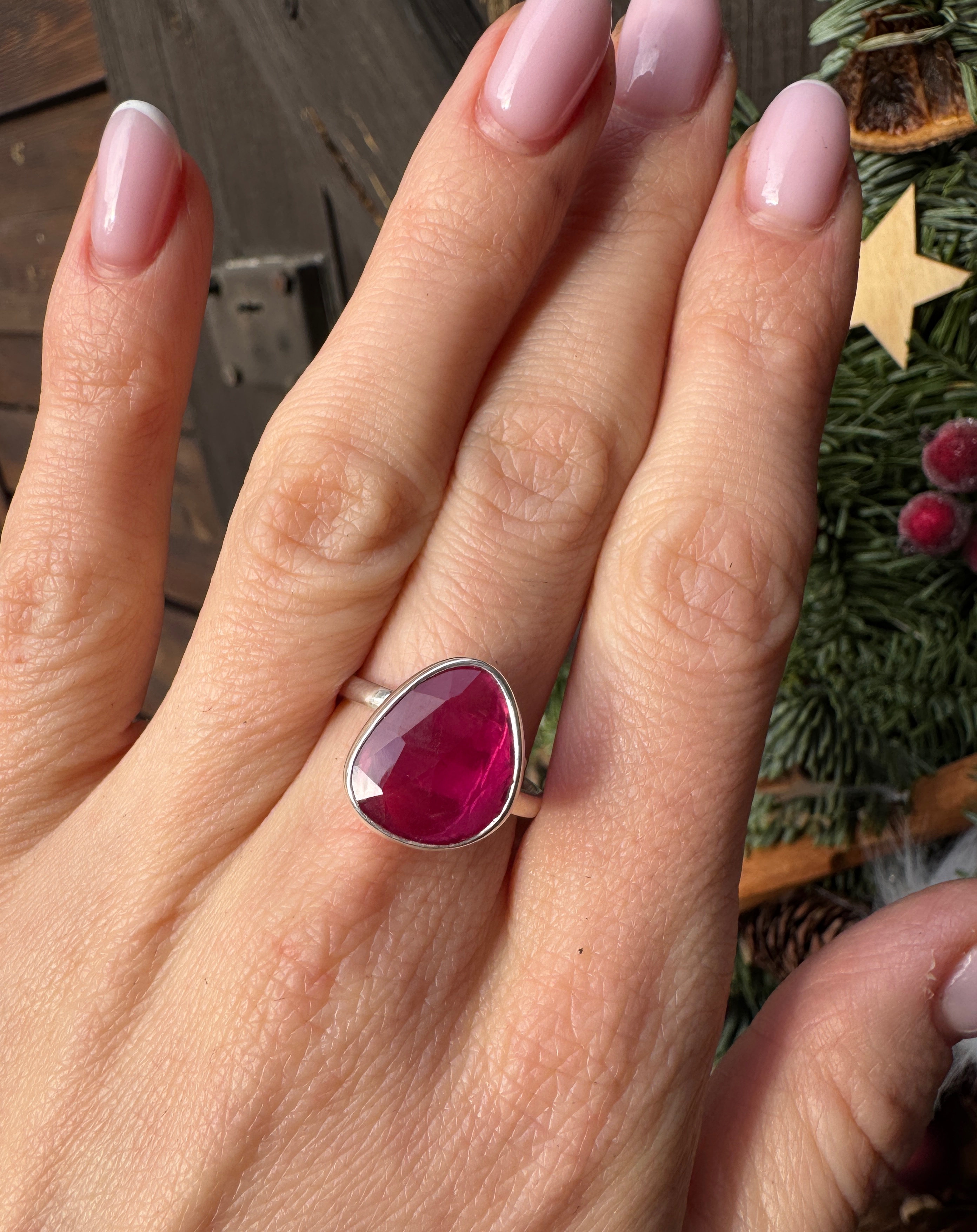Różowy ręcznie wykonany pierścionek z fasetowanego rubinu i srebra pr.925