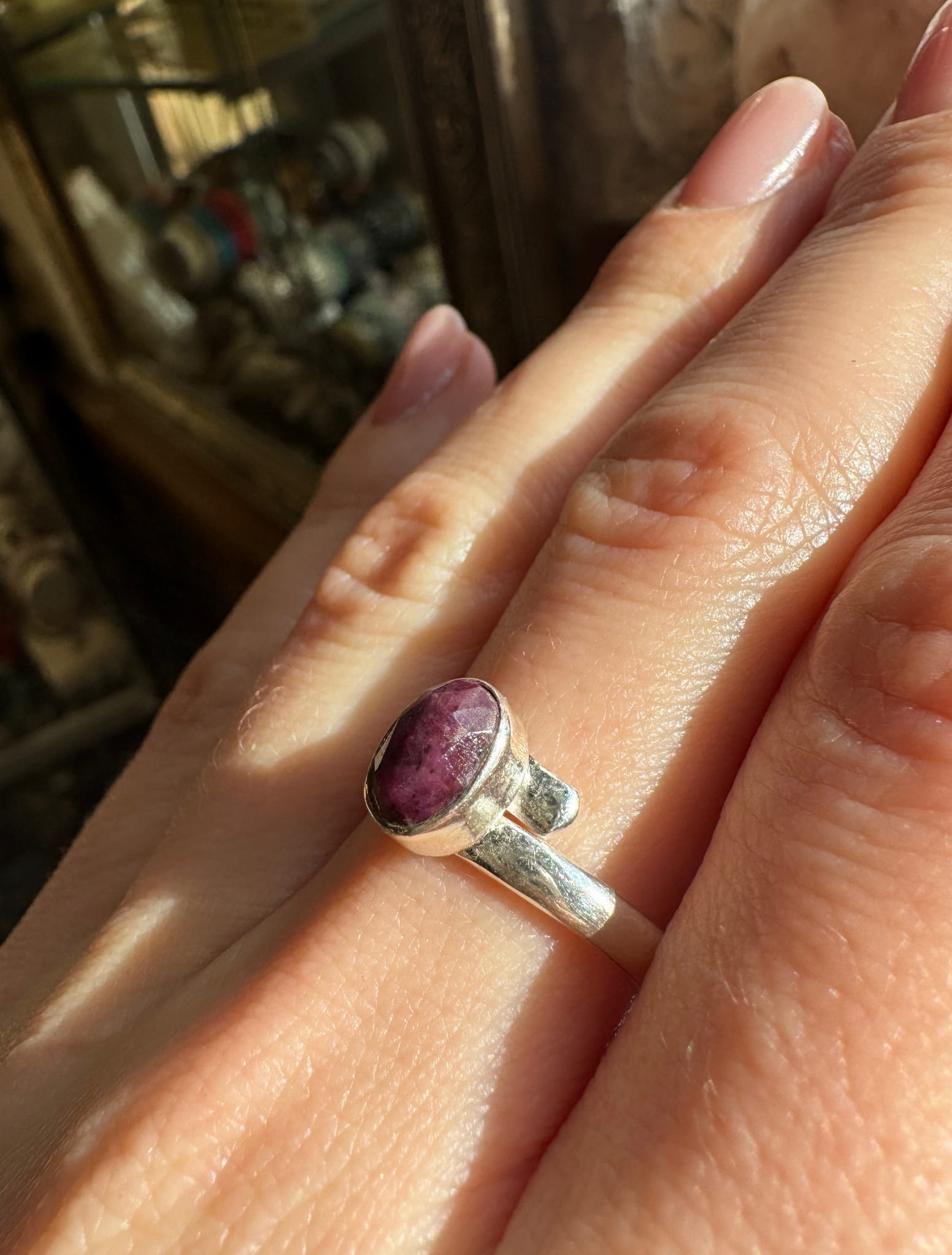 Różowy ręcznie wykonany pierścionek z fasetowanego rubinu i srebra pr.925