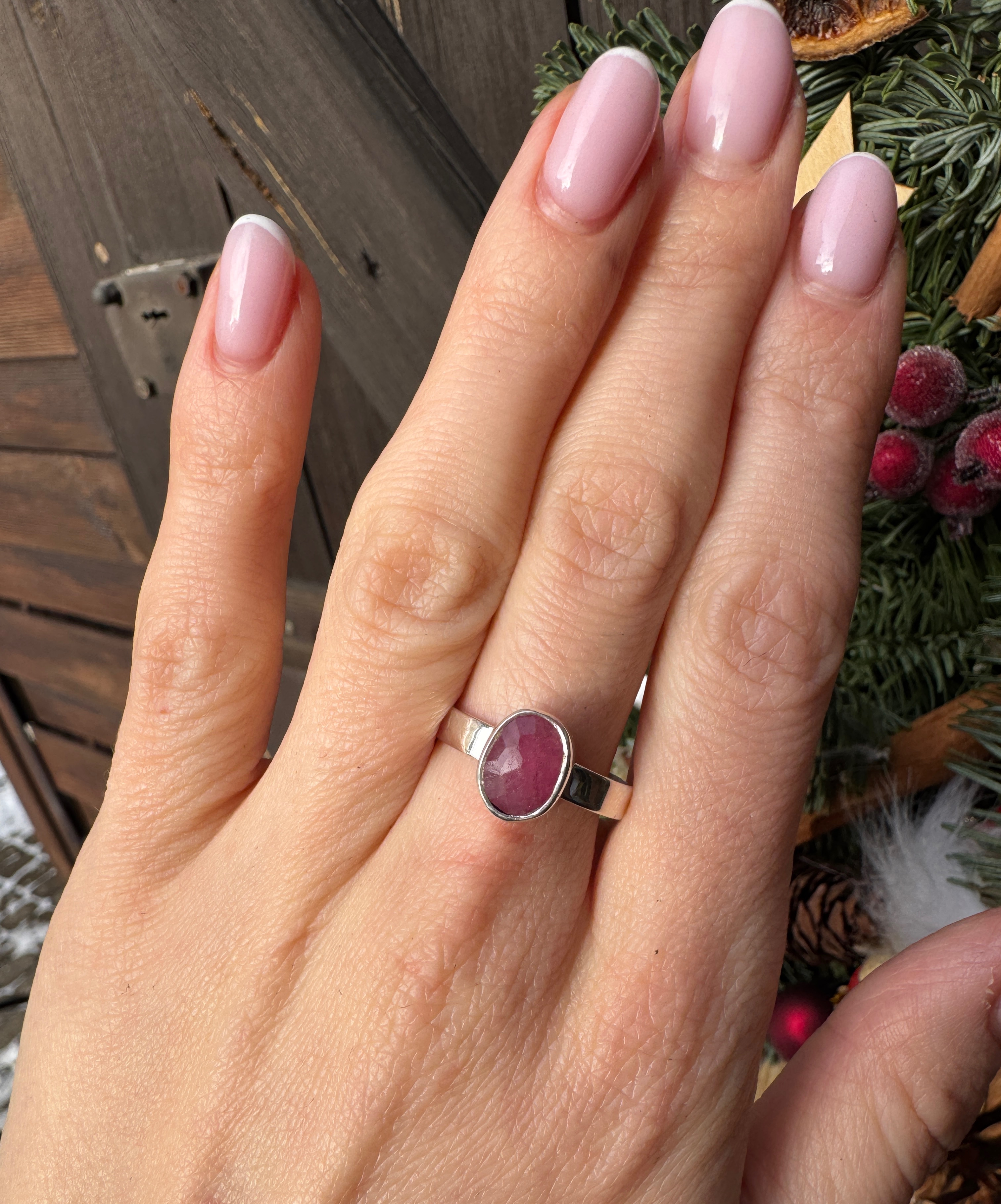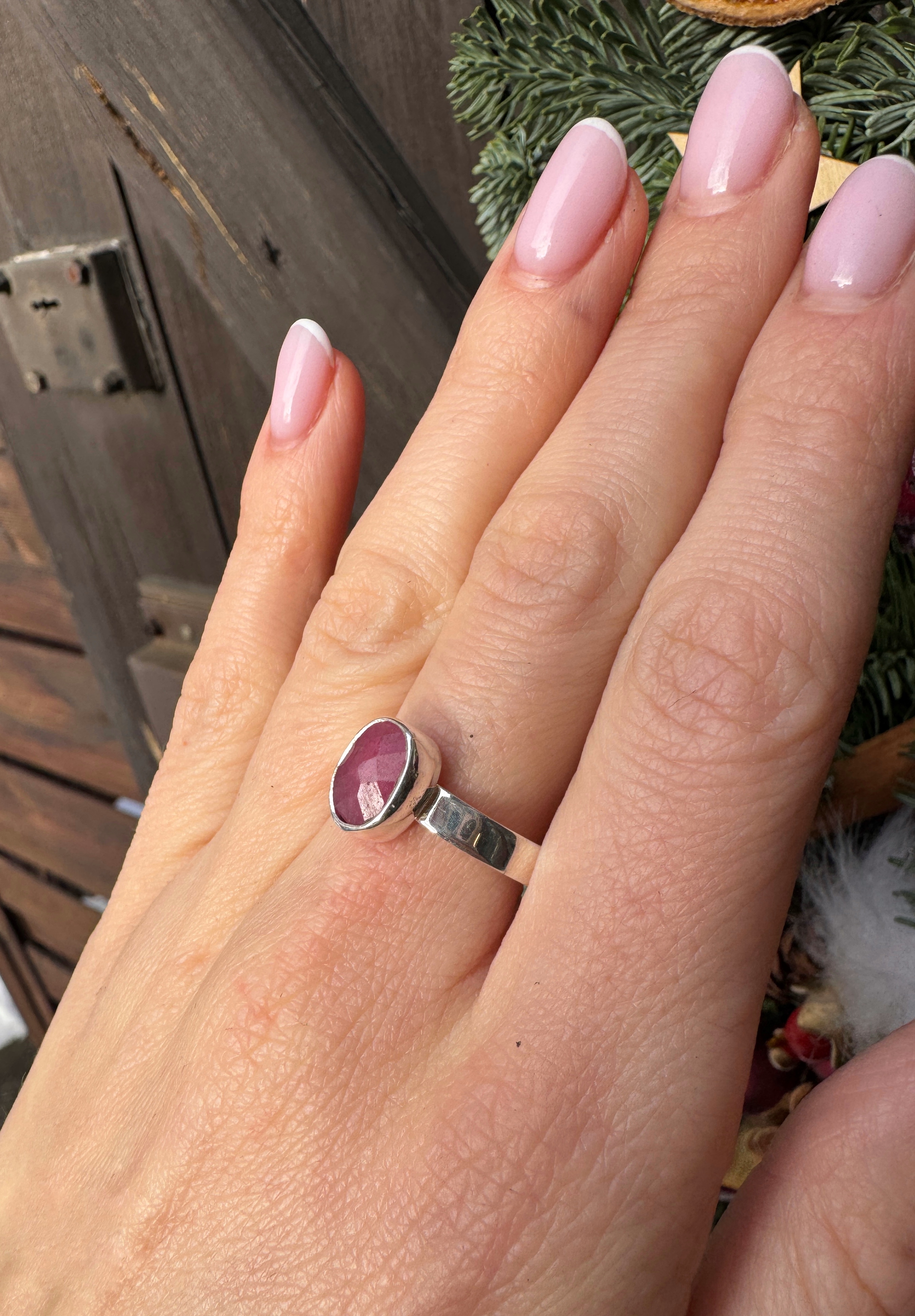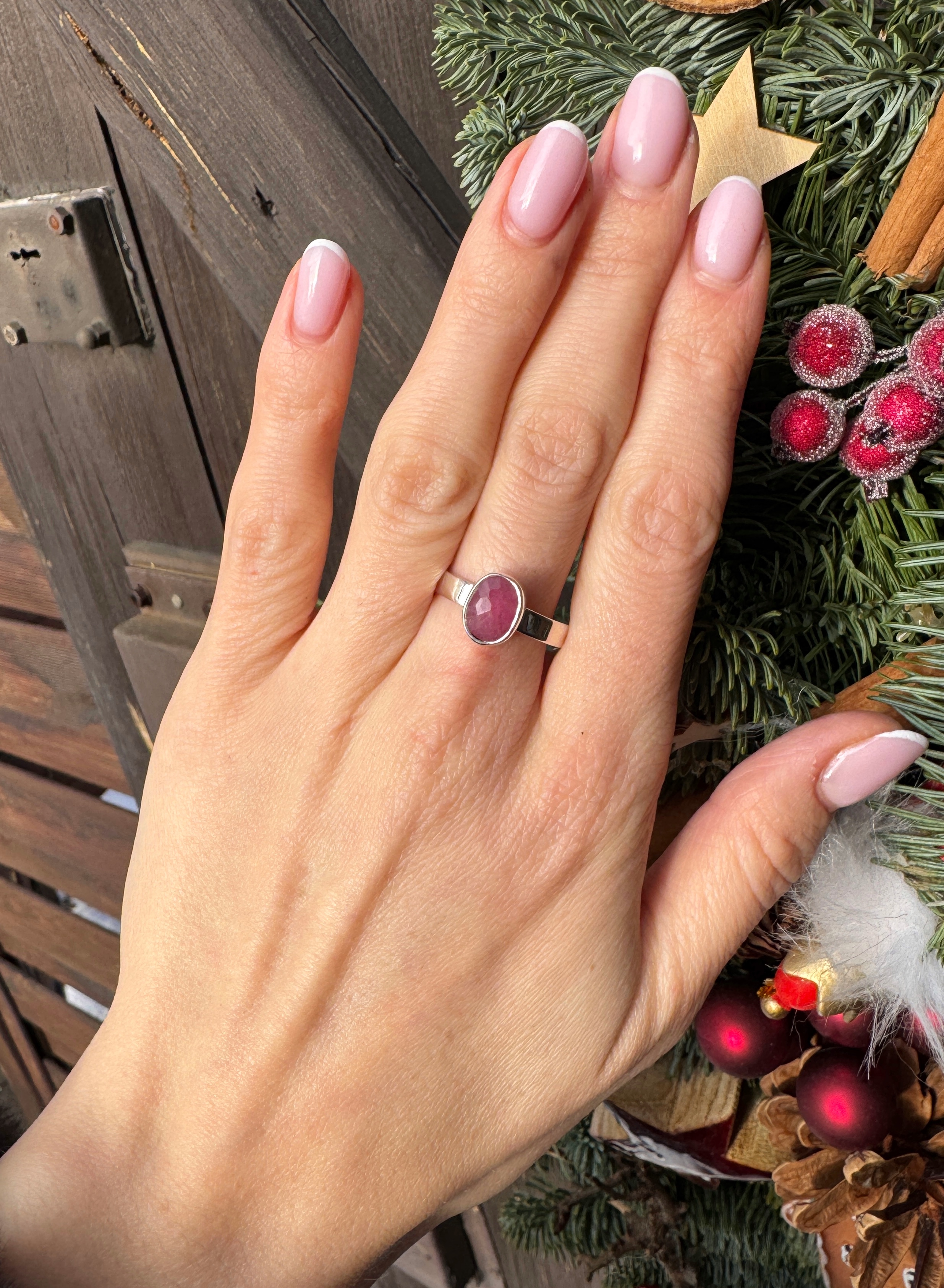 Różowy ręcznie wykonany pierścionek z rubinu i srebra pr.925