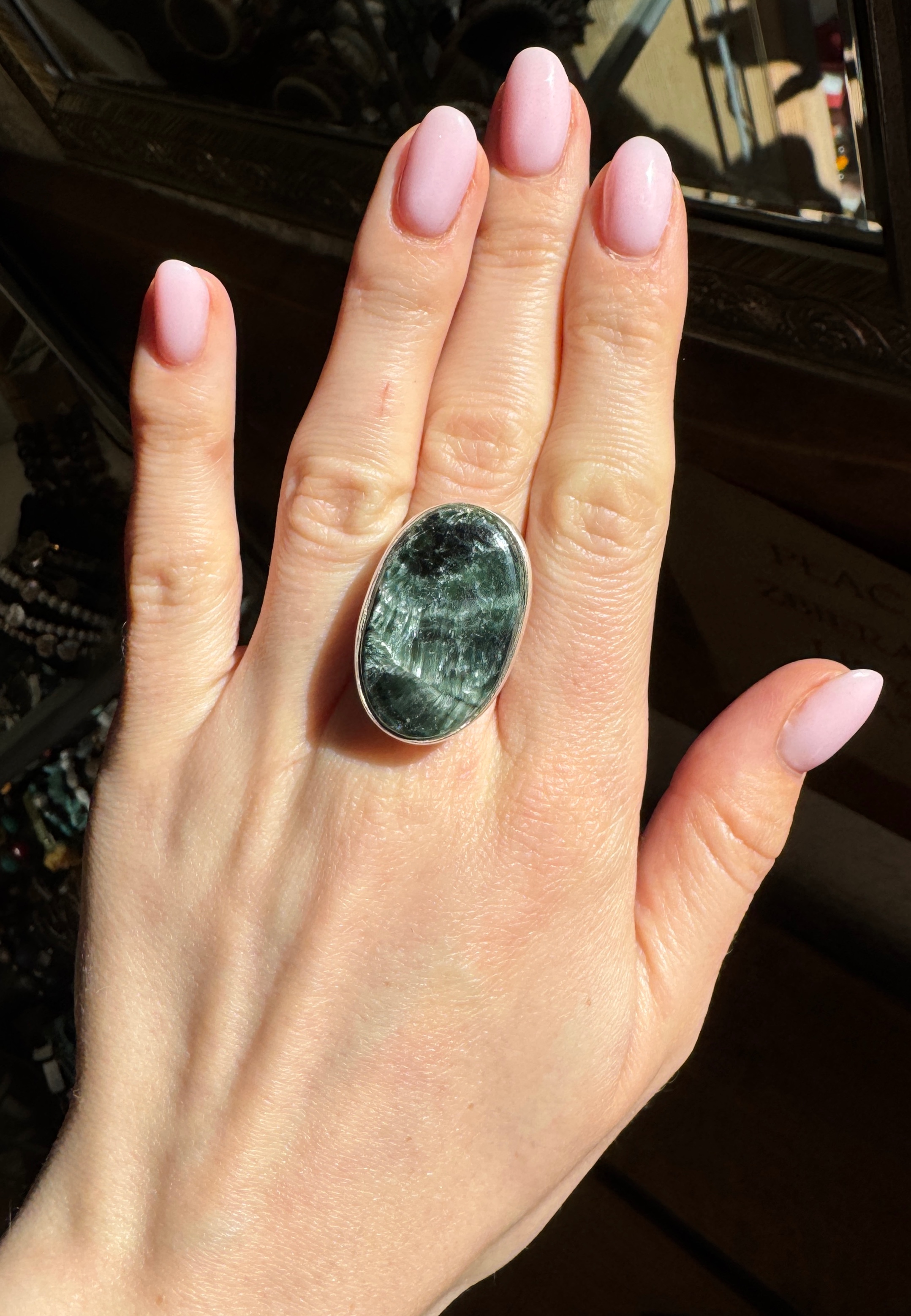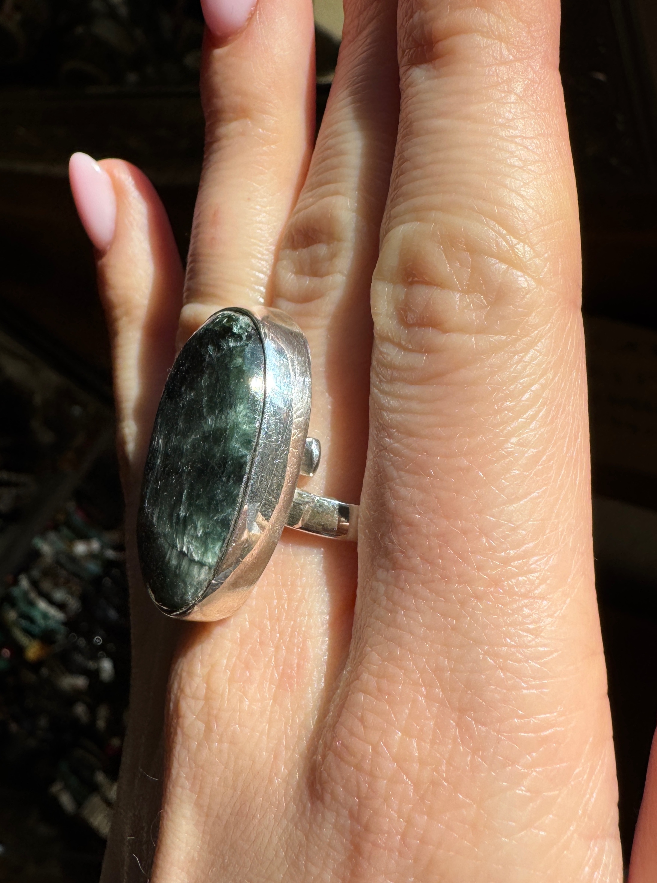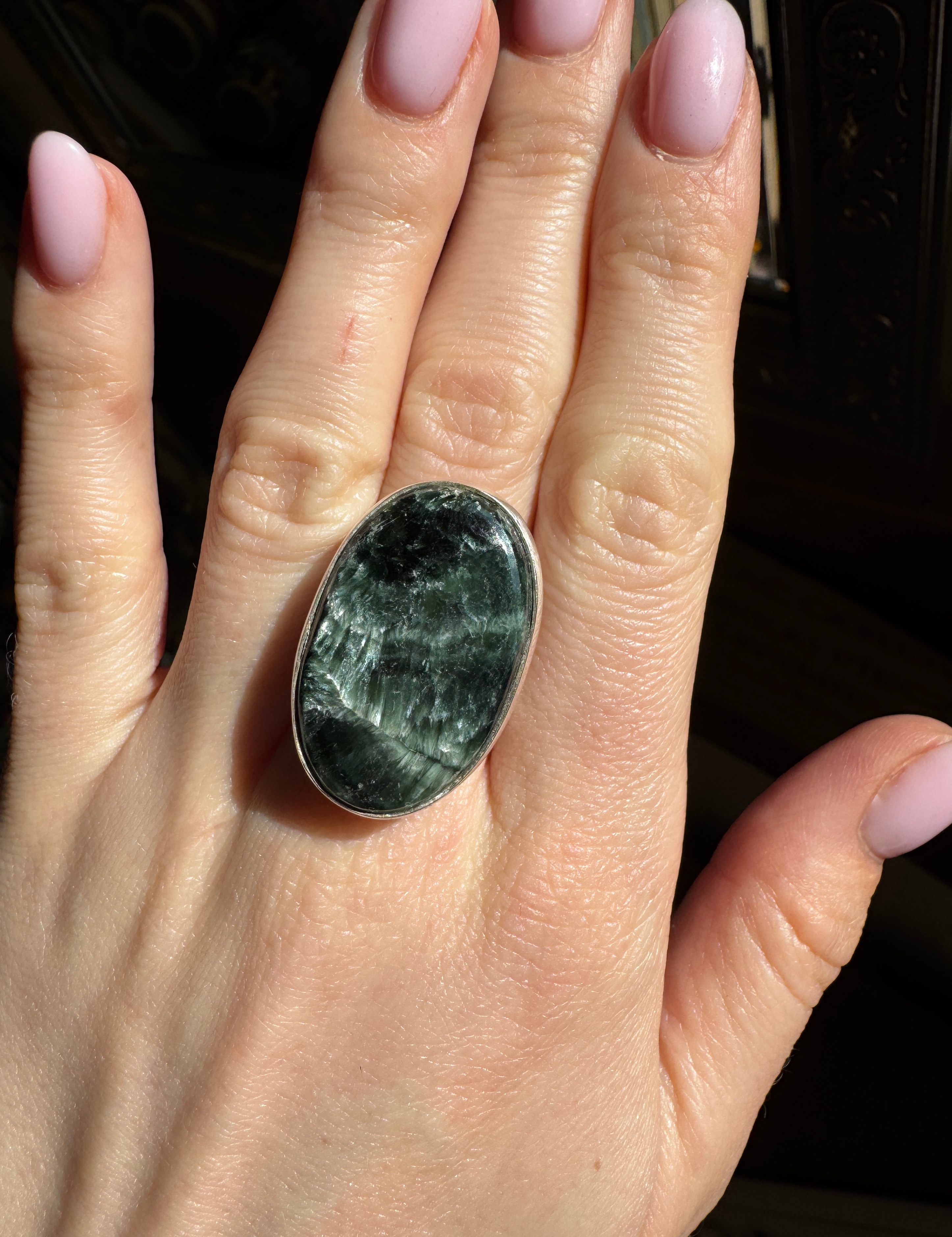 Piękny ręcznie wykonany pierścionek z serafinitu i srebra pr.925.
