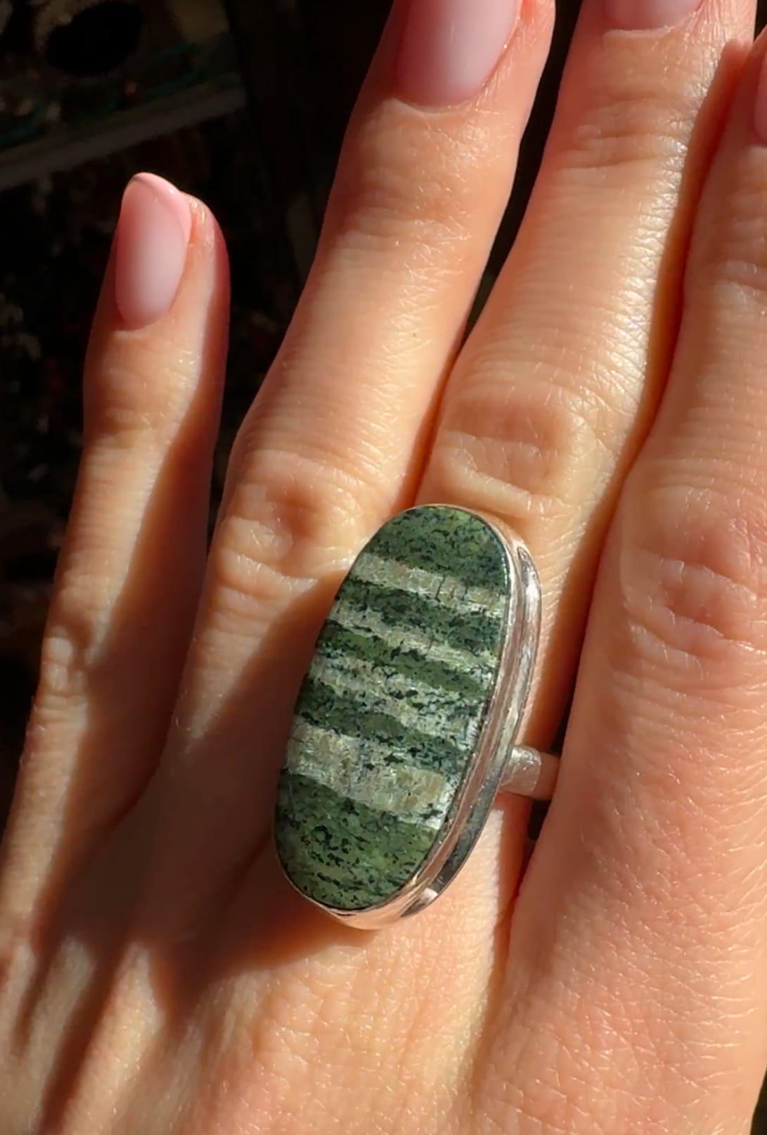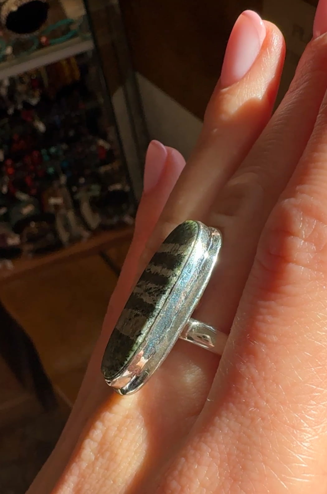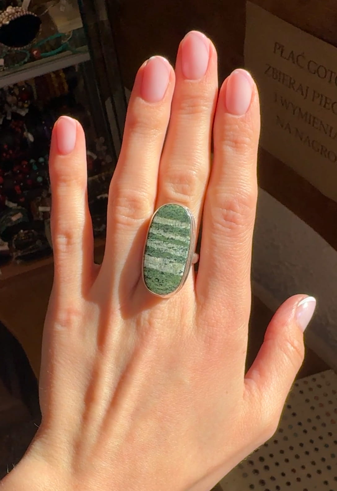 Piękny ręcznie wykonany pierścionek z serafinitu i srebra pr.925.