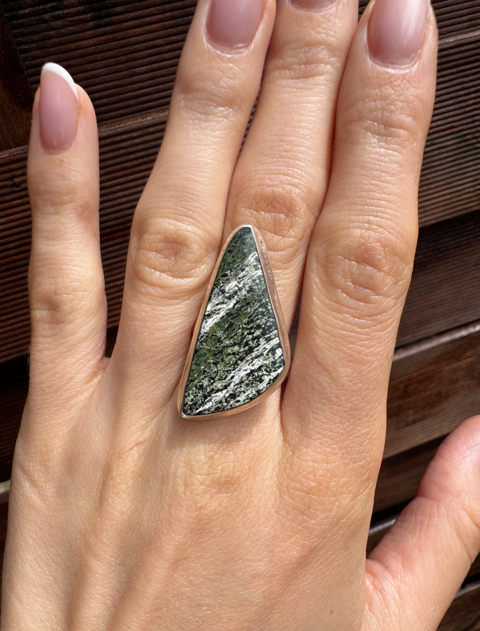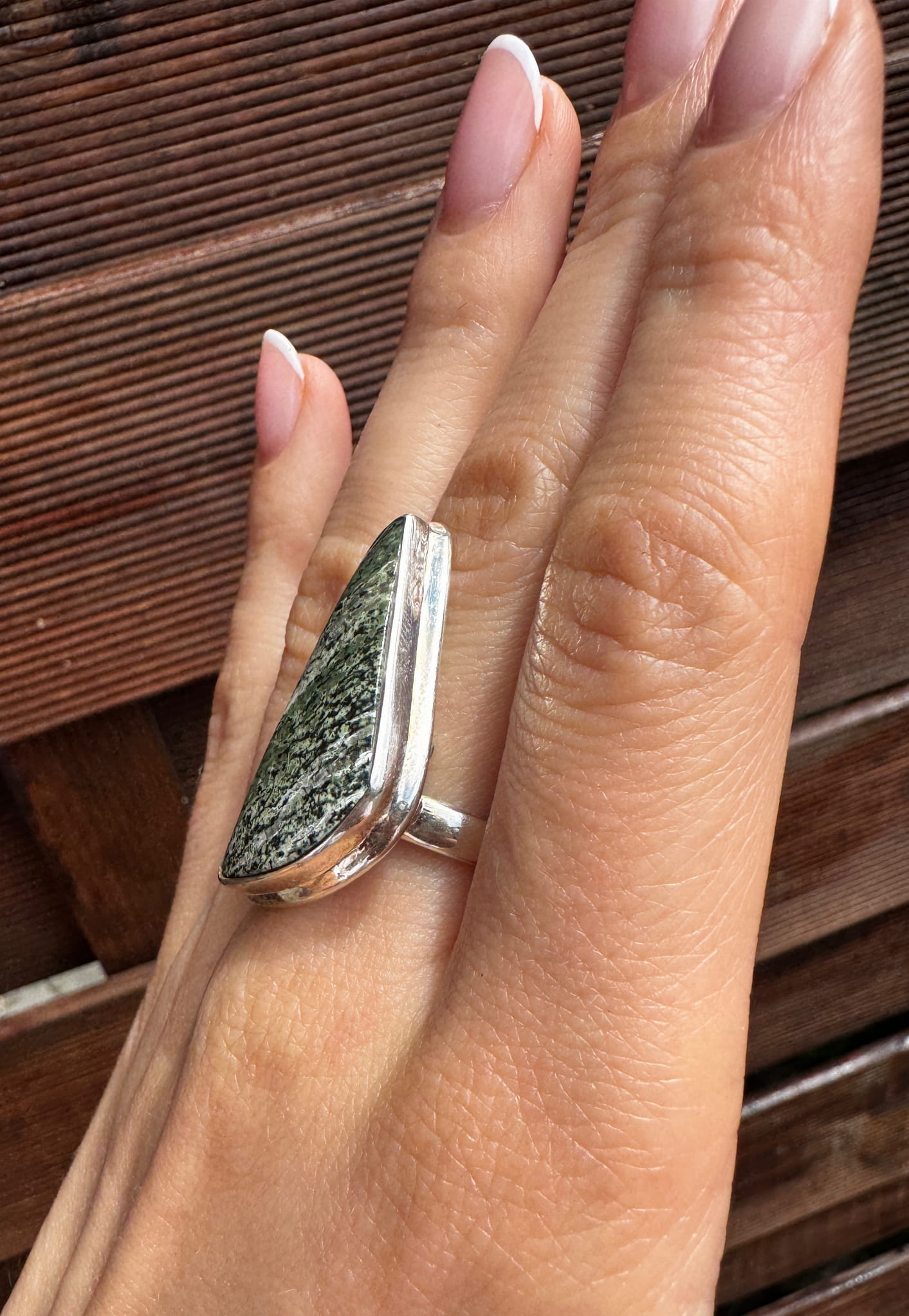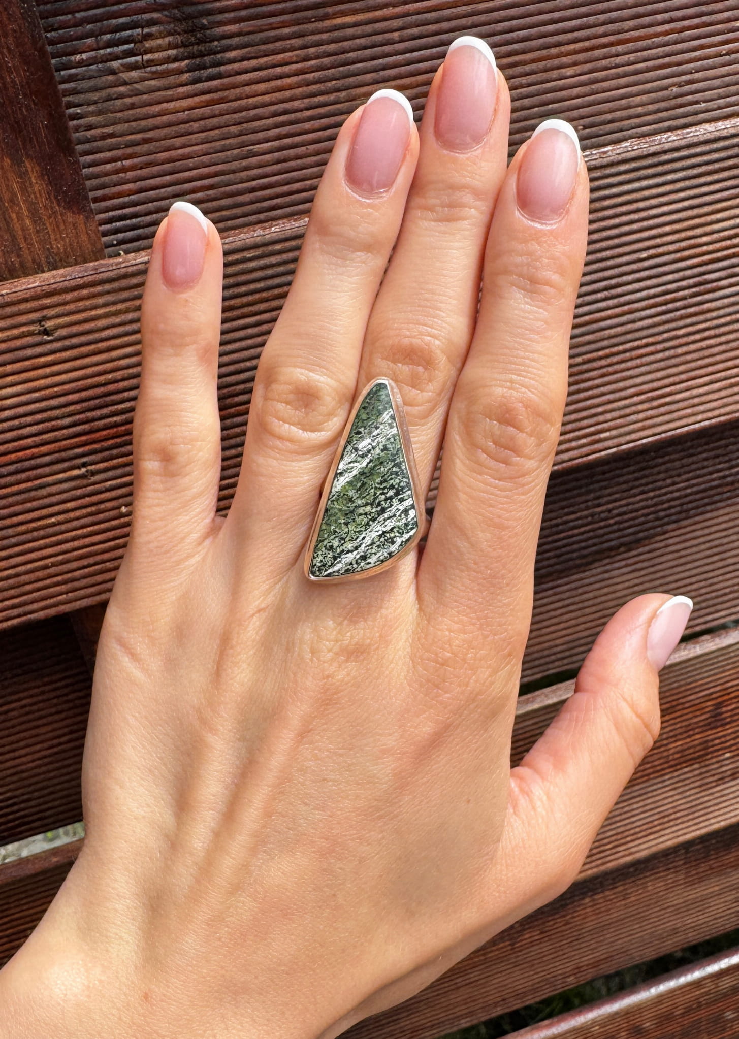 Piękny ręcznie wykonany pierścionek z serafinitu i srebra pr.925.