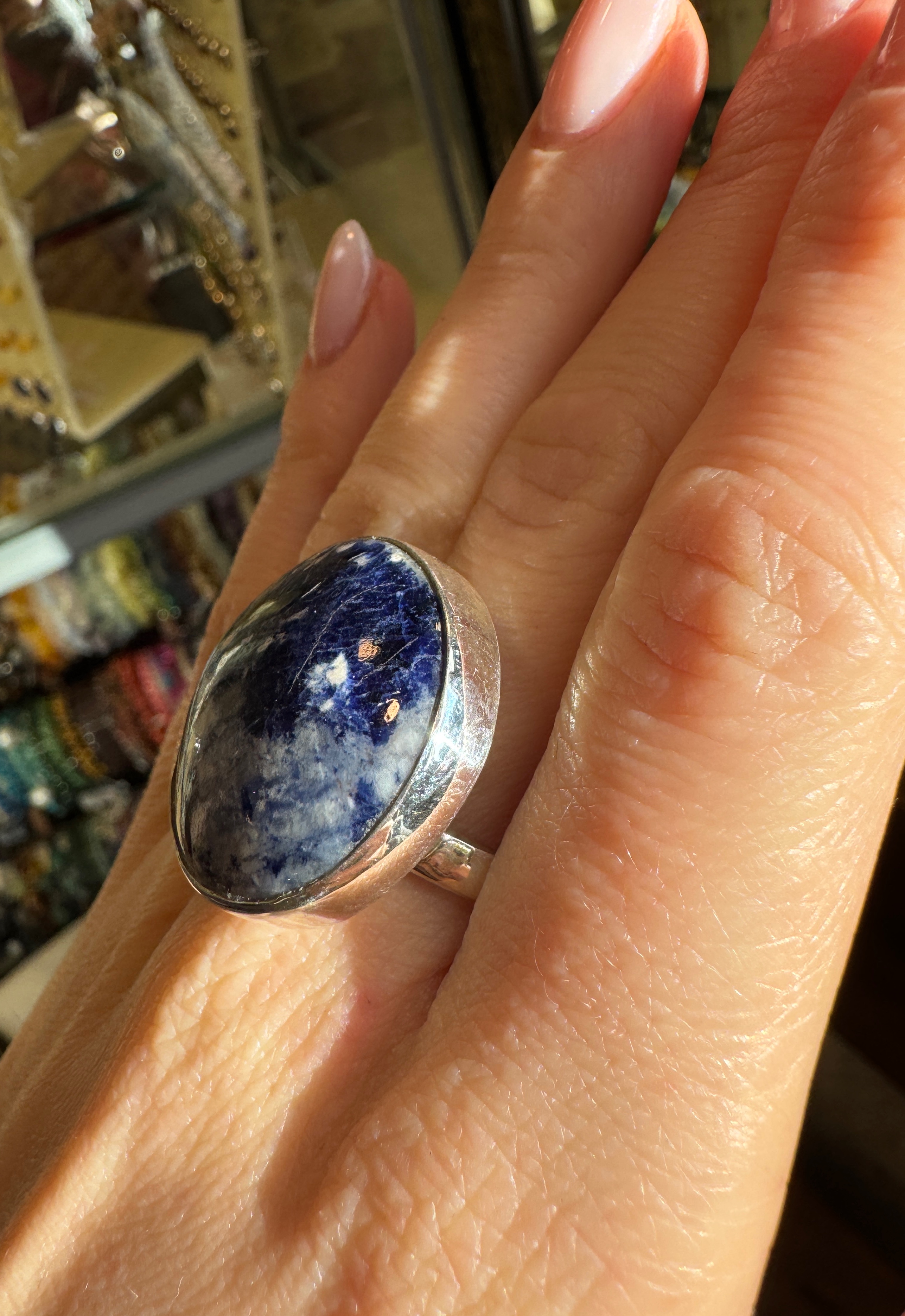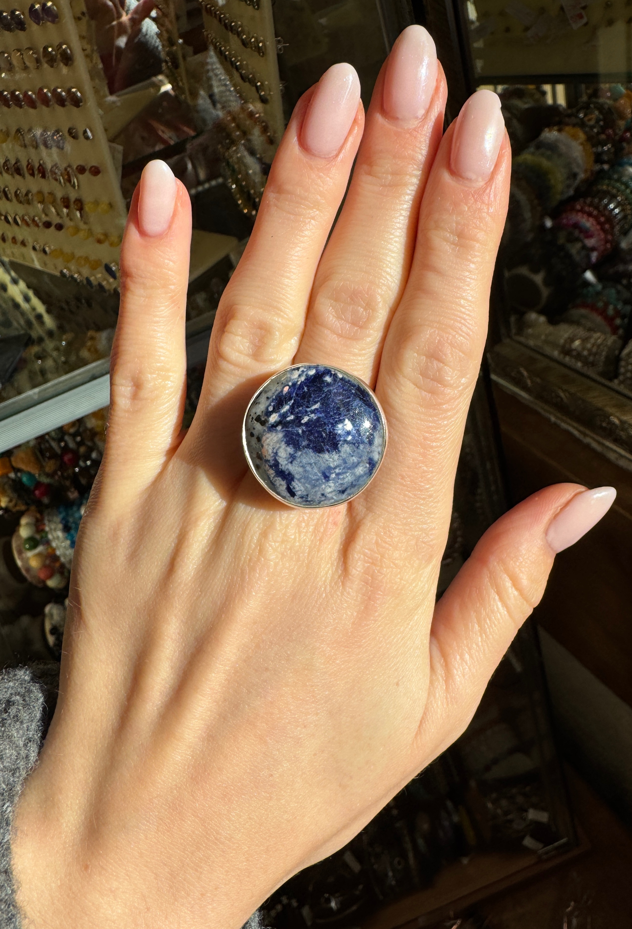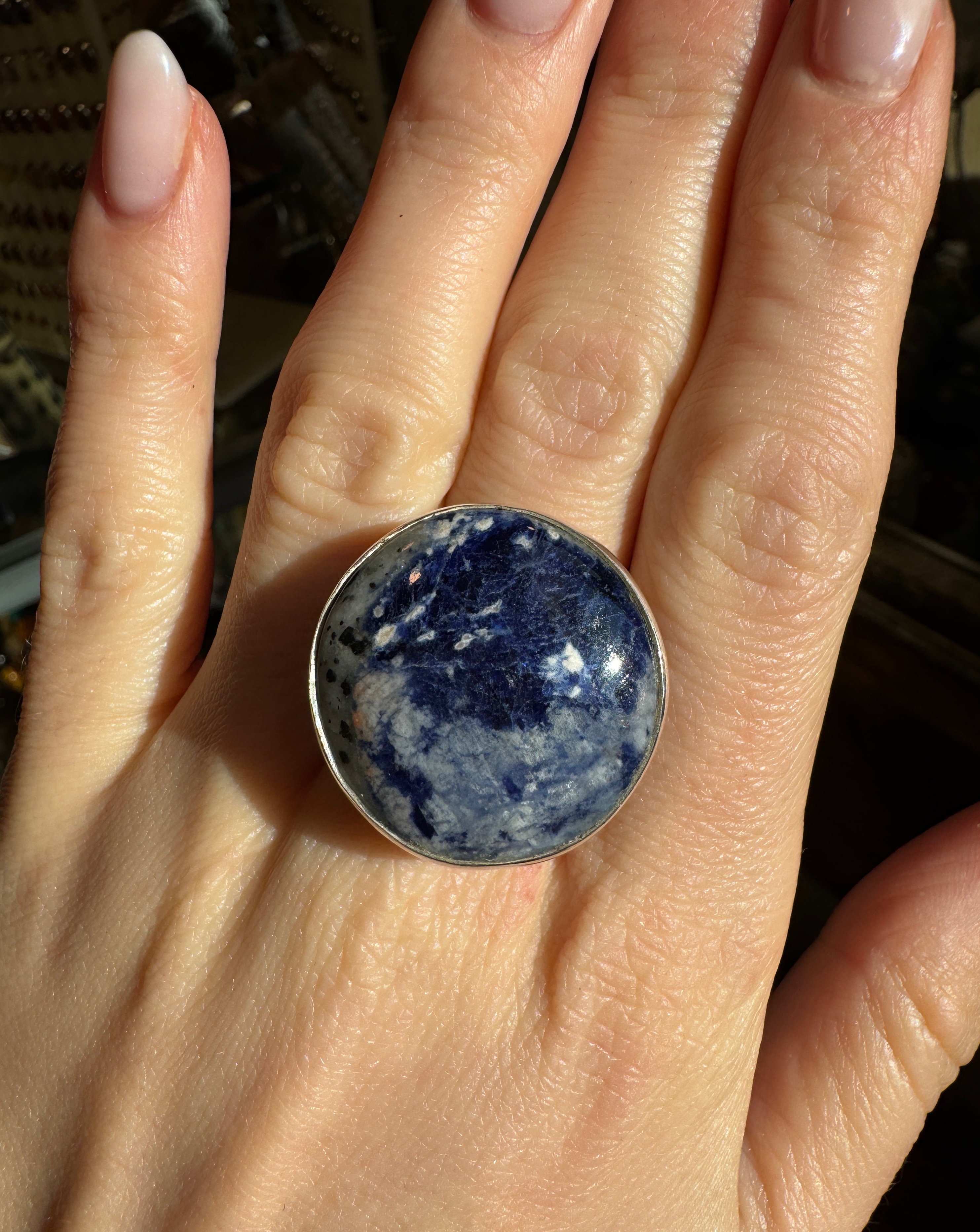 Ręcznie wykonany pierścionek z granatowego sodalitu w kształcie okrągłym i srebra pr.925