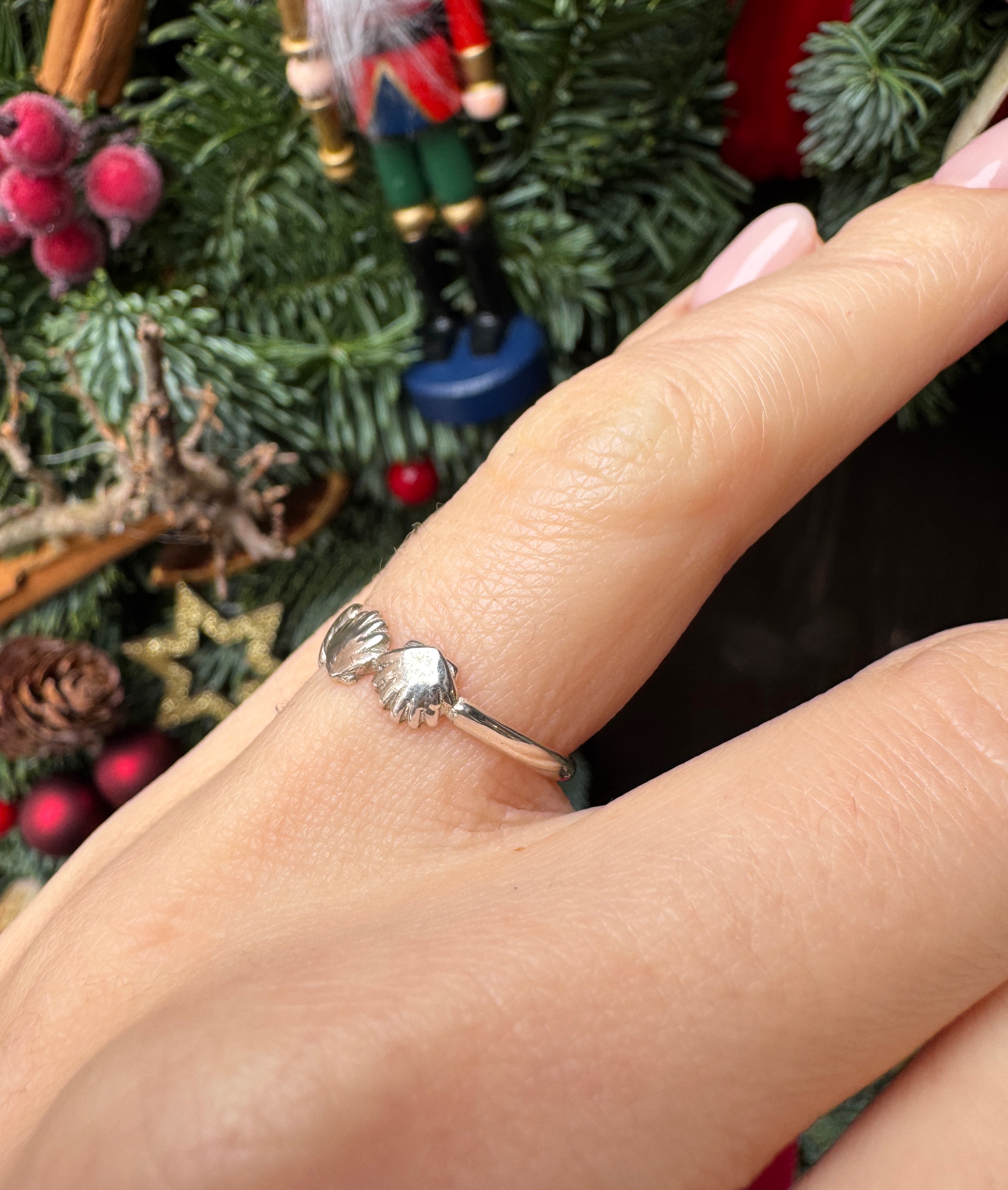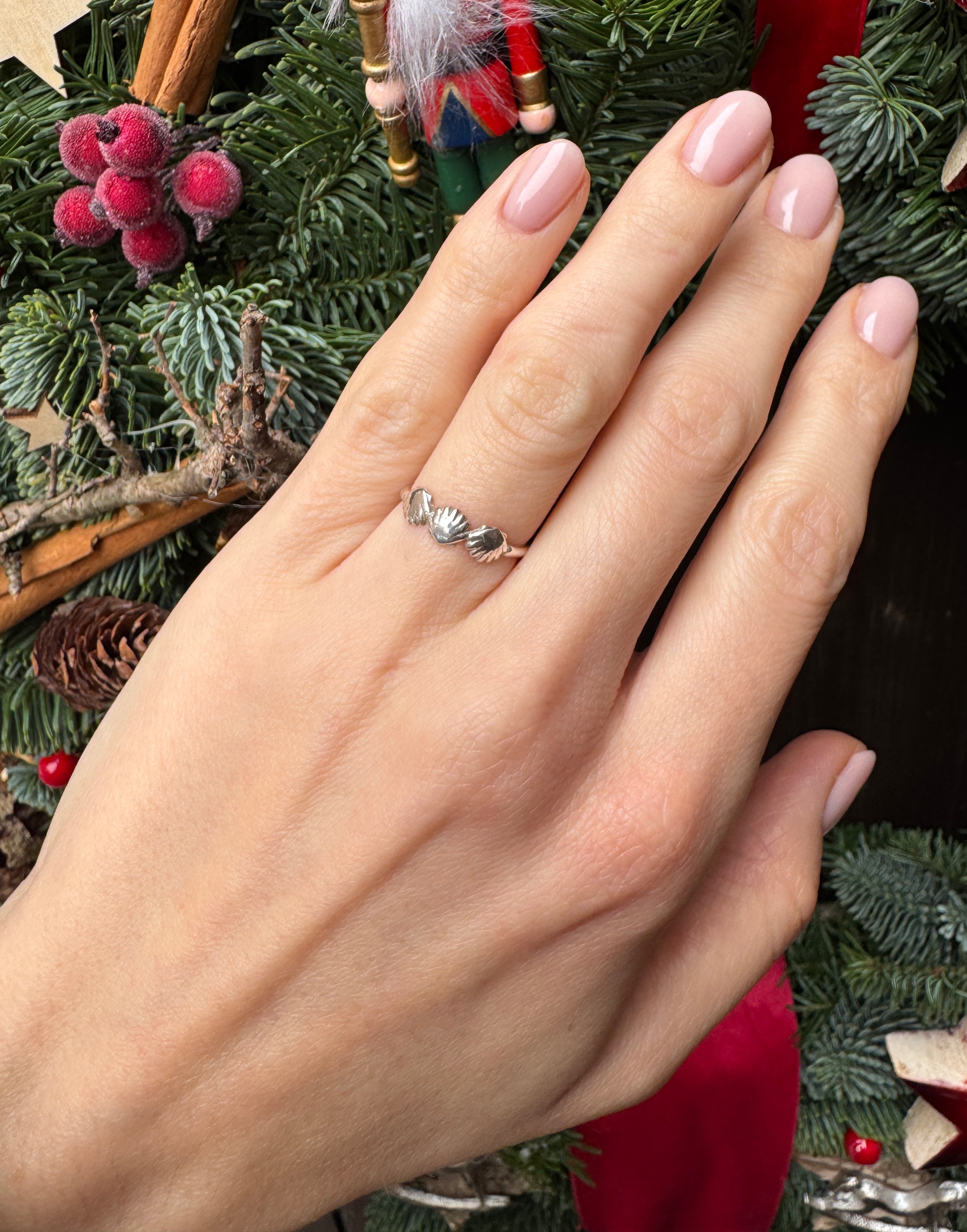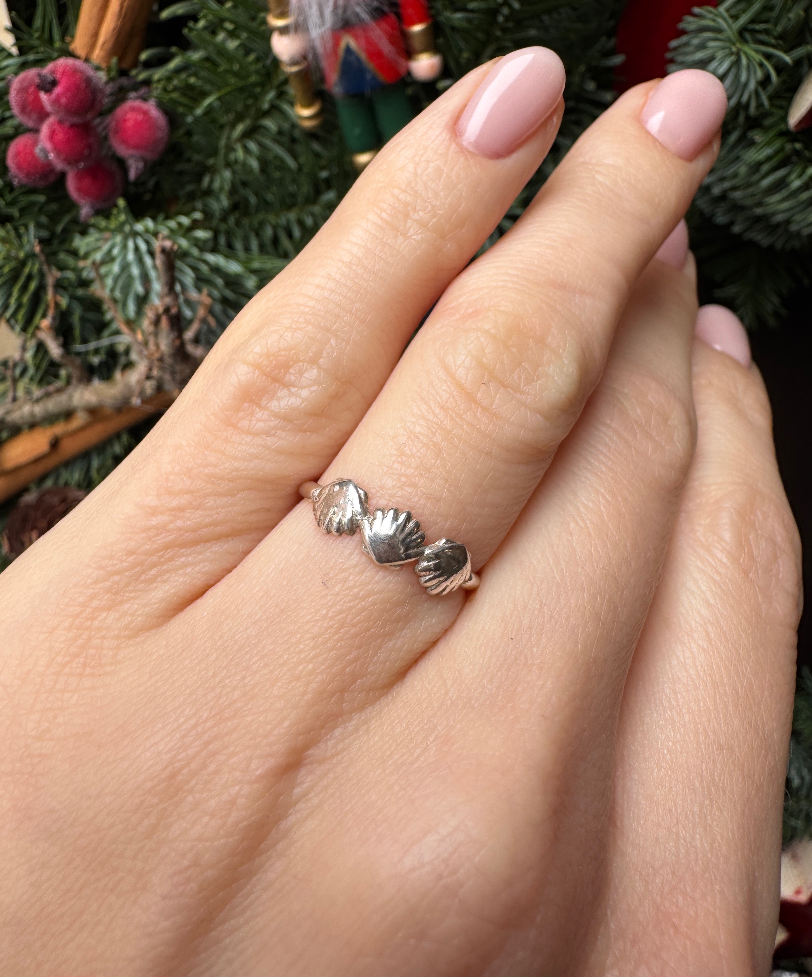 Prosty pierścionek ze srebra pr. 925 z motywem muszelek. regulacja od rozmiaru 10 wzwyż. Im większy rozmiar tym większa będzie "przerwa" między nimi