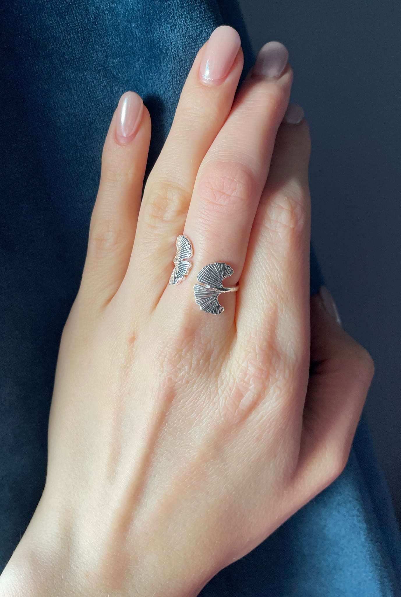 Między miłorzębami pierścionek jest niezalutowany dzięki temu możliwa jest regulacja od rozmiaru 10 wzwyż. Im większy rozmiar tym większa będzie "przerwa" między nimi