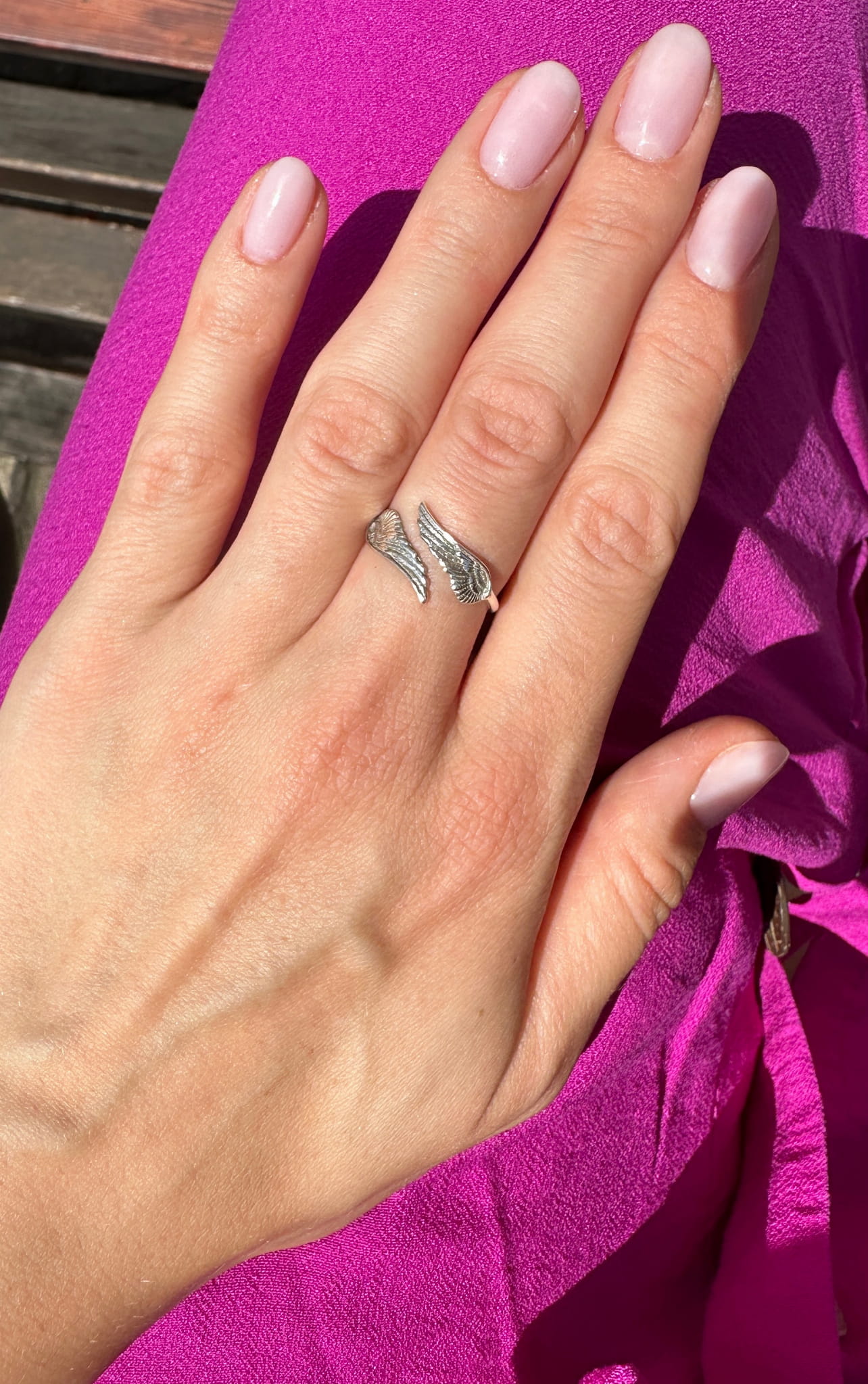 Między skrzydłami pierścionek jest niezalutowany dzięki temu możliwa jest regulacja od rozmiaru 10 wzwyż. Im większy rozmiar tym większa będzie "przerwa" między nimi