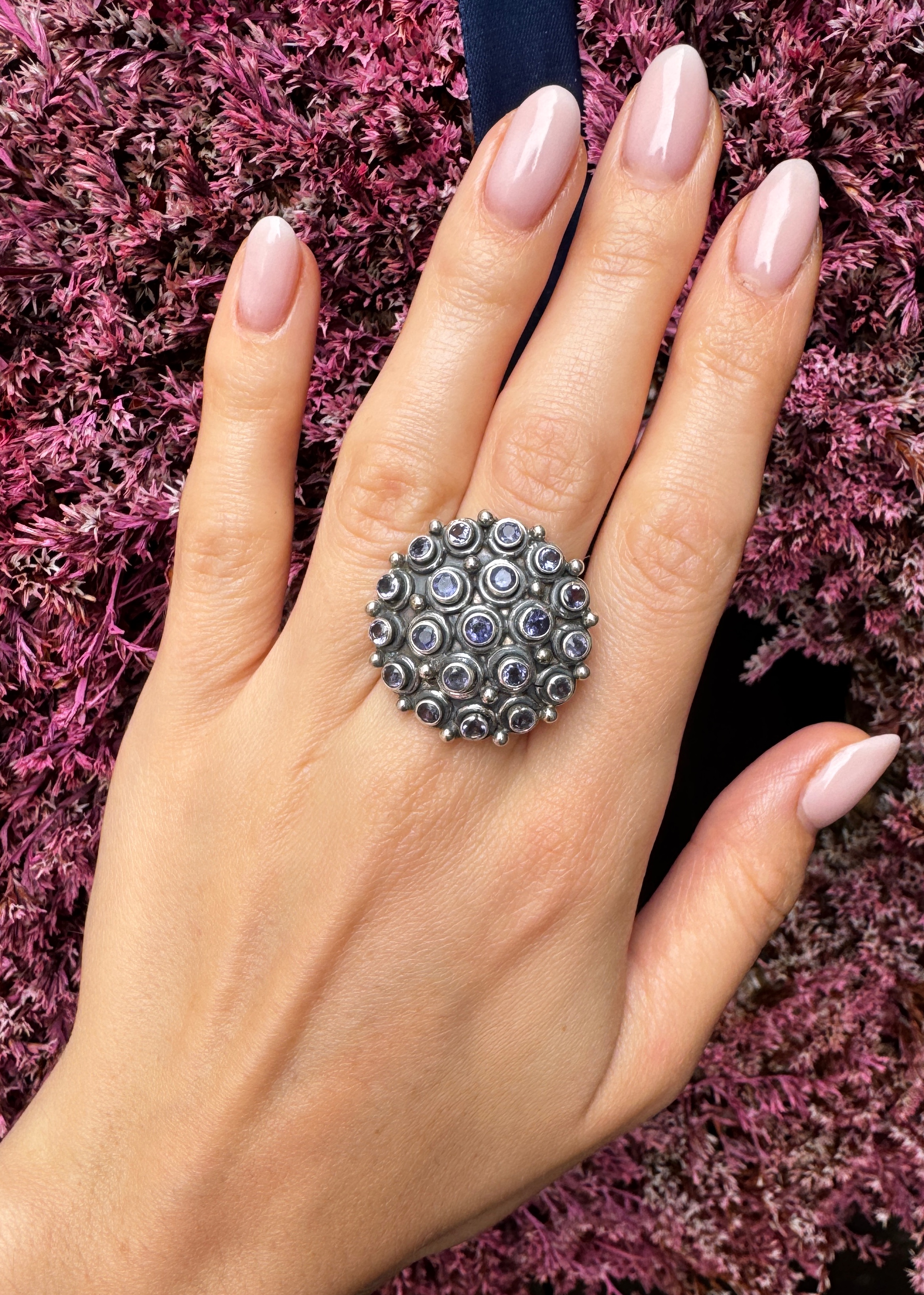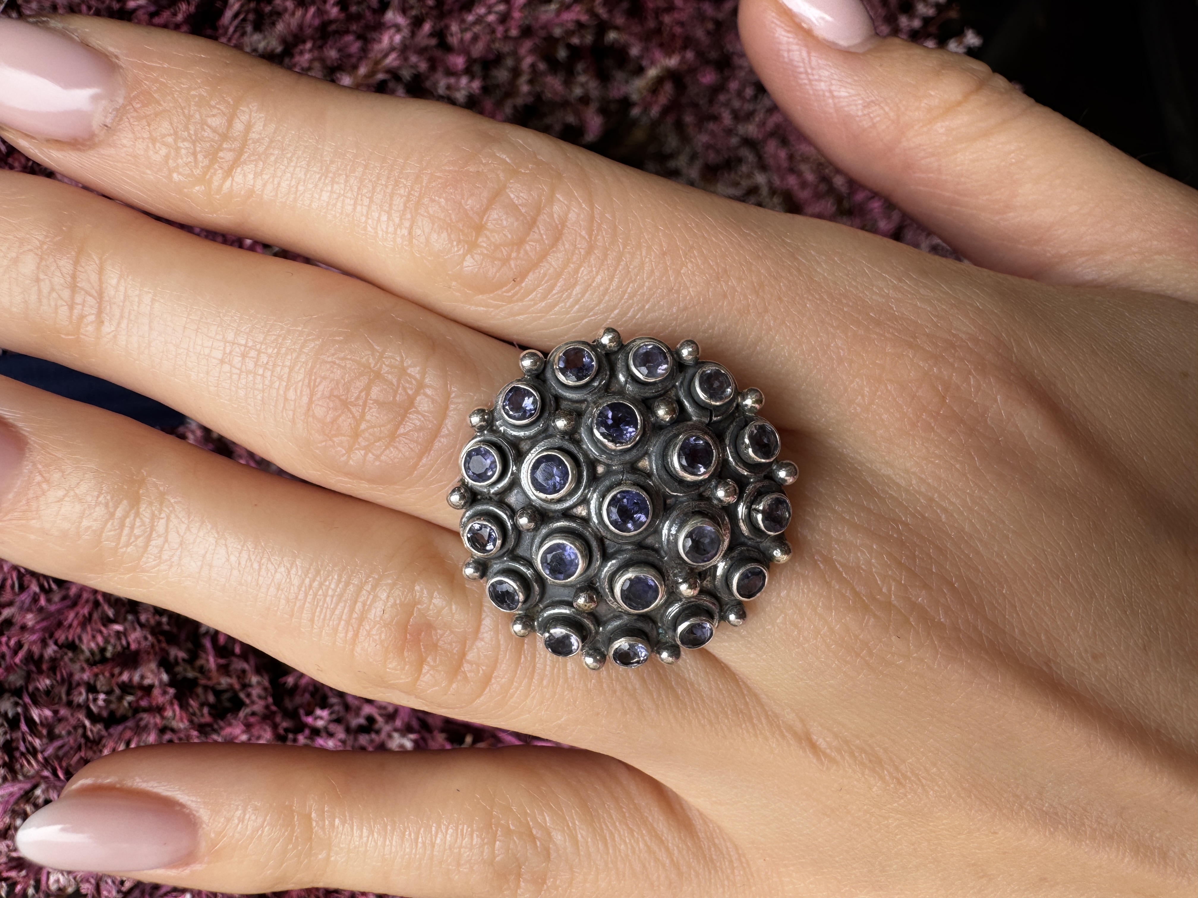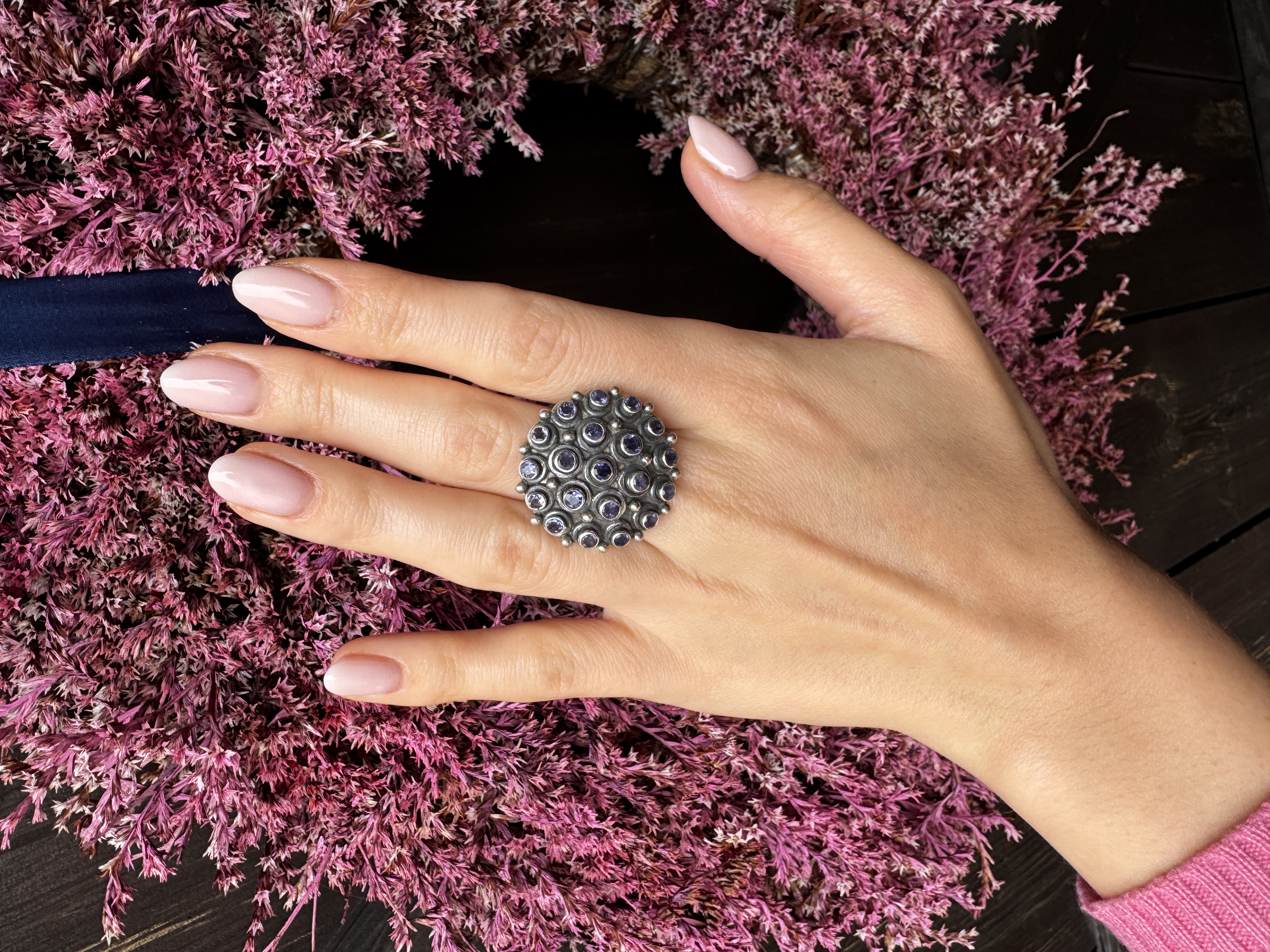 Ręcznie wykonany pierścionek z tanzanitów fasetowanych i srebra pr.925