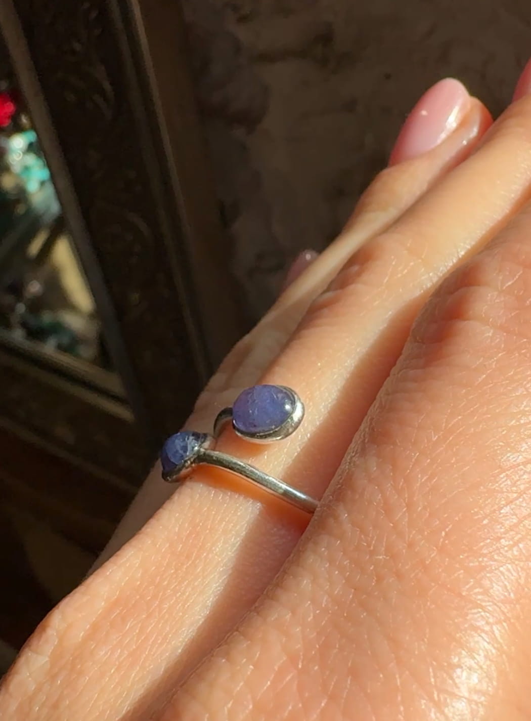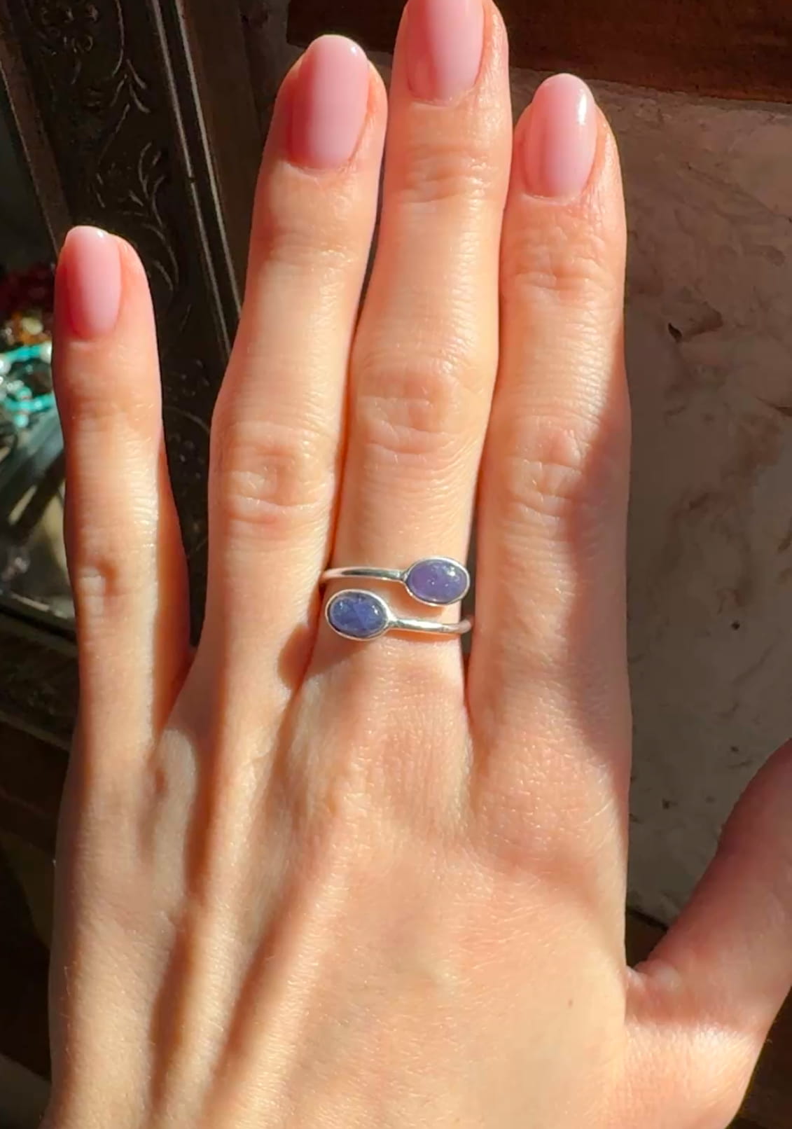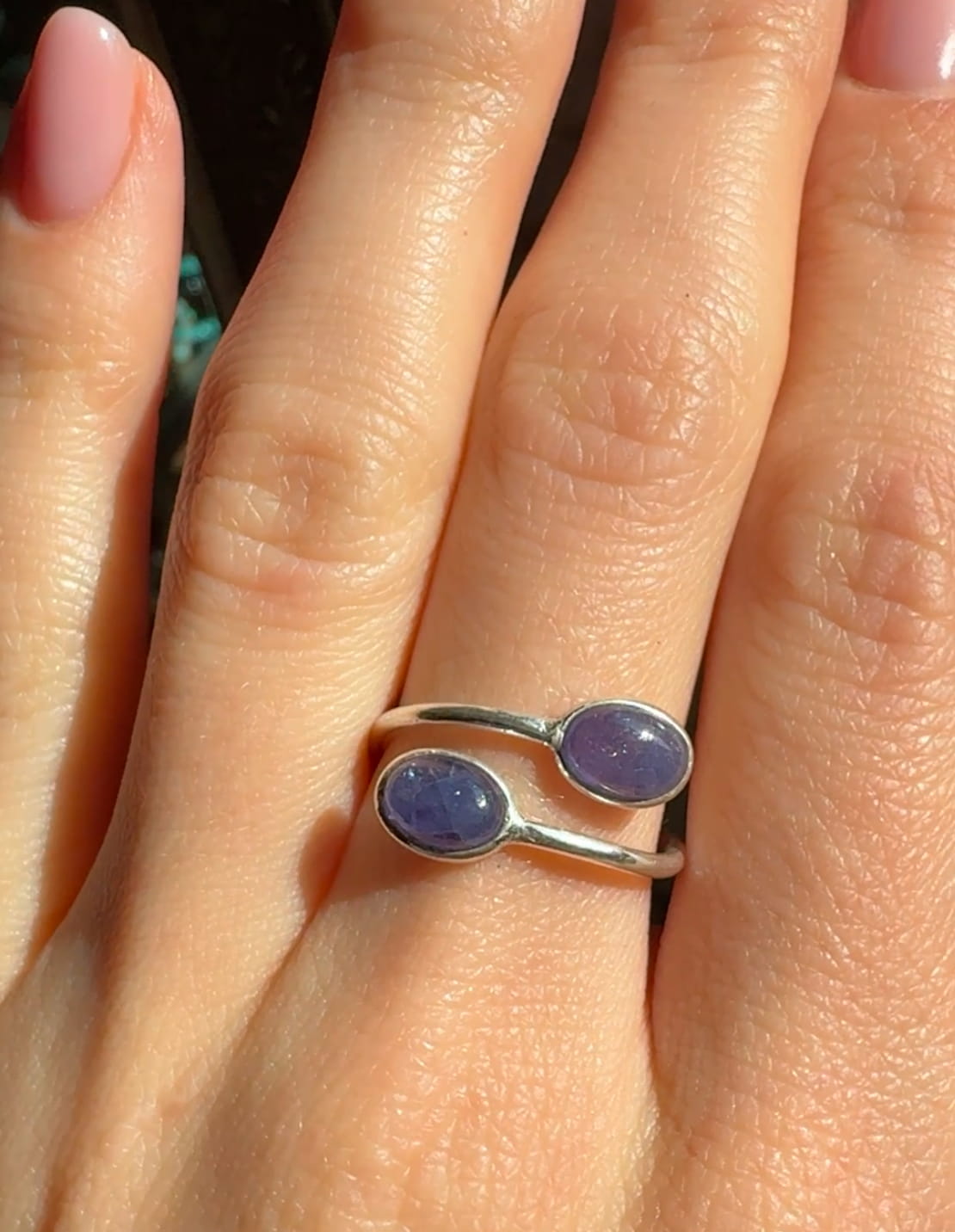 Ręcznie wykonany pierścionek z dwoma owalnymi tanzanitami w odcieniu fioletu i srebra pr.925