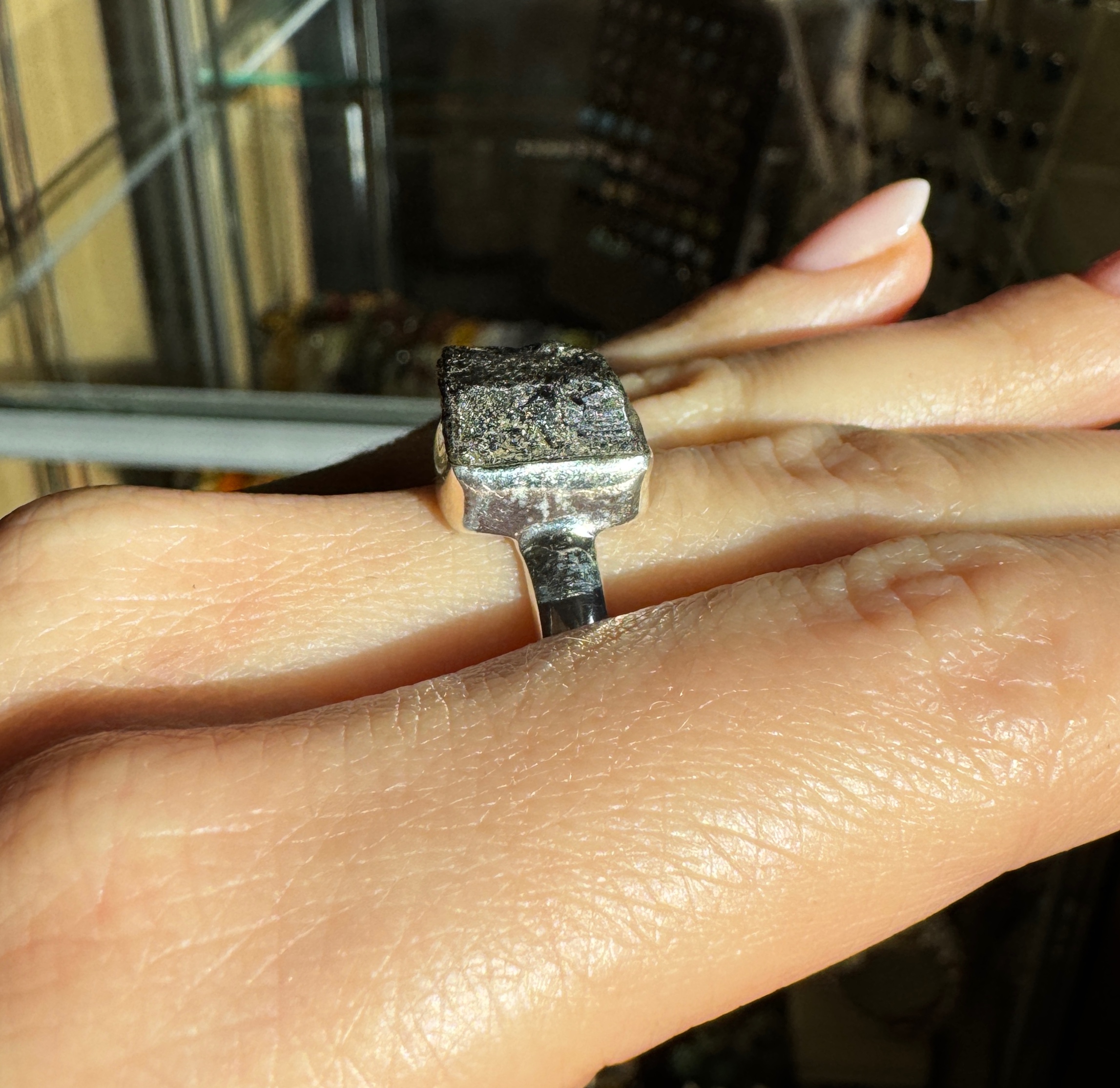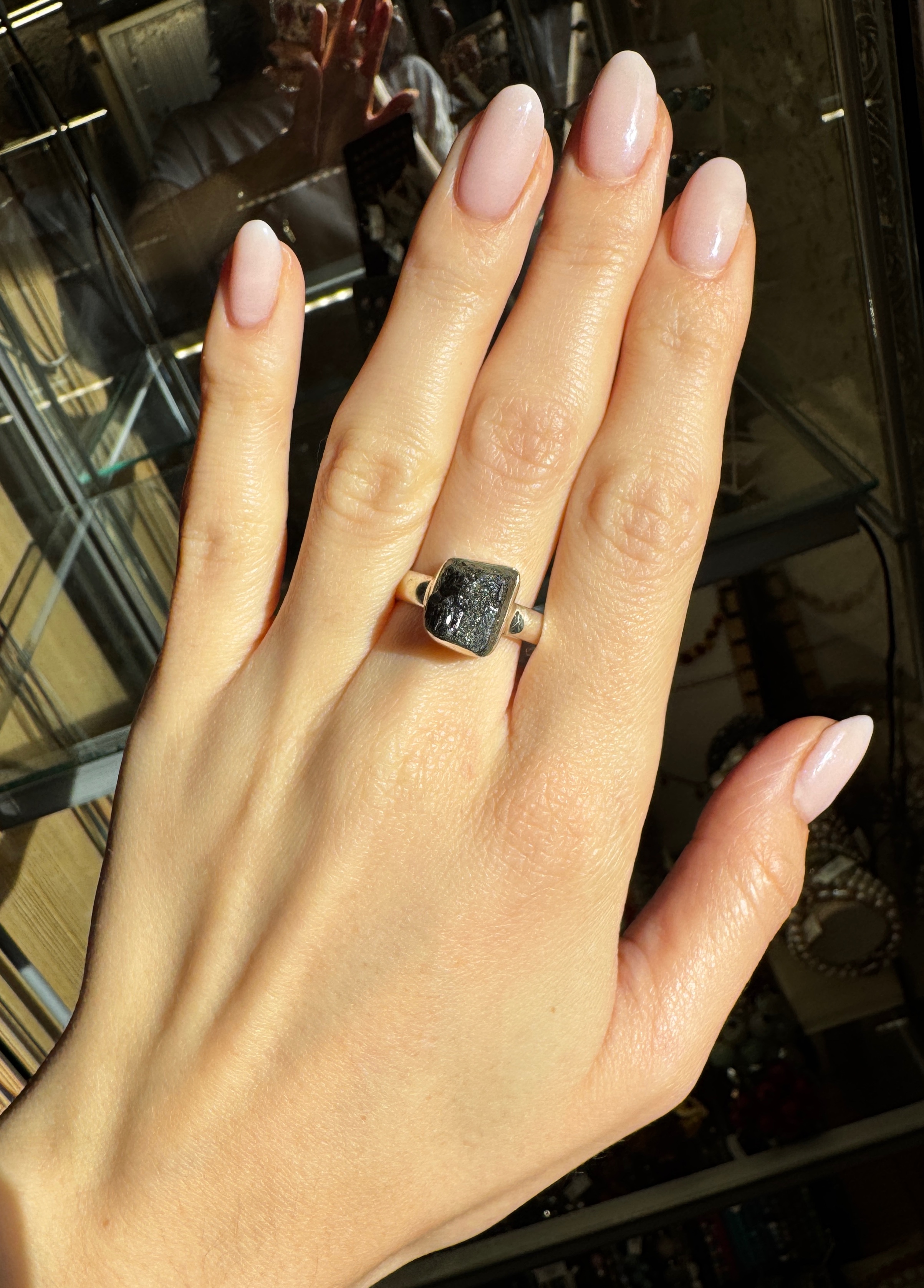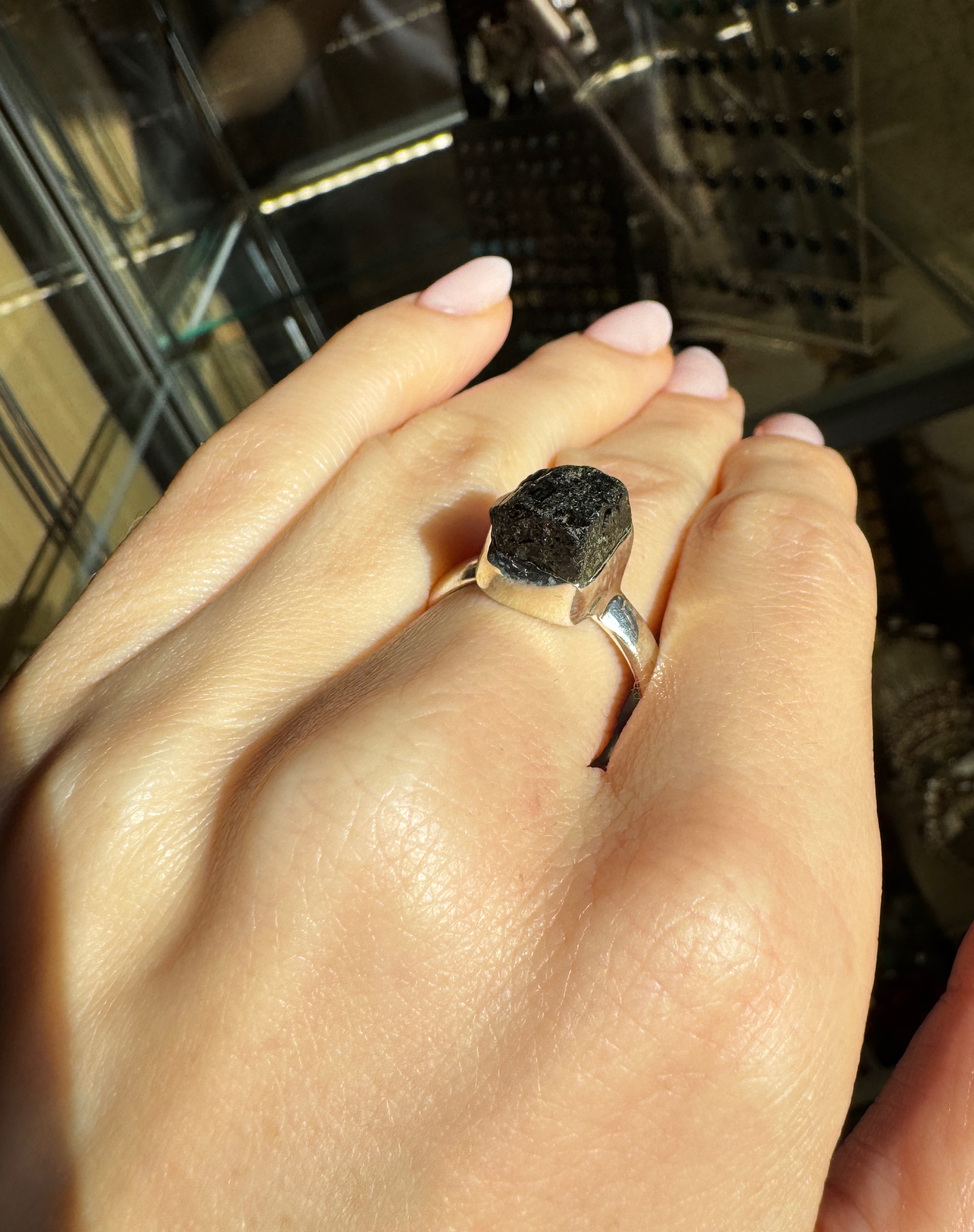 Ręcznie wykonany pierścionek z turmalinu czarnego surowego srebra pr.925