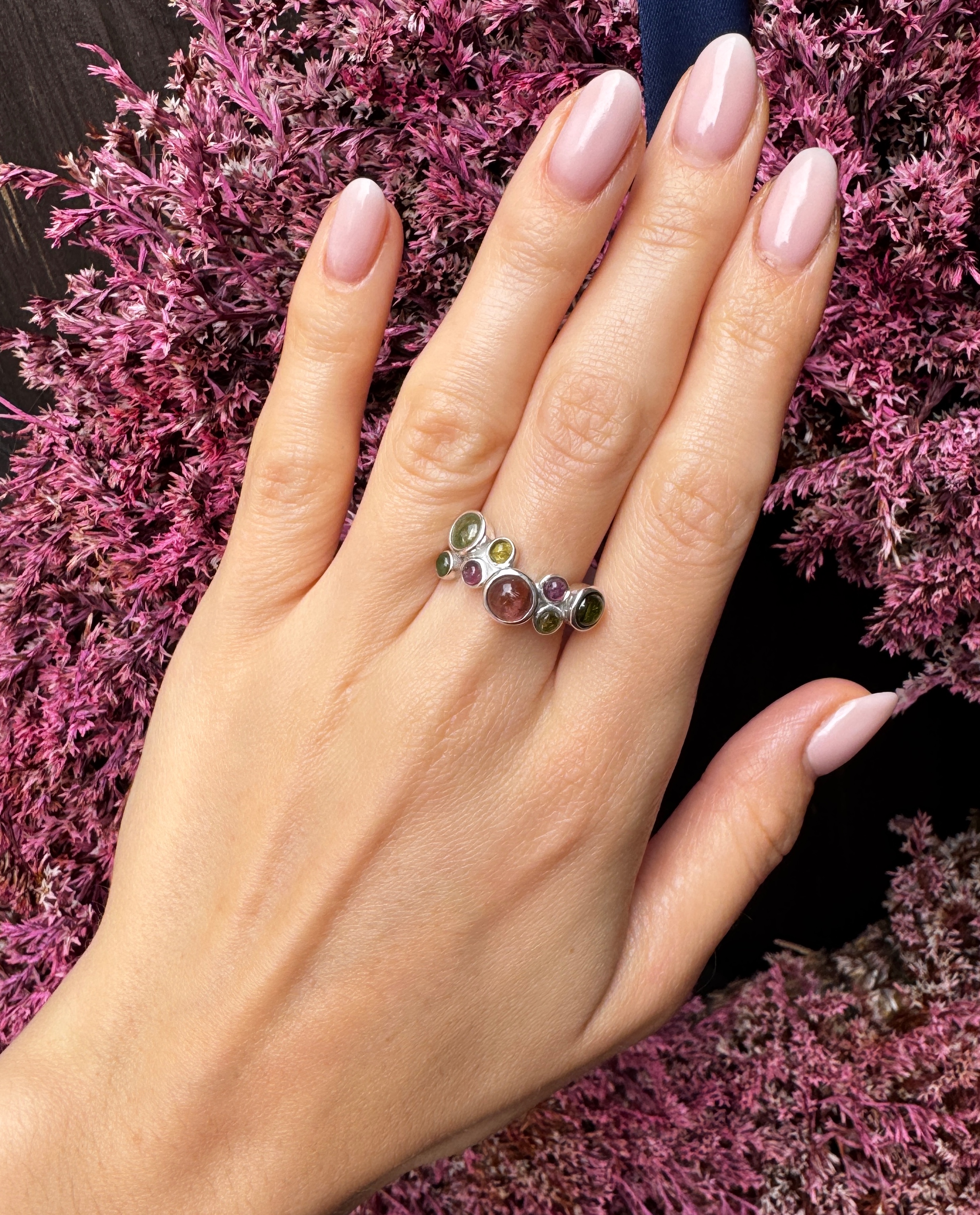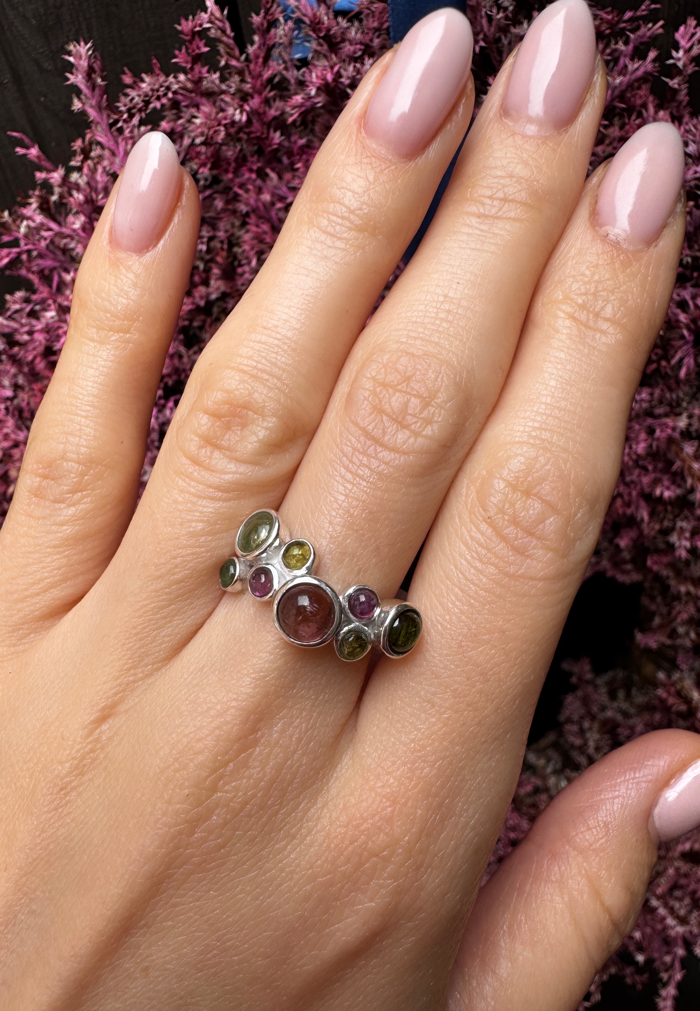 Ręcznie wykonany pierścionek z turmalinów arbuzowych srebra pr.925