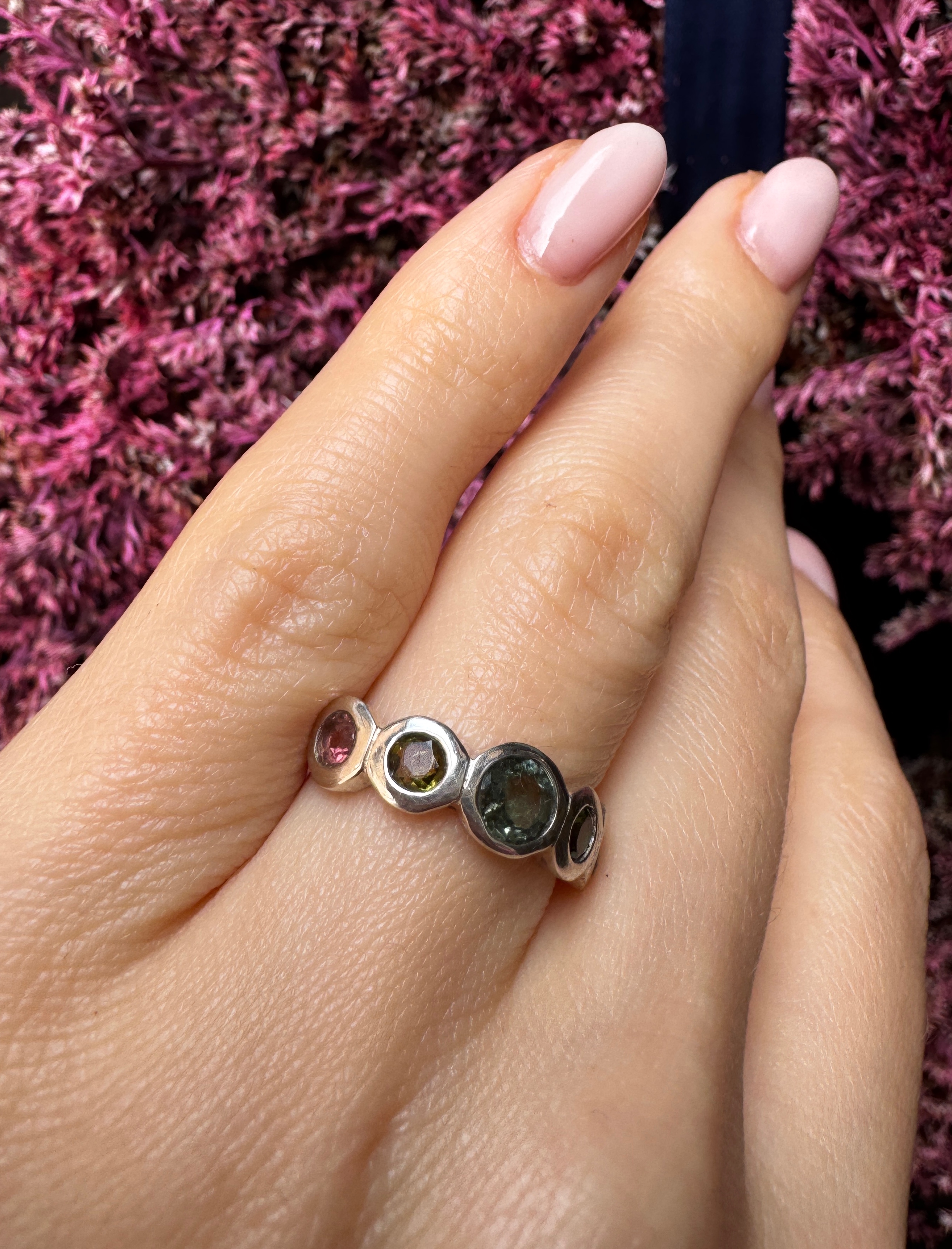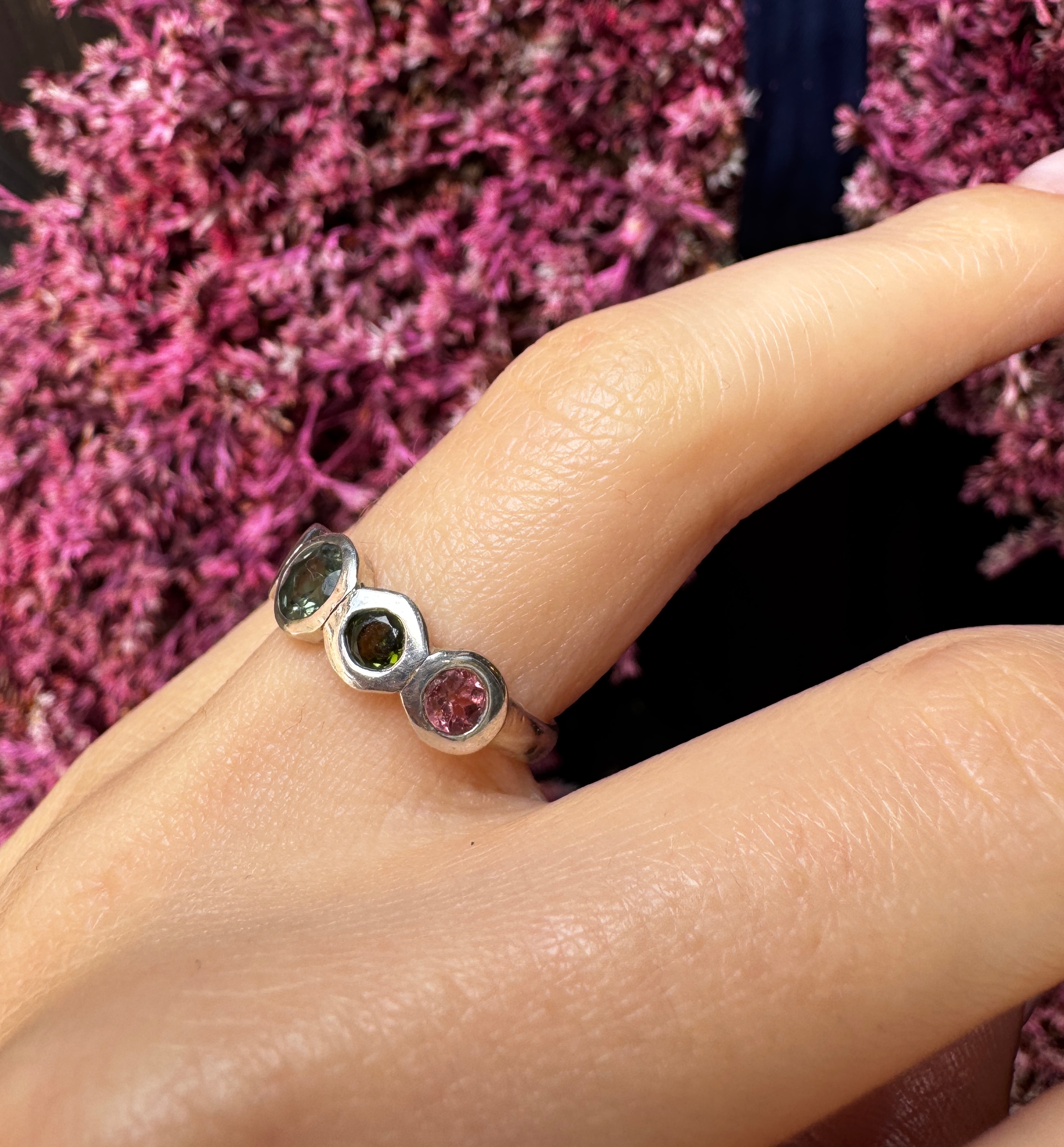 Ręcznie wykonany pierścionek z turmalinów arbuzowych srebra pr.925