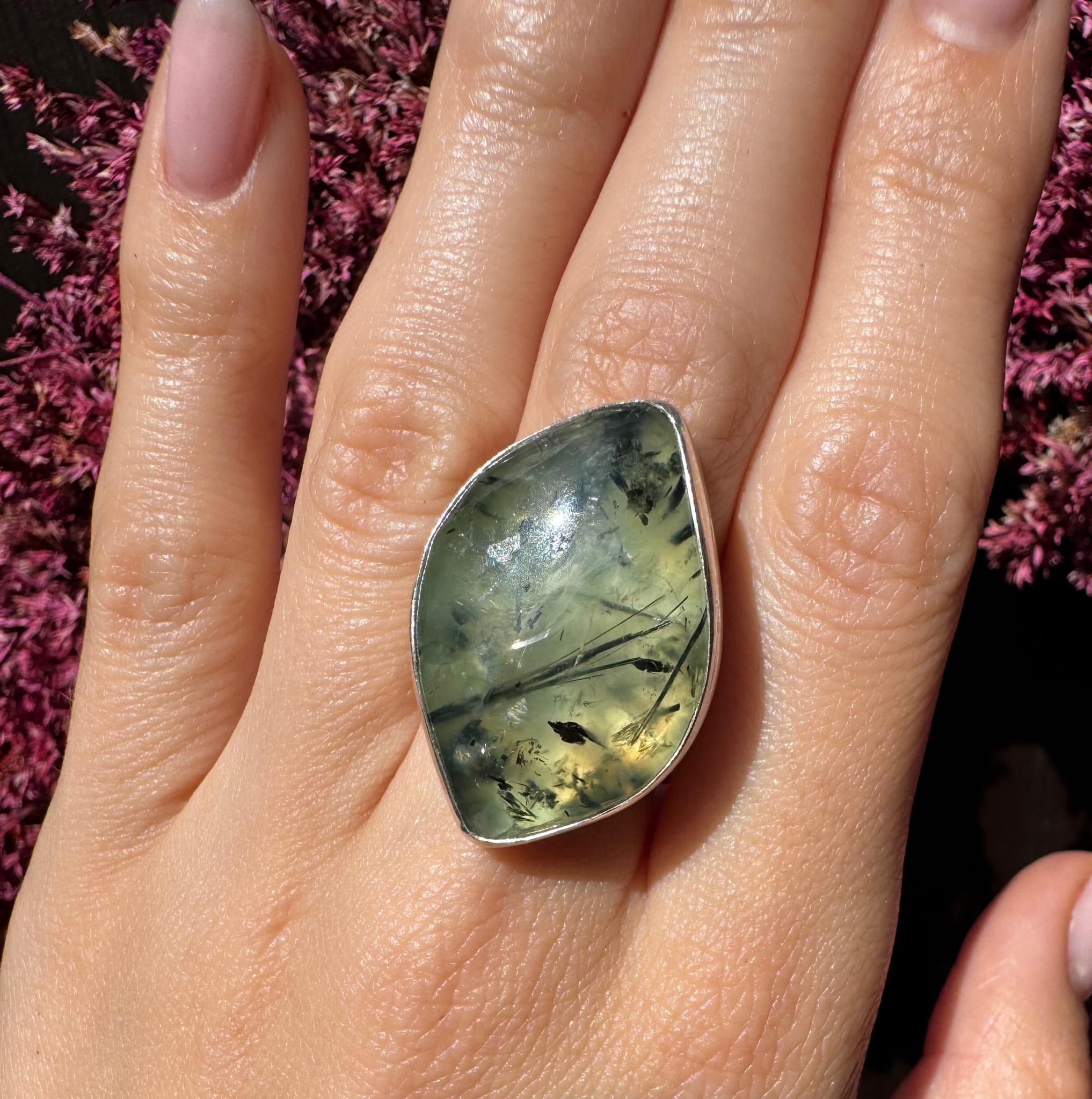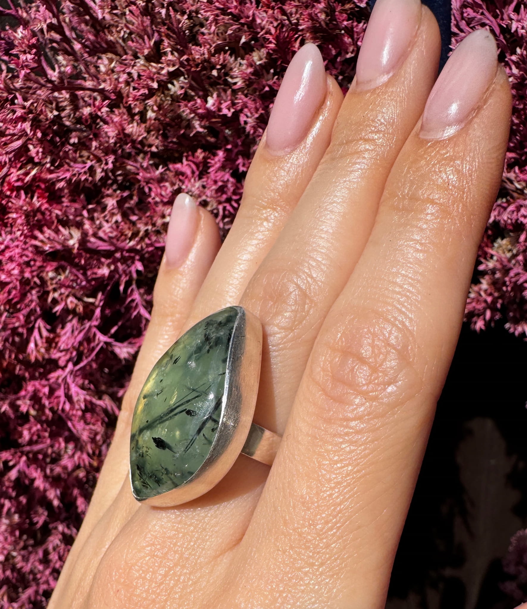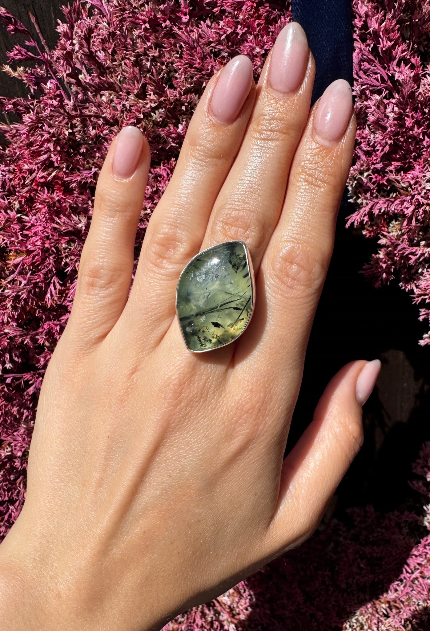 Ręcznie wykonany pierścionek z zielonego prehnitu i srebra pr.925