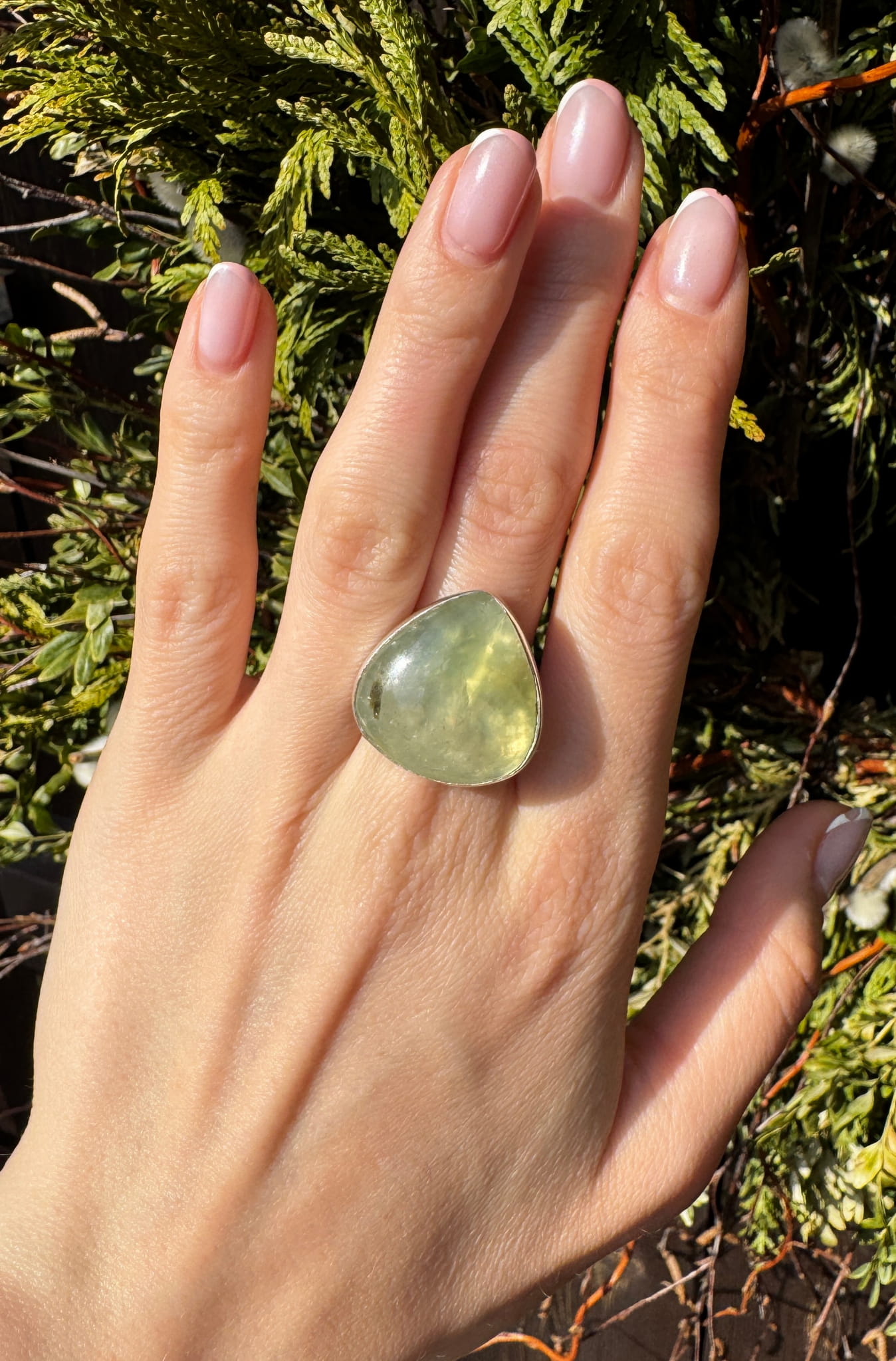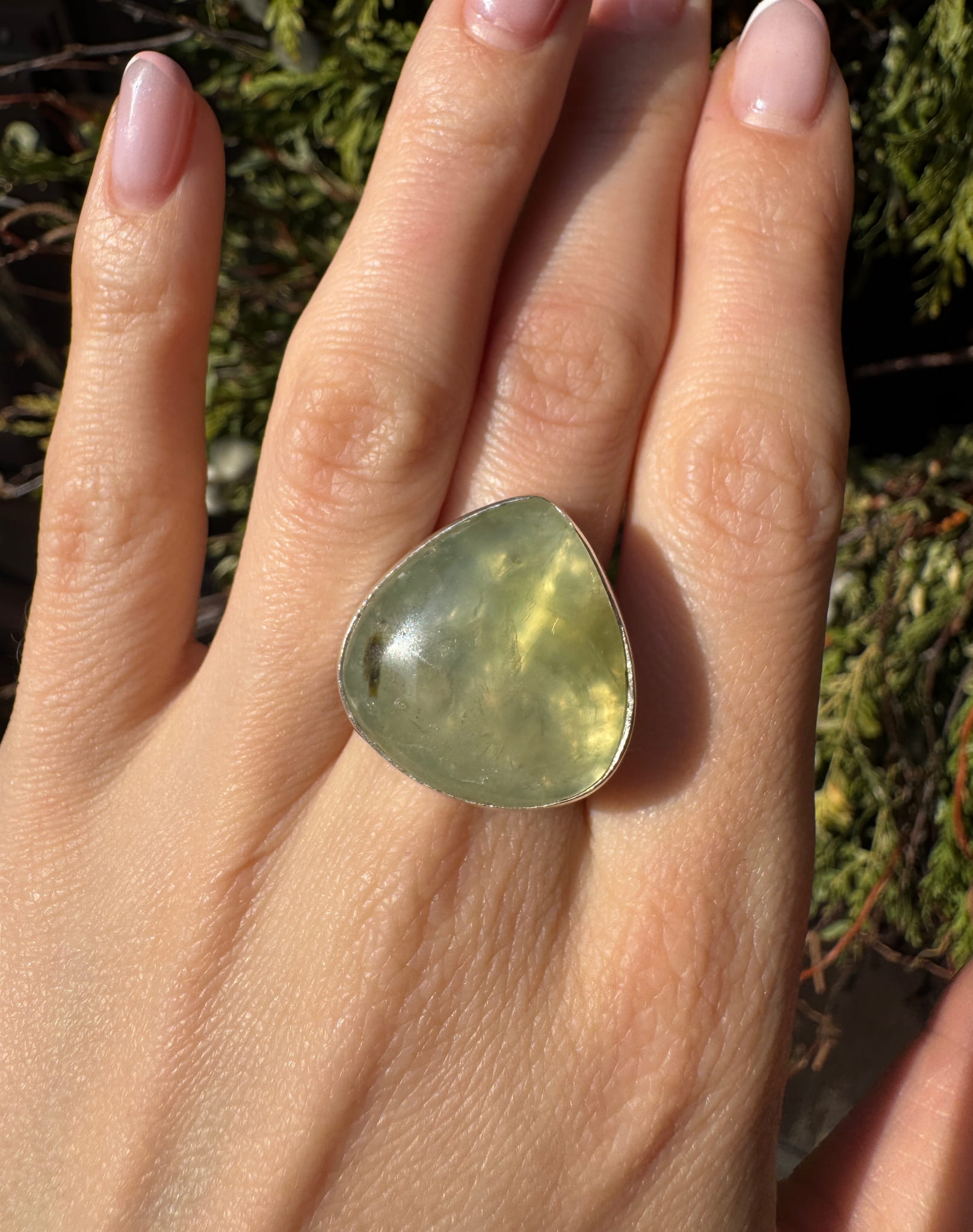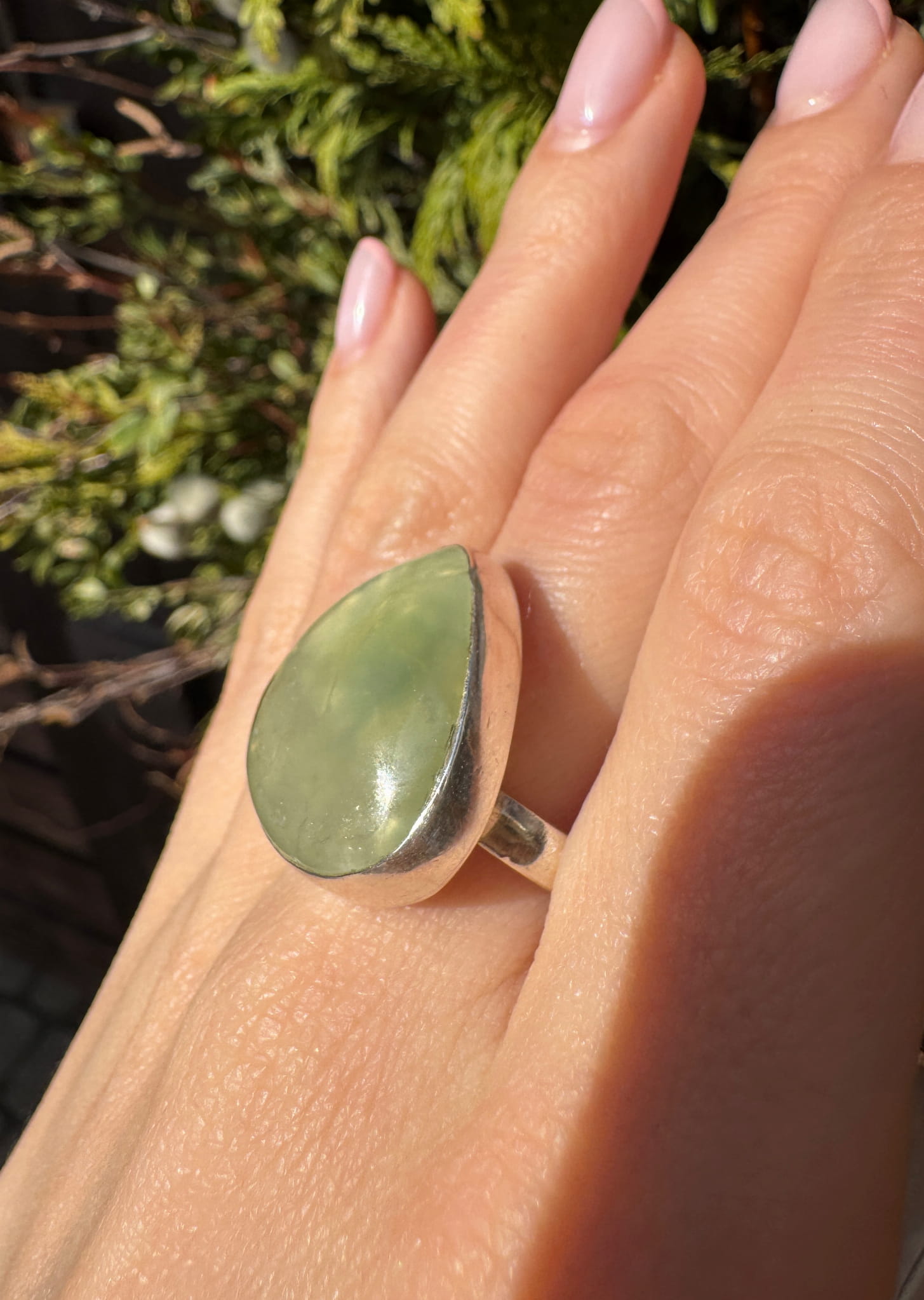 Ręcznie wykonany pierścionek z zielonego prehnitu w kształcie łezki i srebra pr.925
