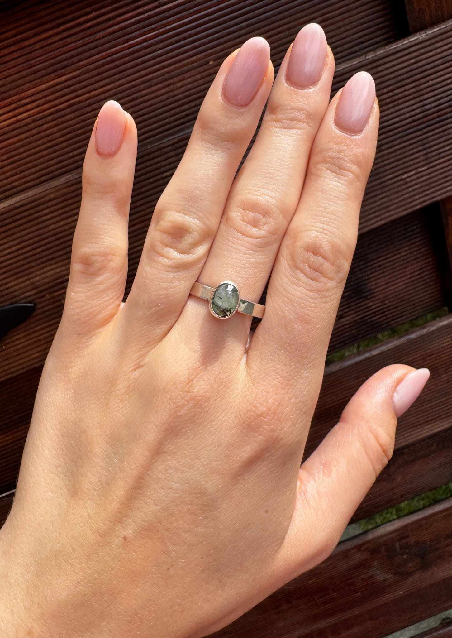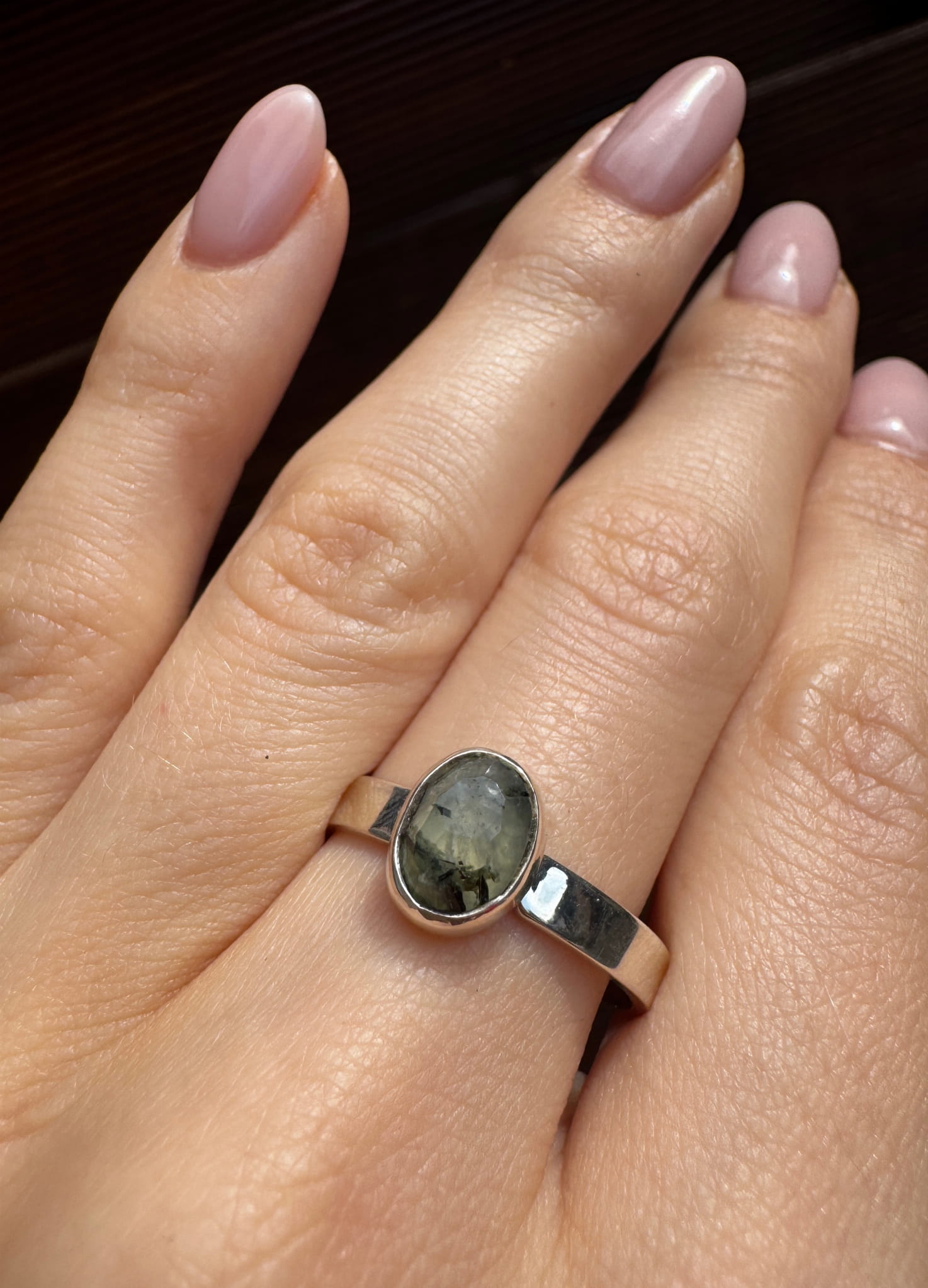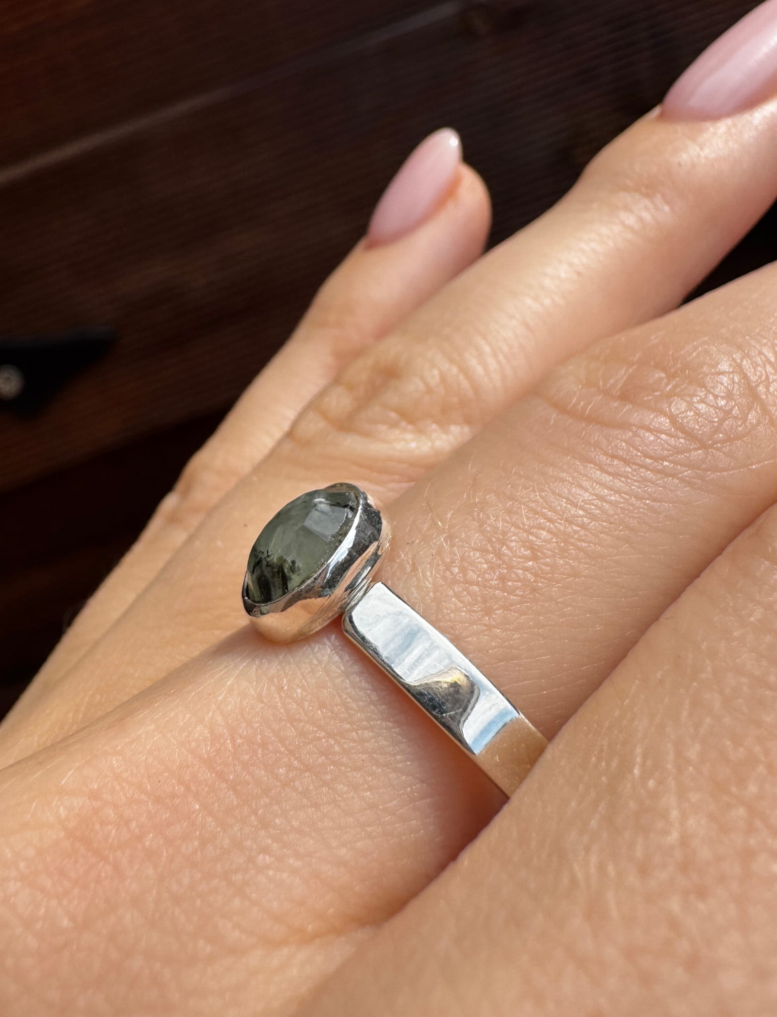 Ręcznie wykonany pierścionek z zielonego fasetowanego prehnitu i srebra pr.925