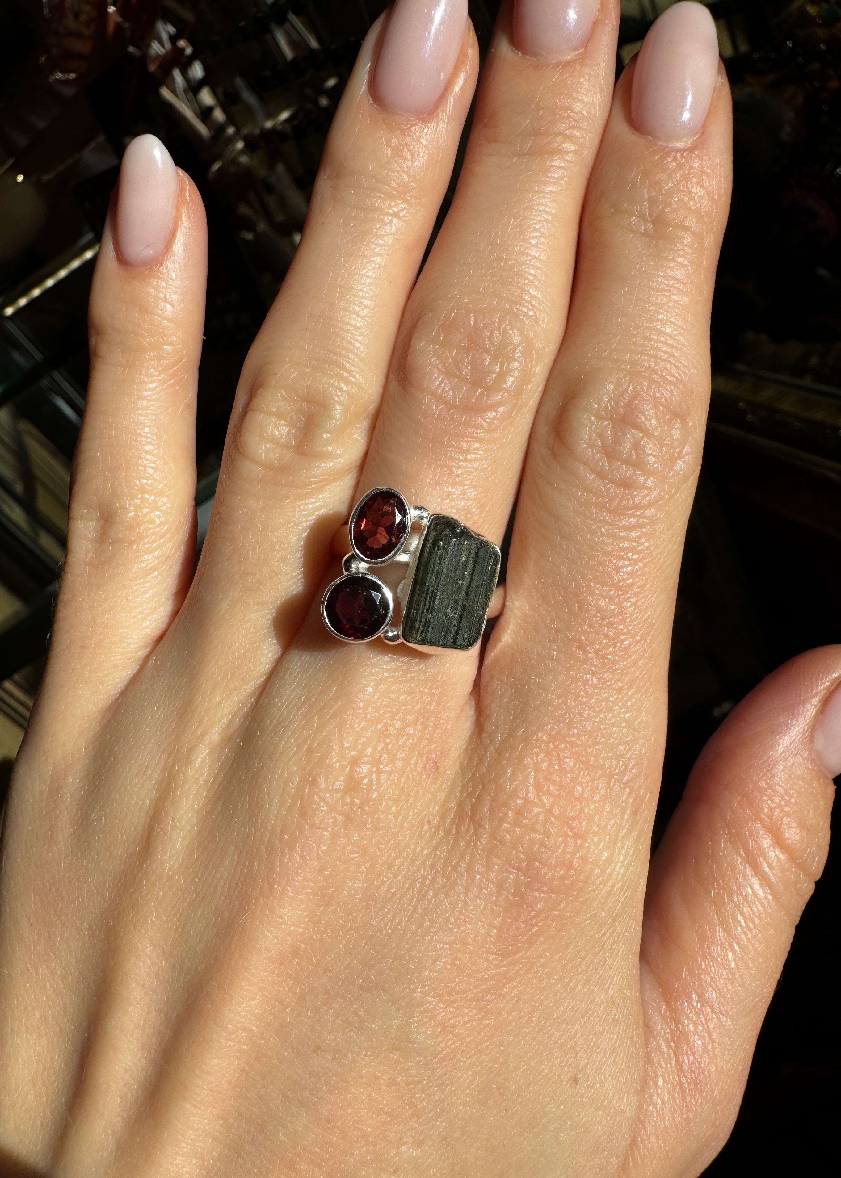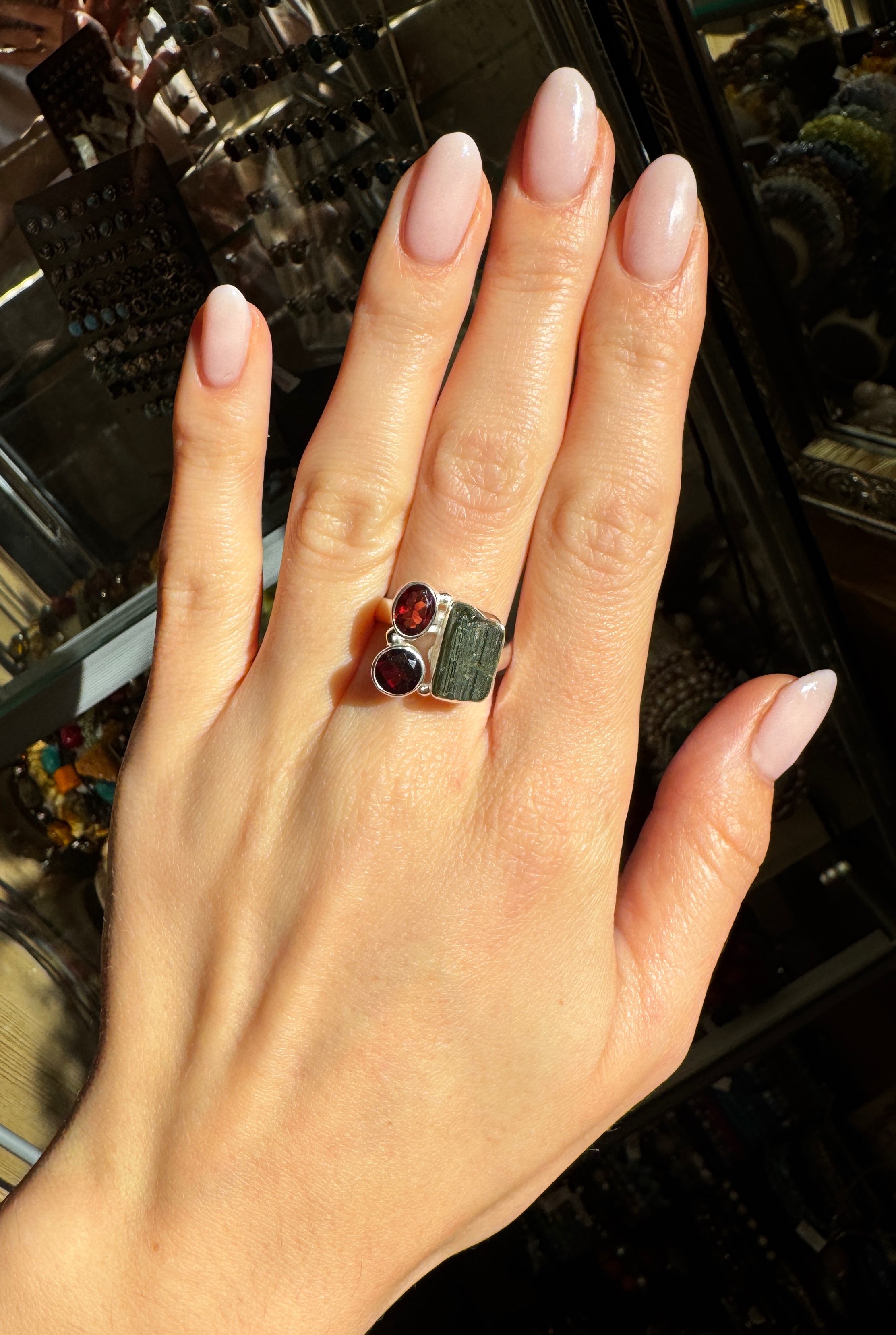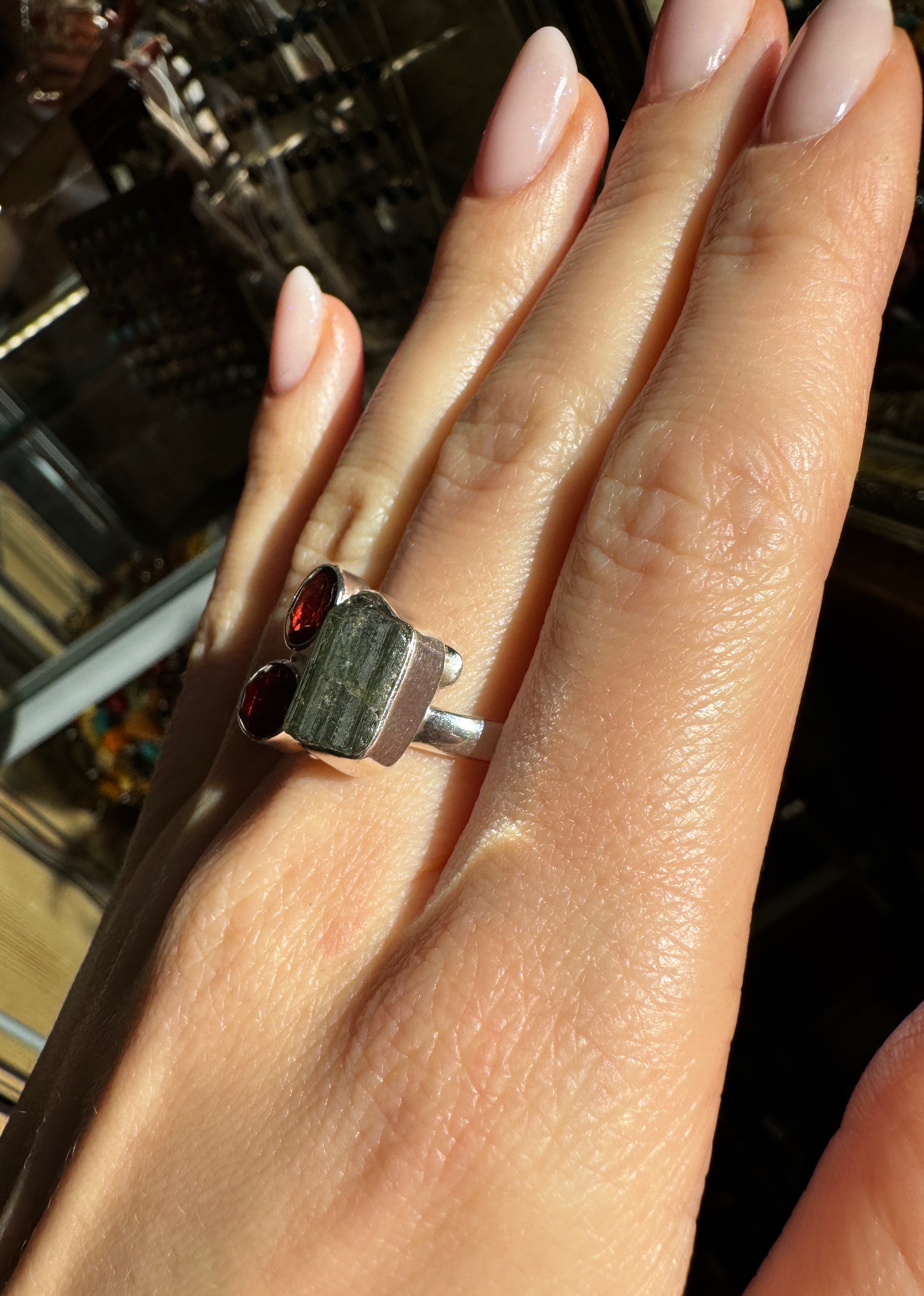 Ręcznie wykonany pierścionek z surowego zielonego turmalinu i fasetowanych granatów  i srebra pr.925