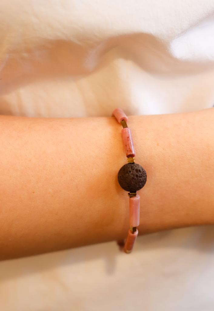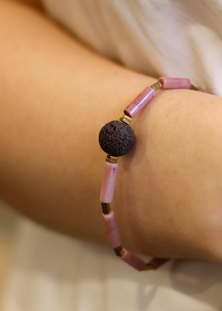 Bransoletka Rodonit z Kolekcji Aromaterapeutycznej wykonana jest z brązowej lawy wulkanicznej, złotego hematytu oraz jaspisu rodonitu.